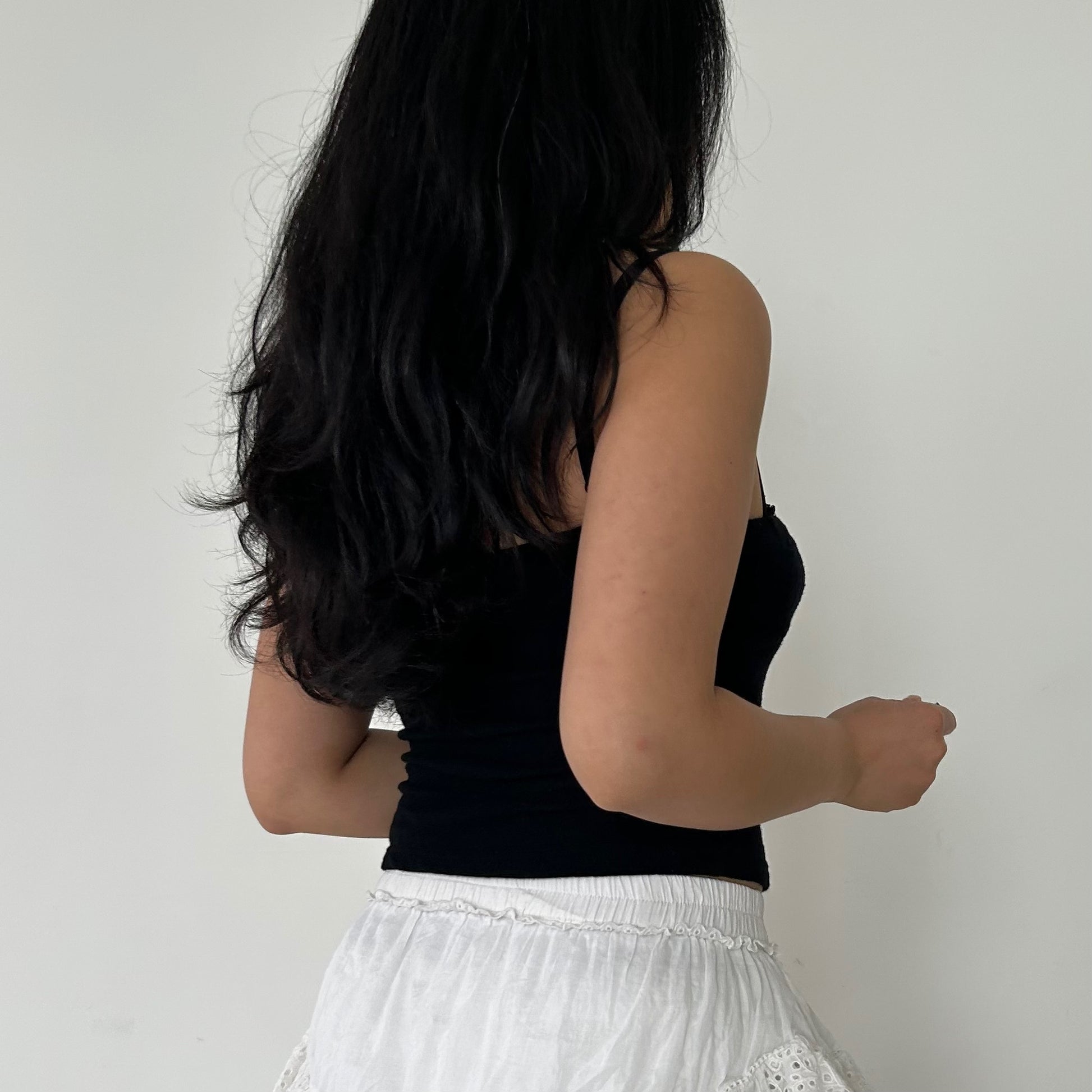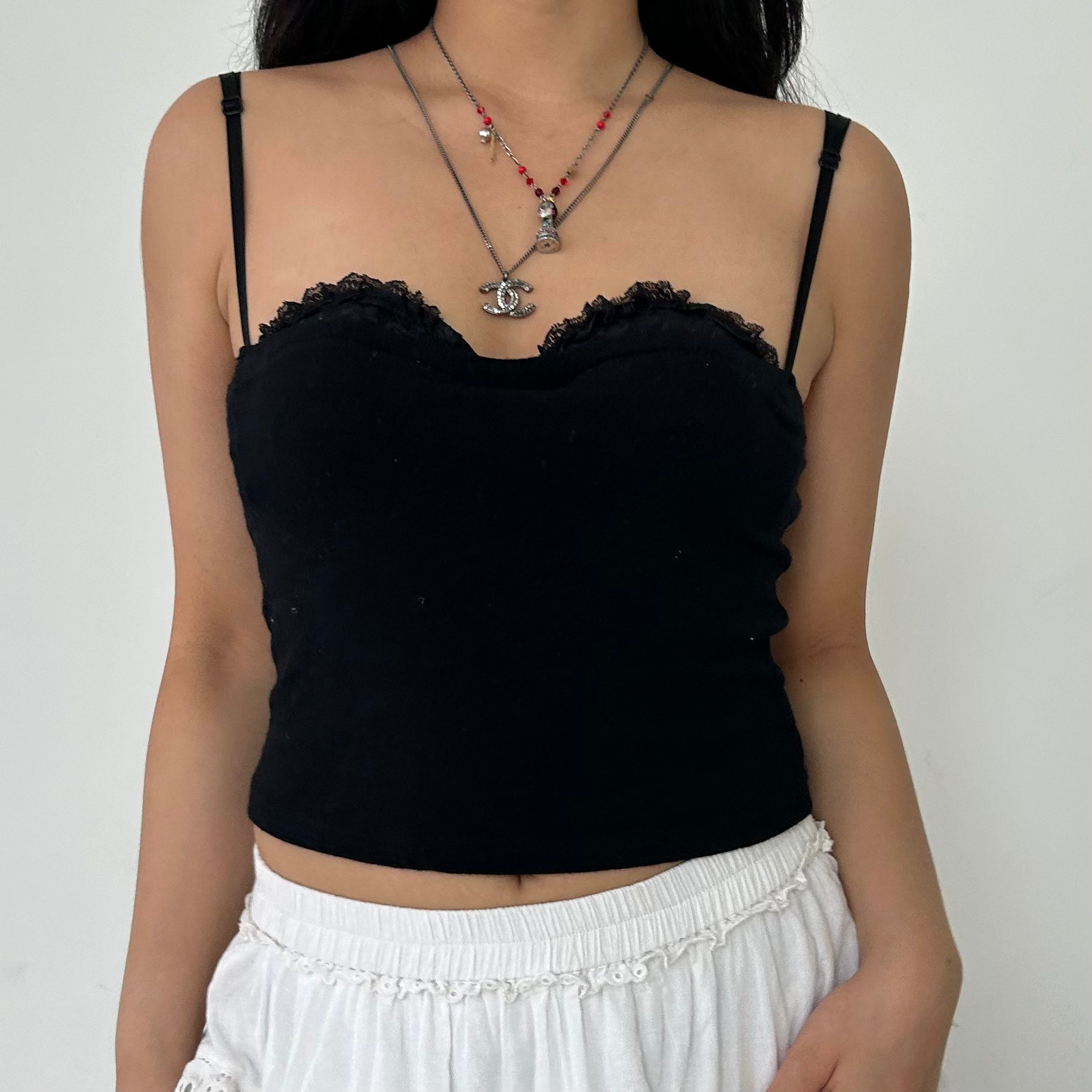 - Details: Black lace trim exposed built in bra cups; adjustable straps
