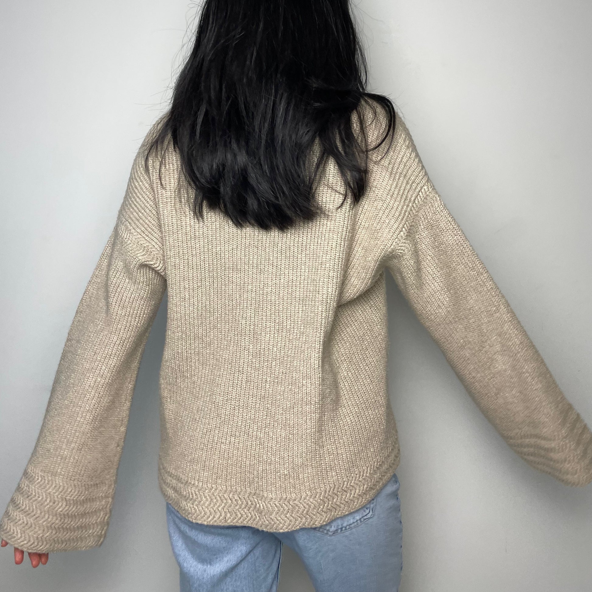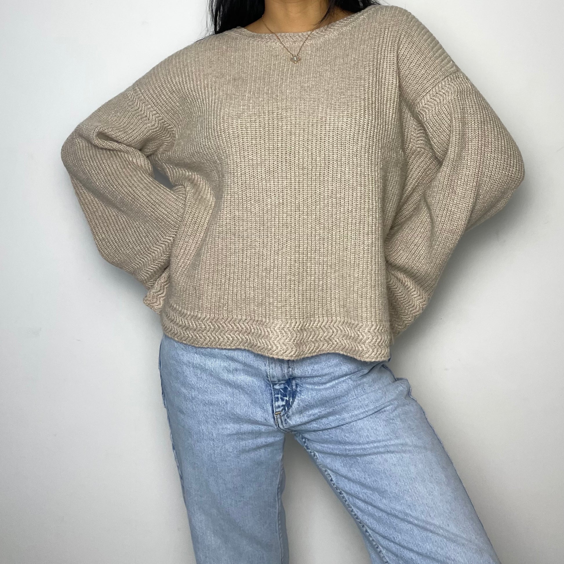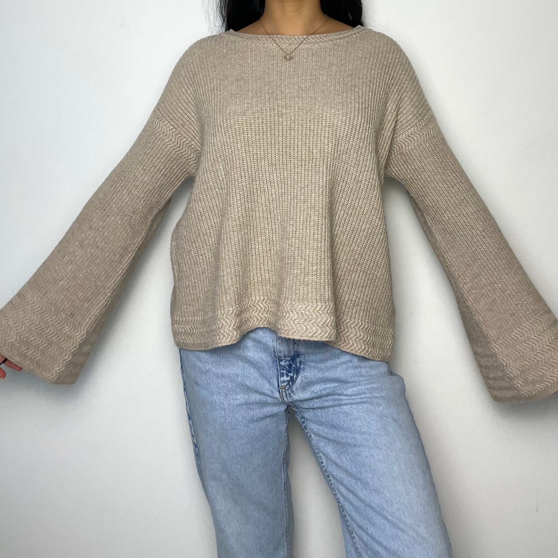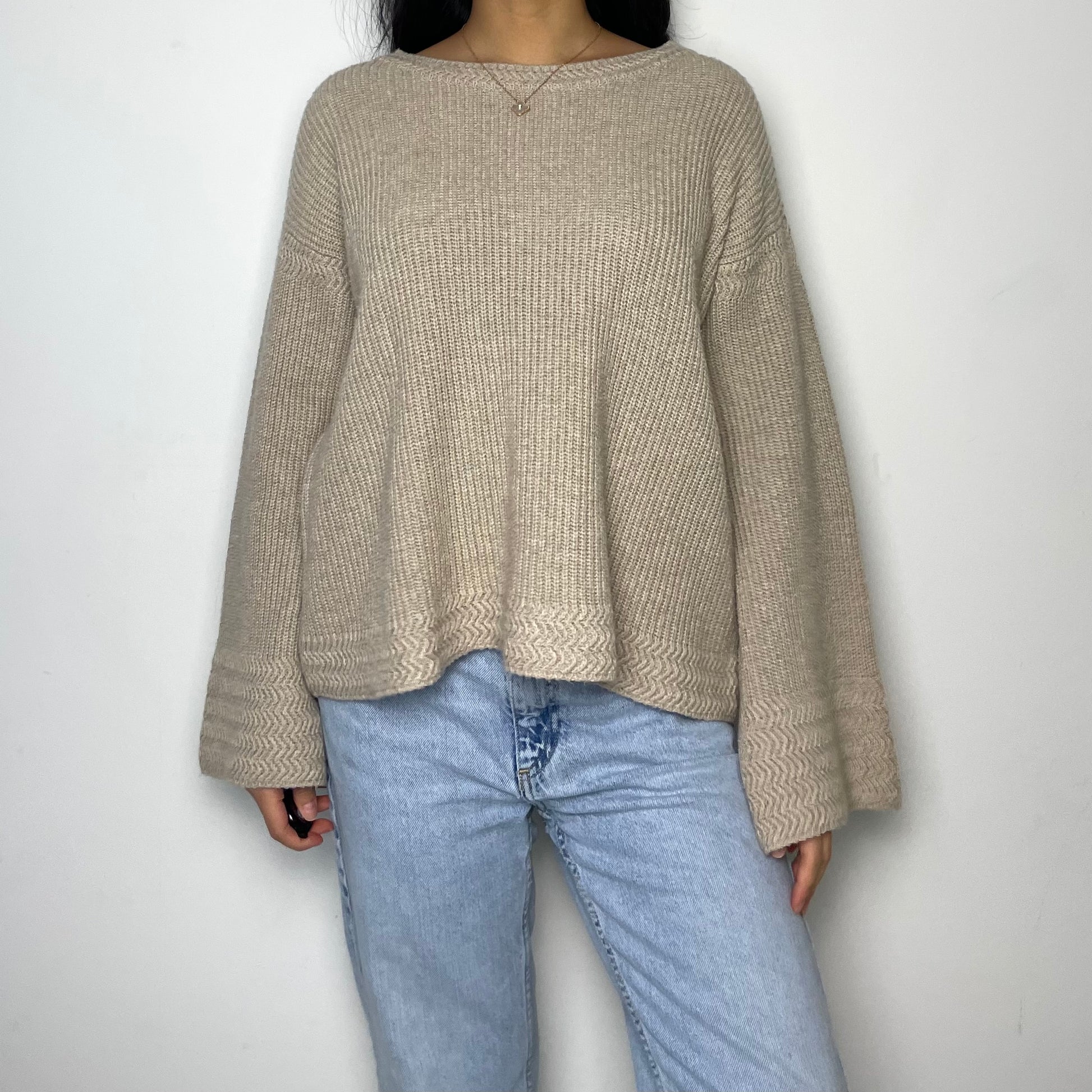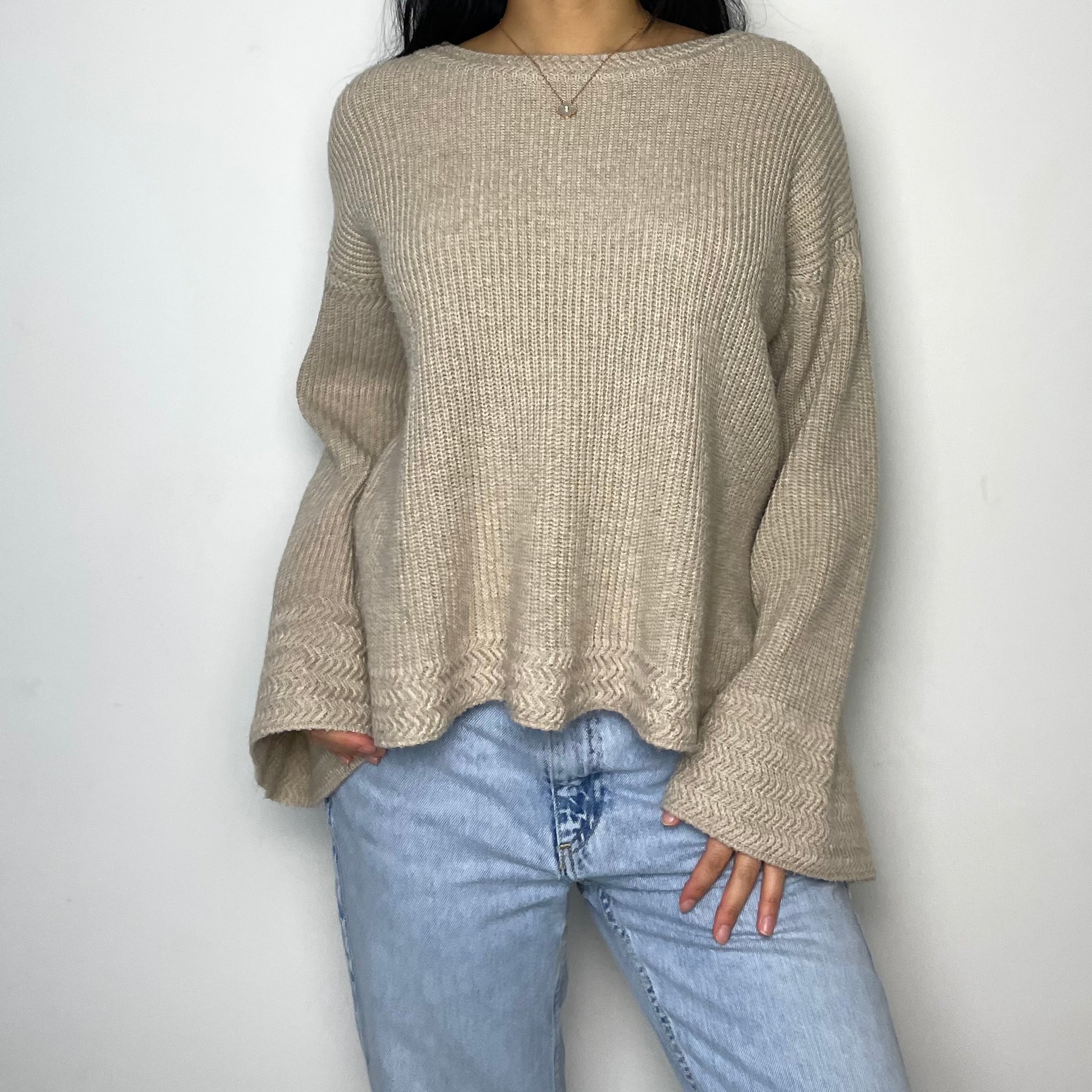 - Details: Bell Sleeves; oatmeal coloured knit jumper; relaxed fit