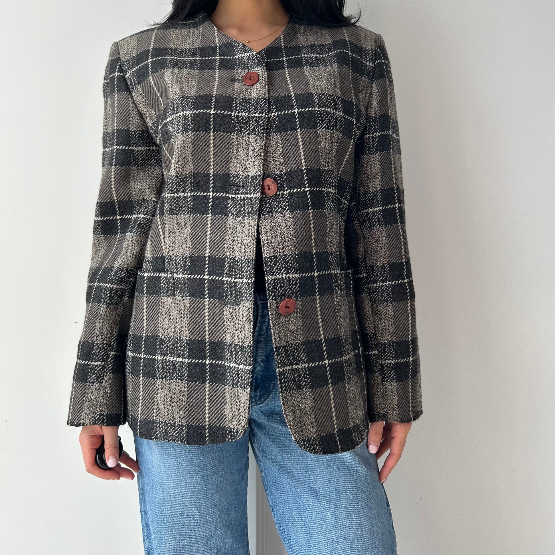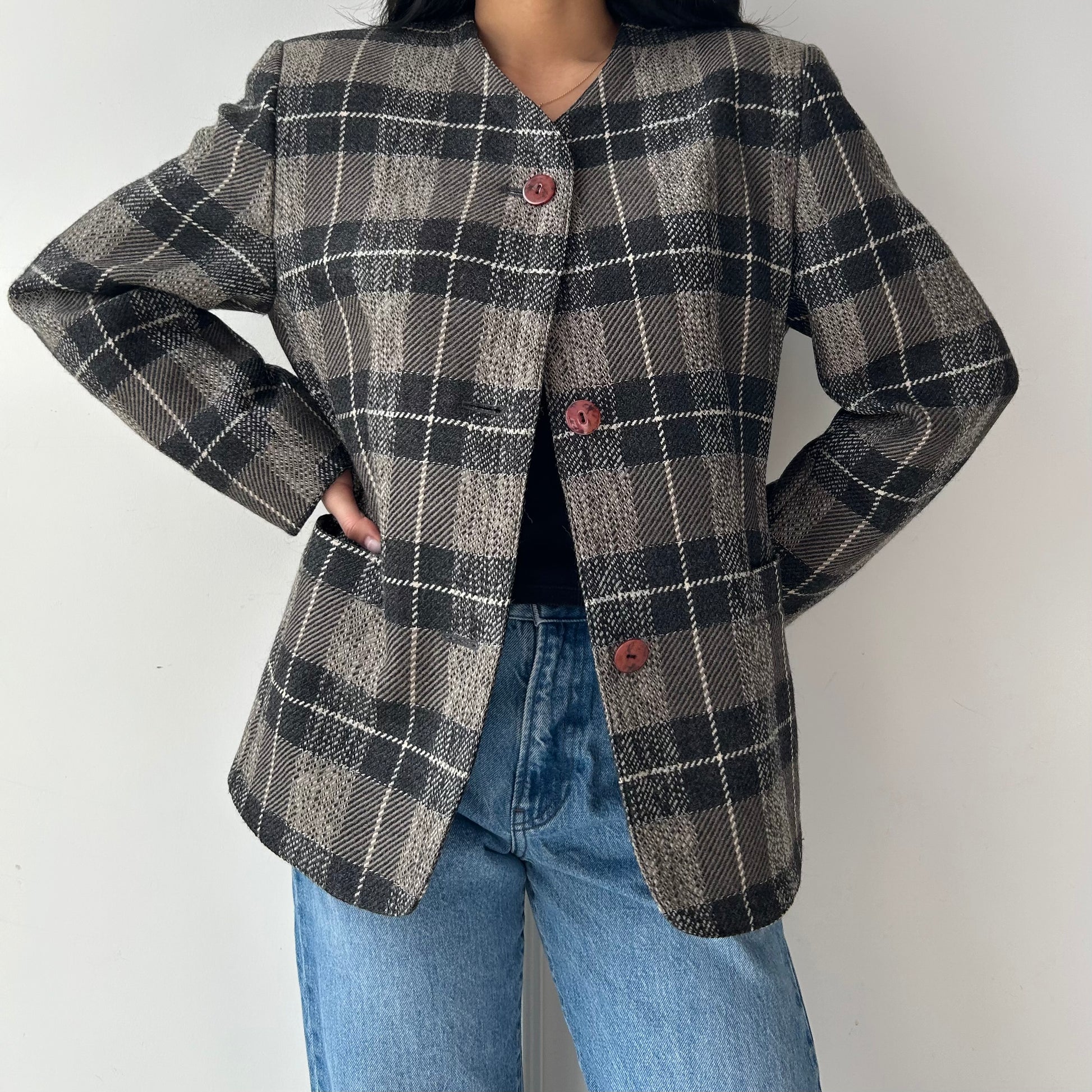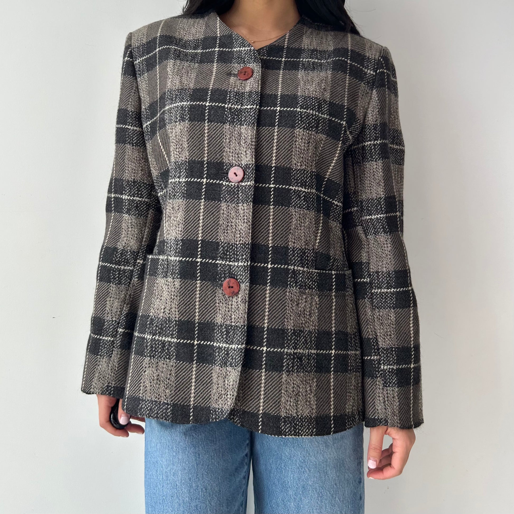 - Details: Vintage from the 1990s; heritage wool plaid in muted earth tones; collarless V-neck with three-button closure; structured shoulders and tailored silhouette; built in shoulder pads