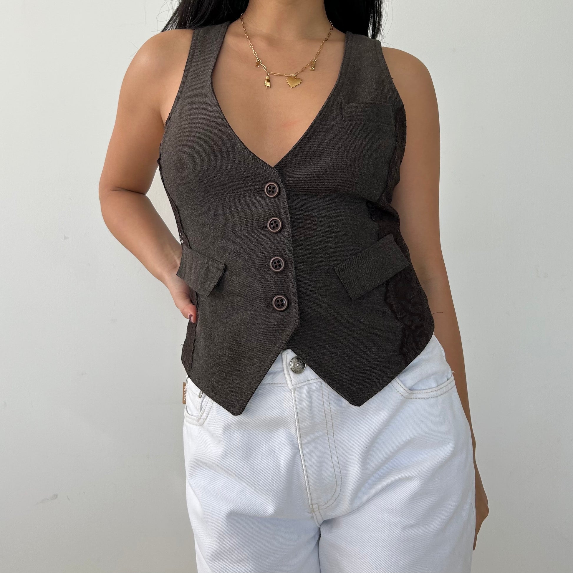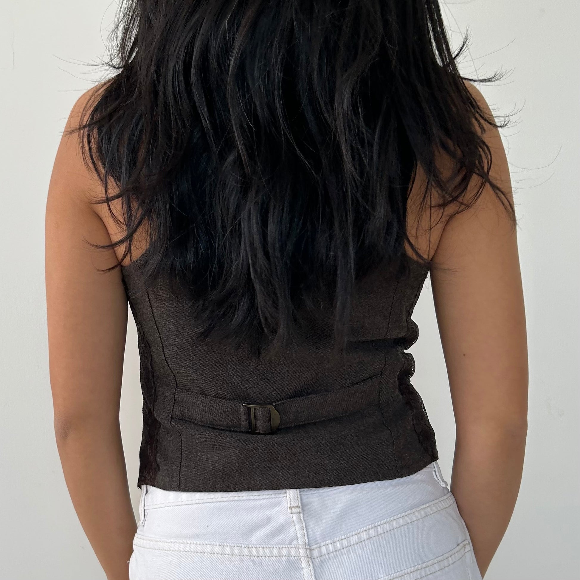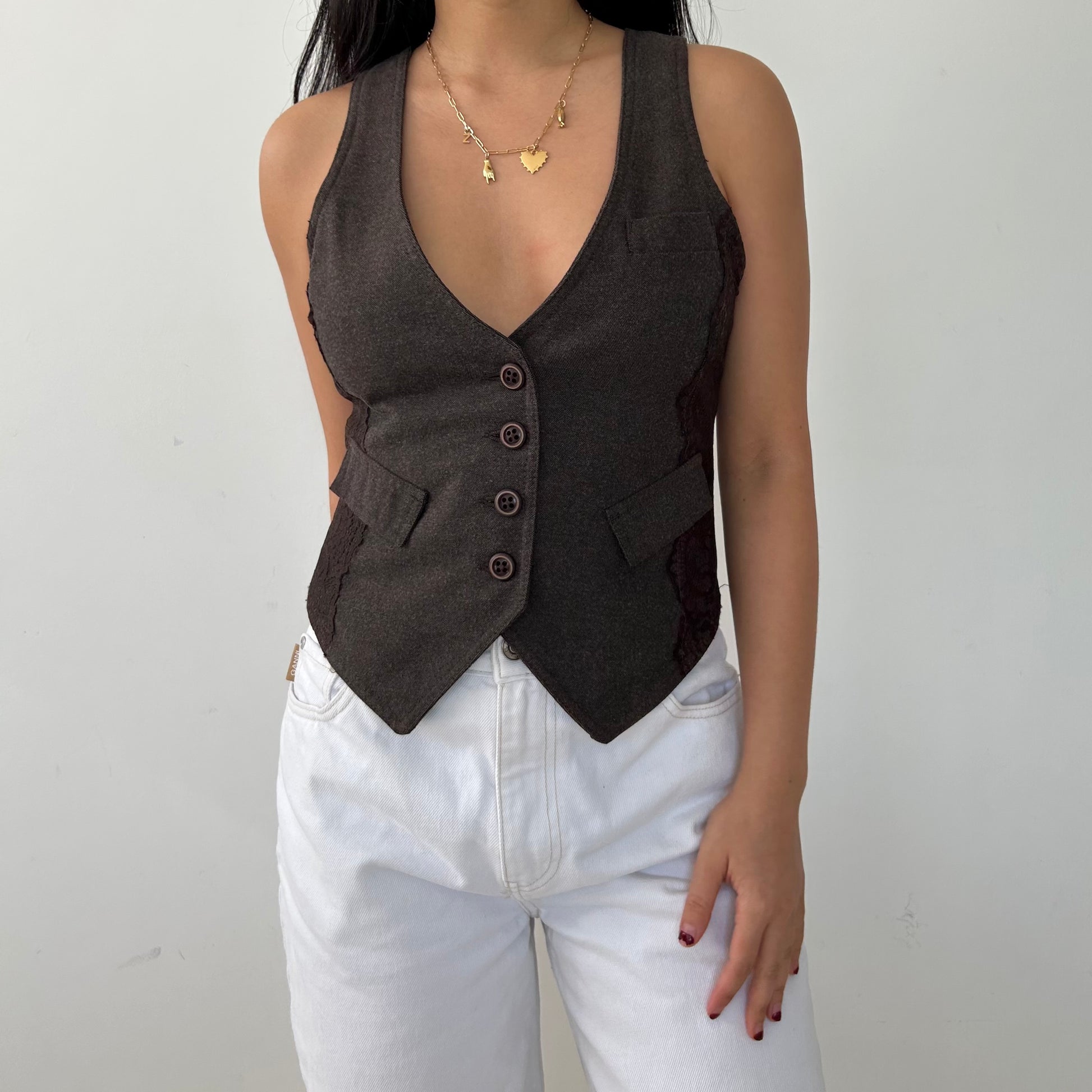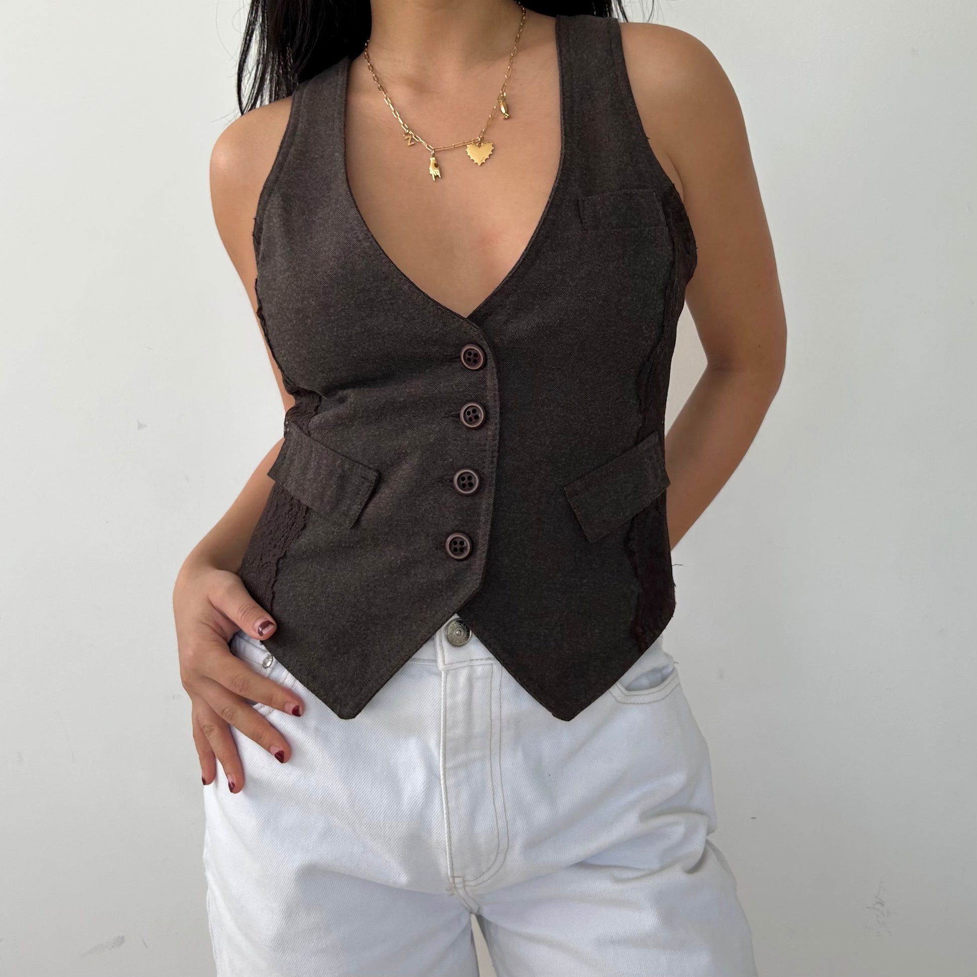 • Details: Brown vest top; halter neck; button closure; flap pockets; full twill lining