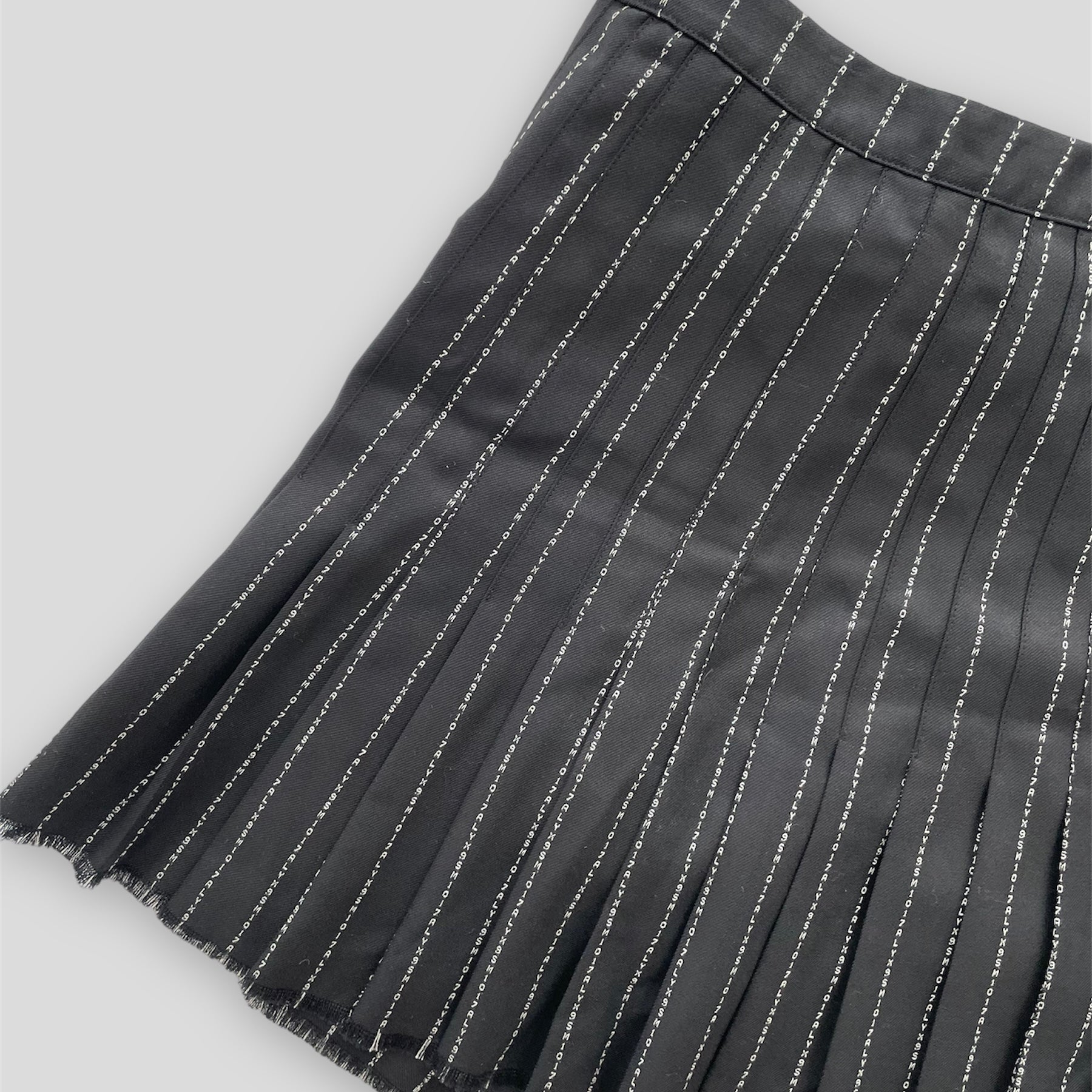 - Details: Comes with a matching top (sold separately)! Black and white pinstripe pattern made out of logo text going down vertically; from the Fall 2019 collection