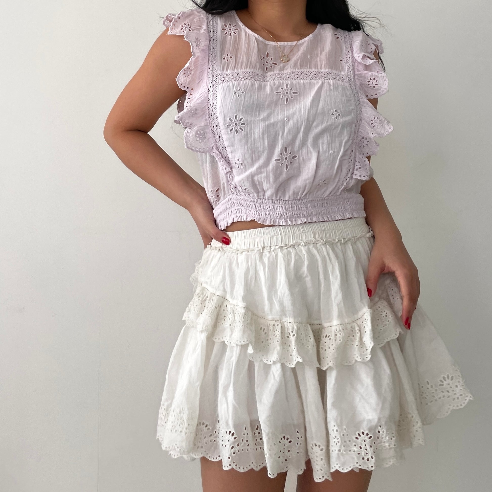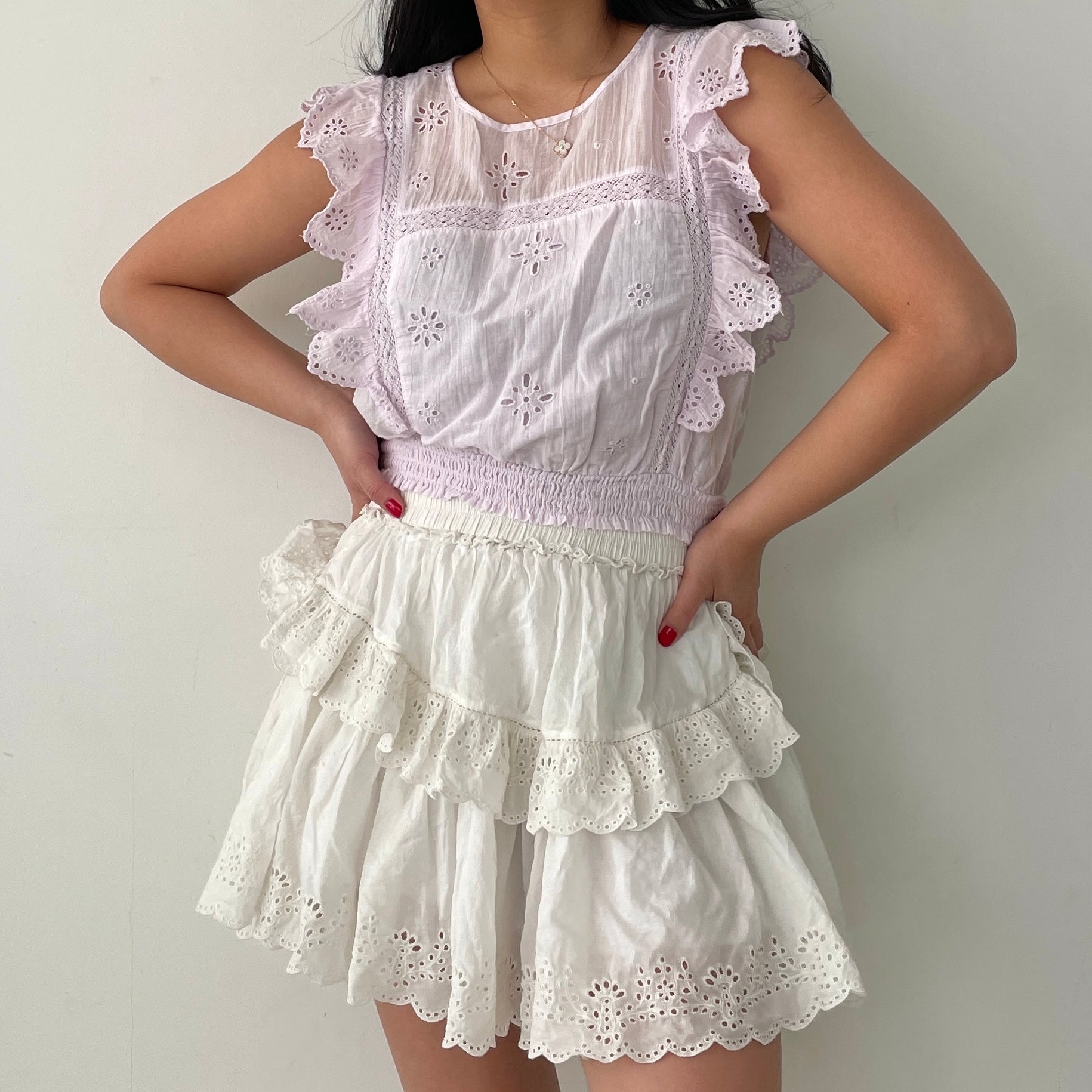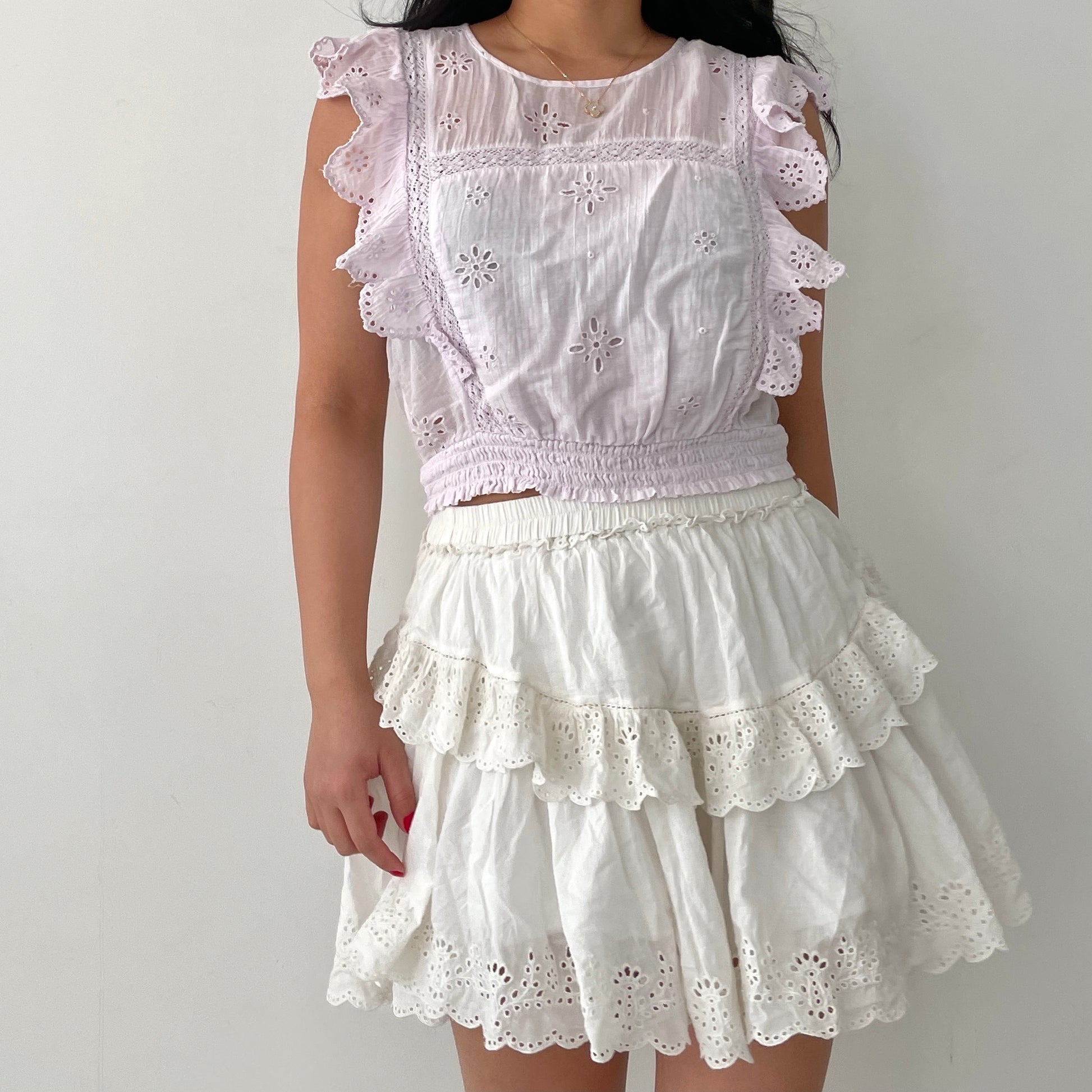 • Details: The sweetest sleeveless cotton ruffle blouse with a tassel tie back and broderie anglaise details; very reminiscent of LoveShackFancy styles!