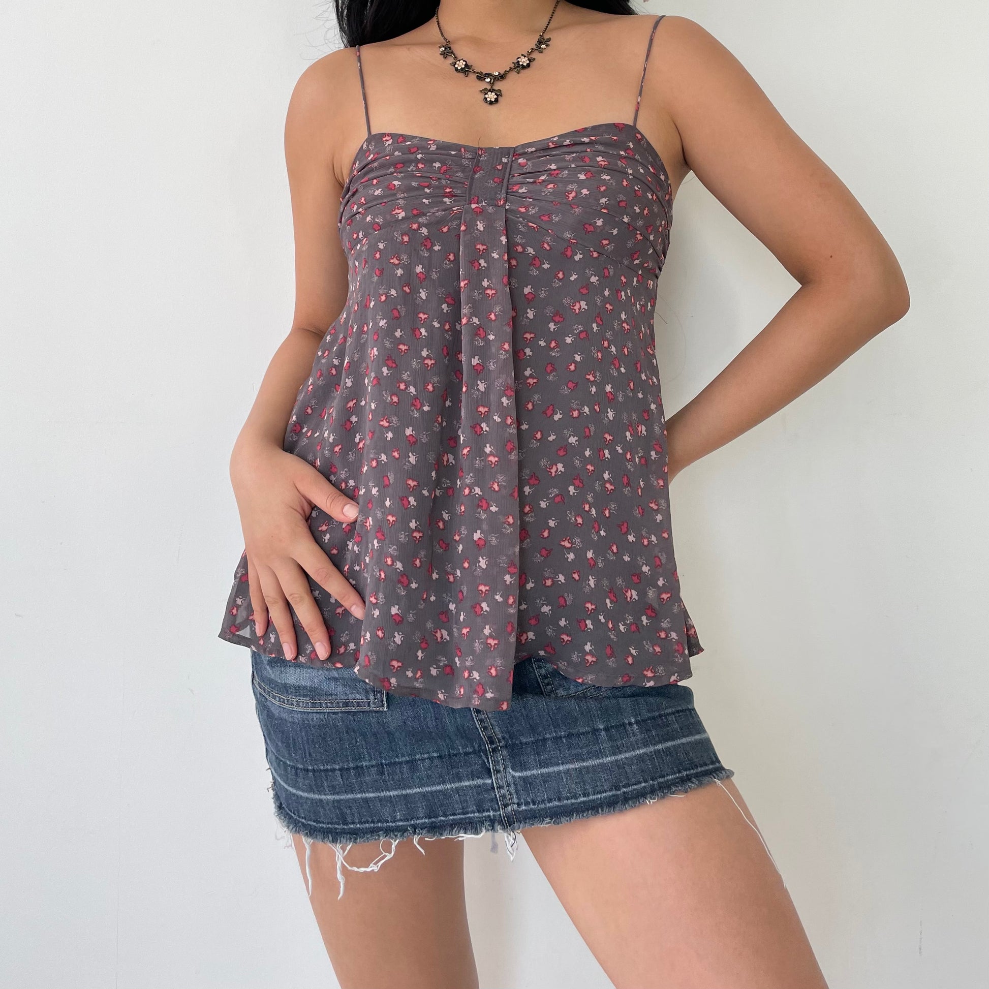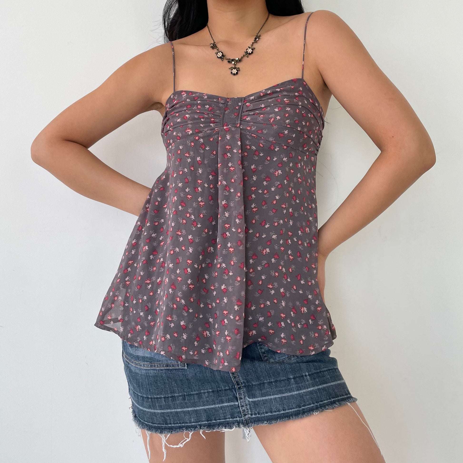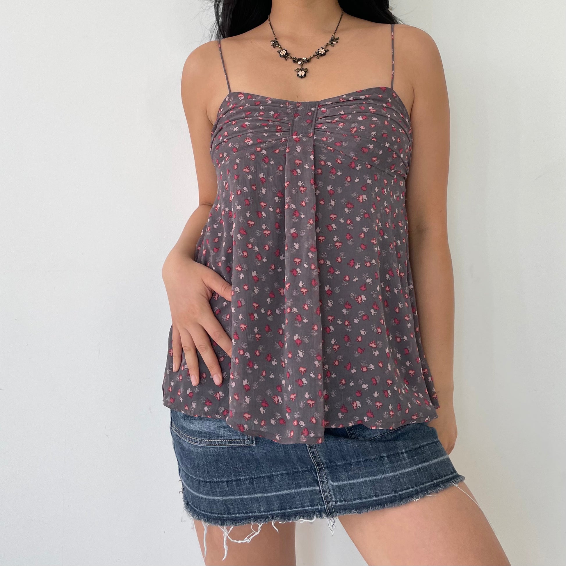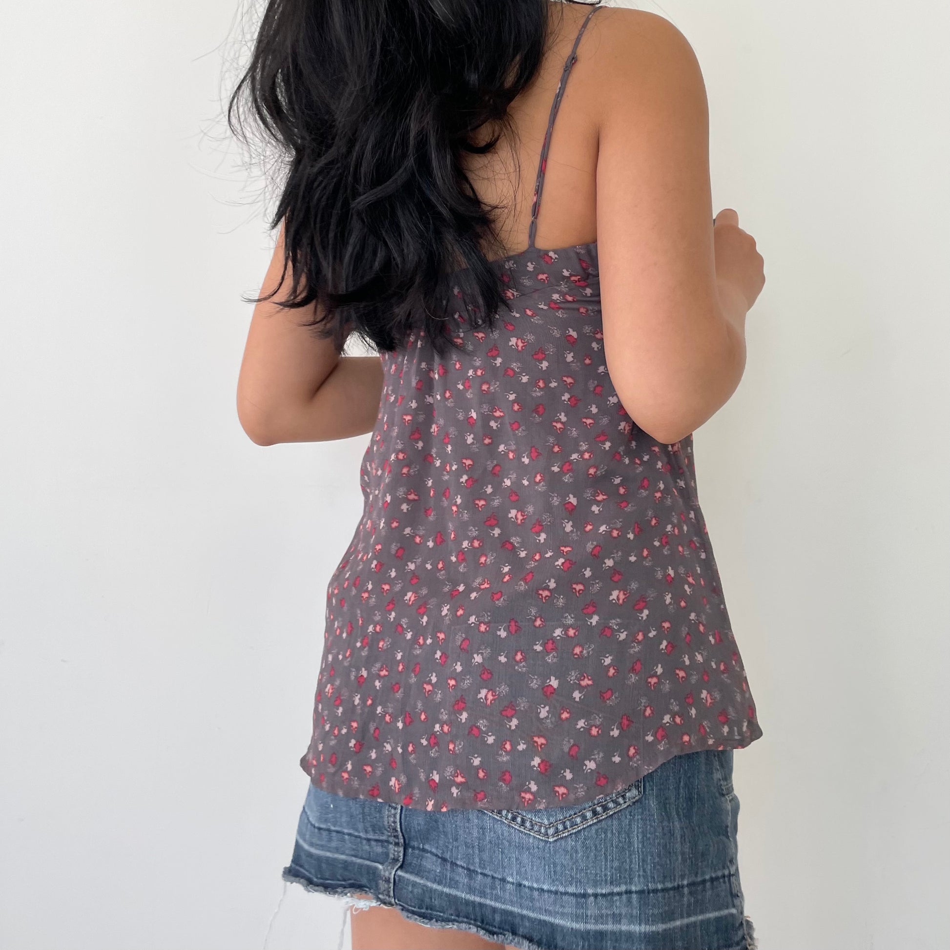 • Details: Mauve grey tank top with floral details; adjustable straps; double lined; tighter on the bust, flowy at the bottom