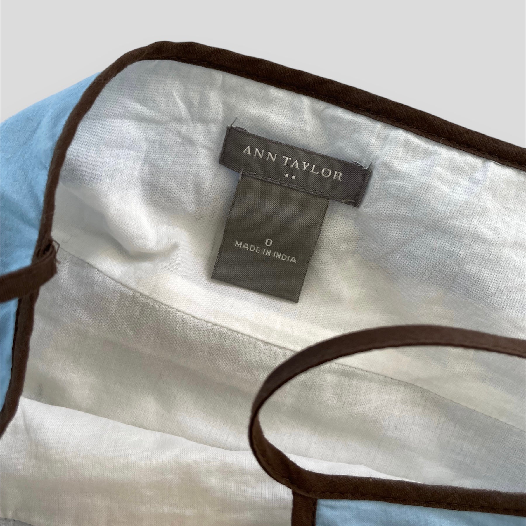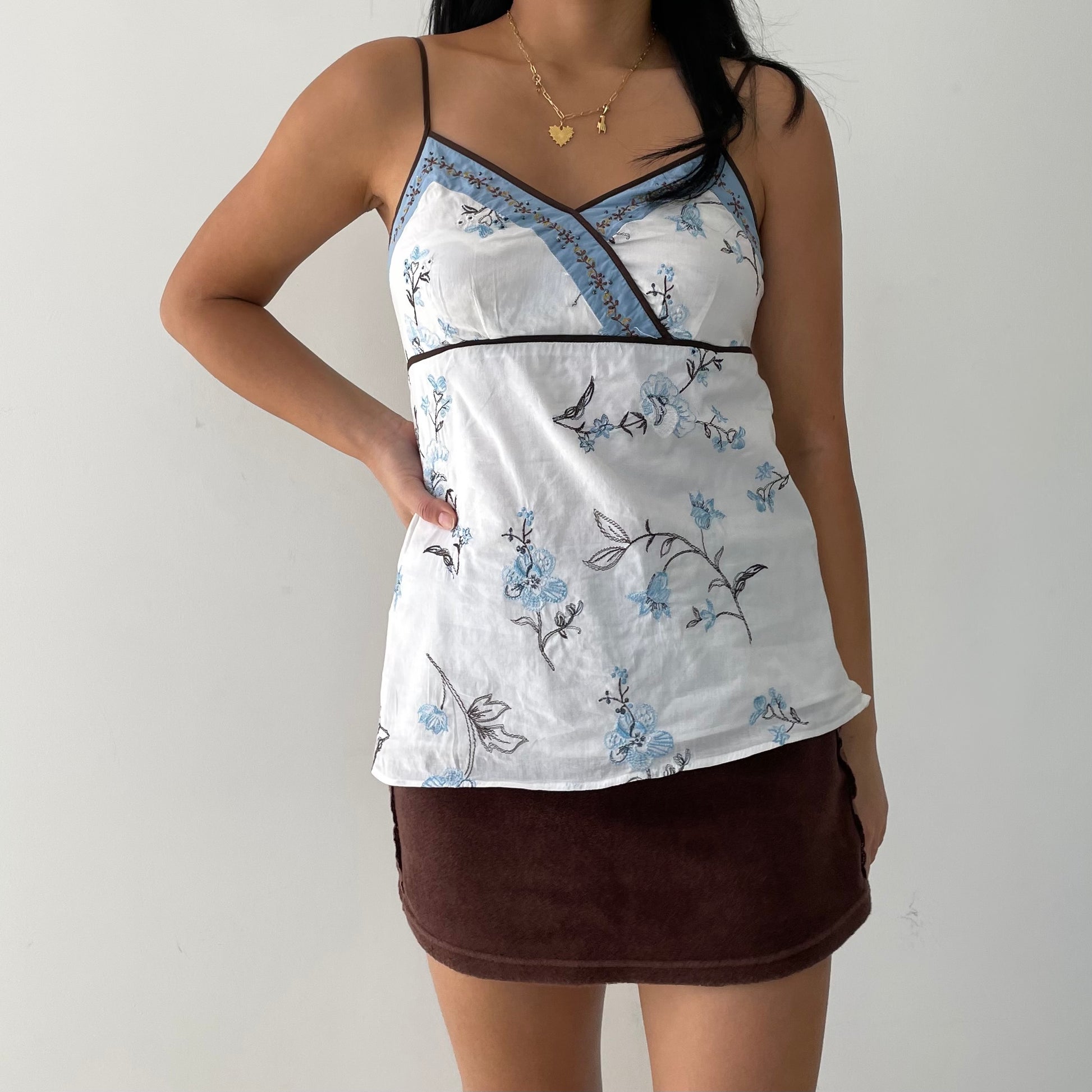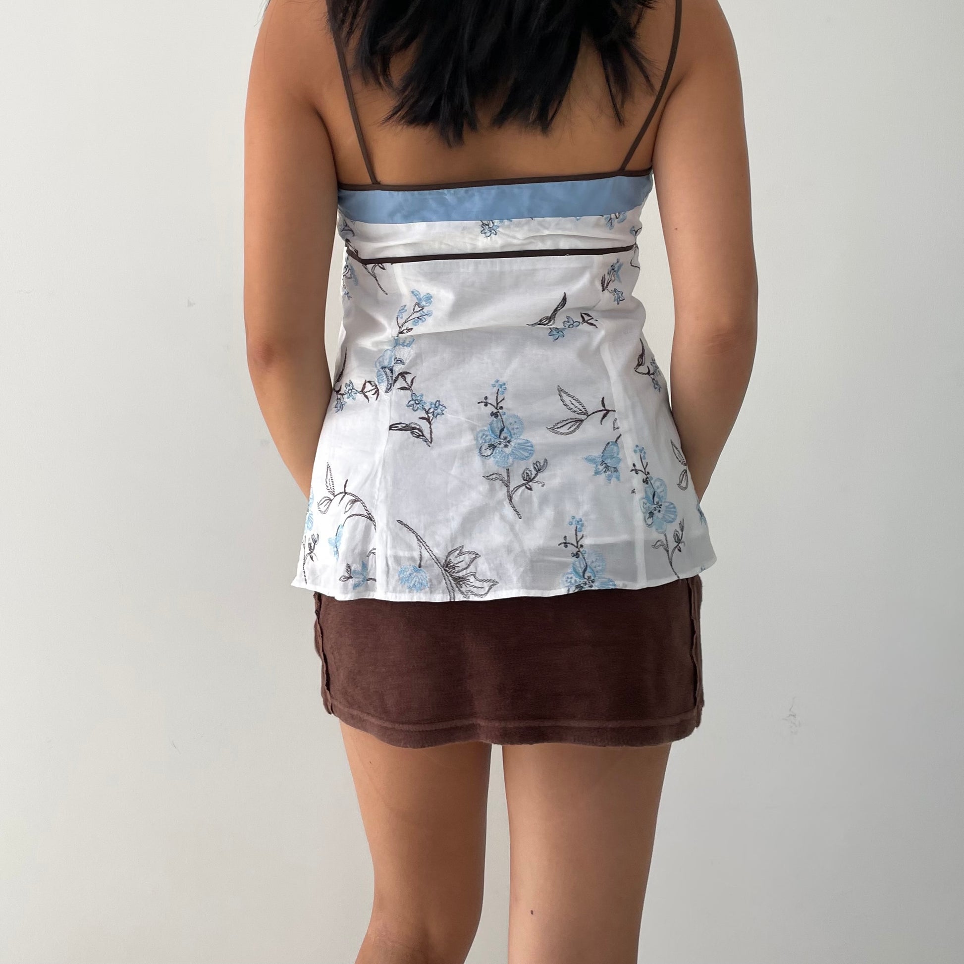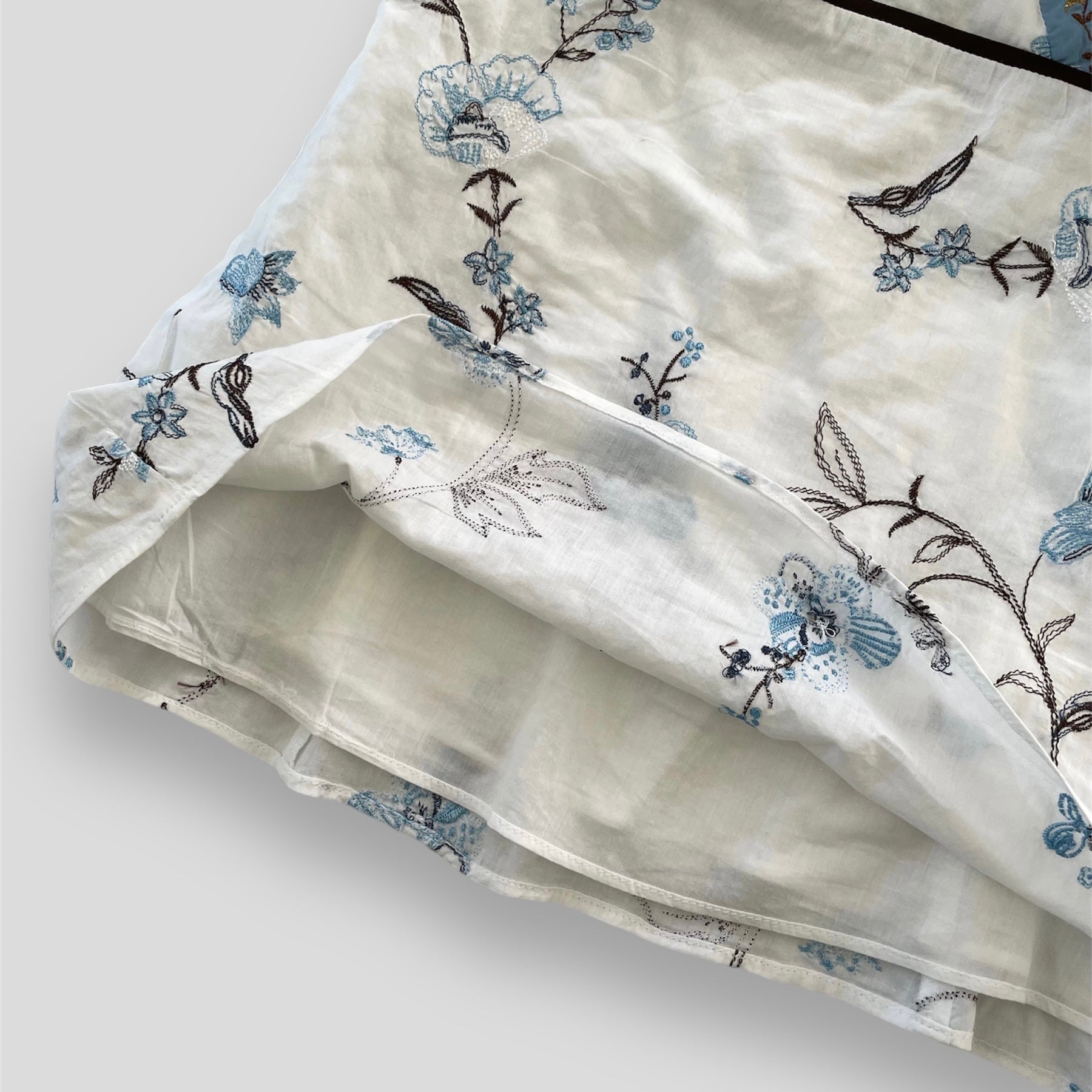 • Details: Concealed side zip; double lined; blue and brown floral embroidery