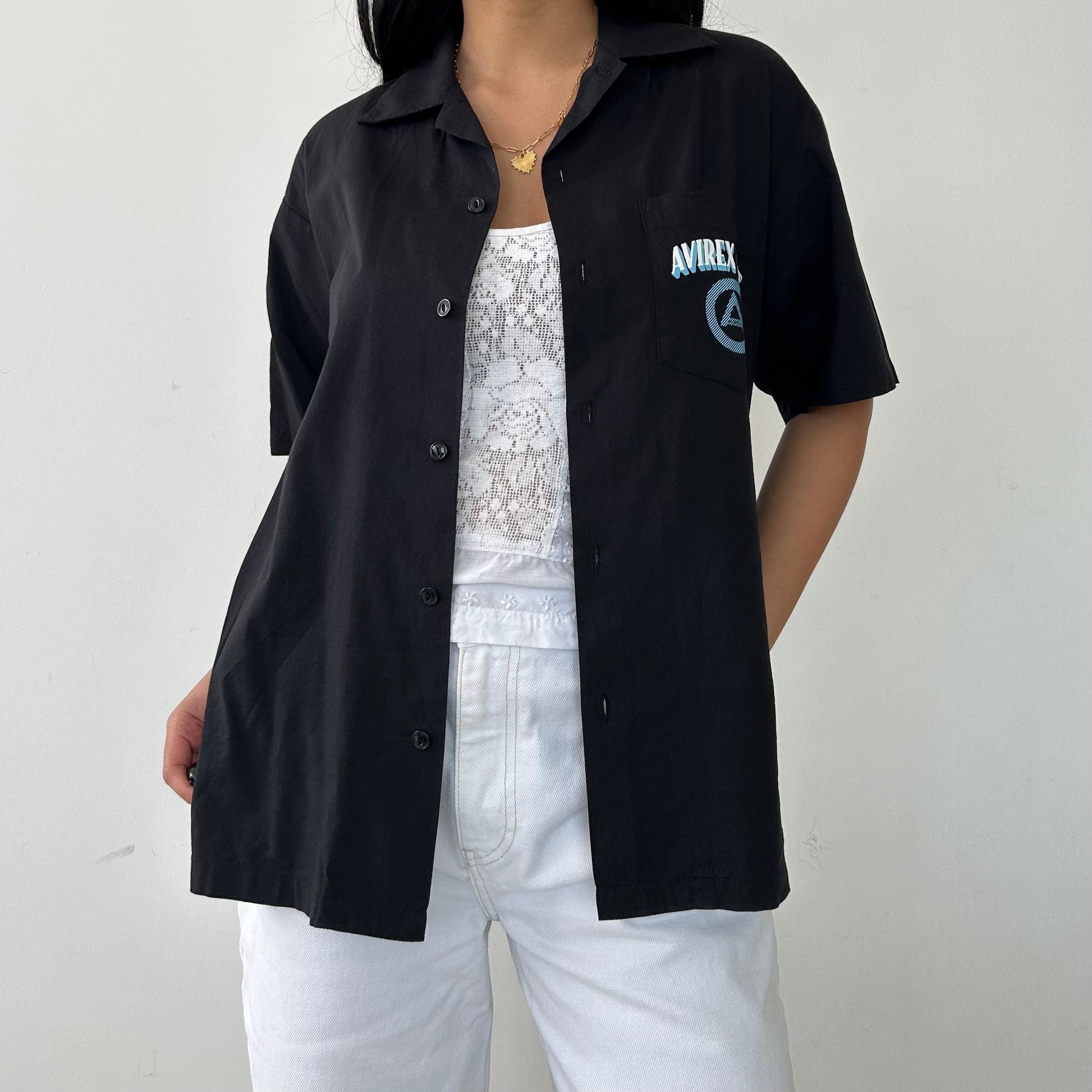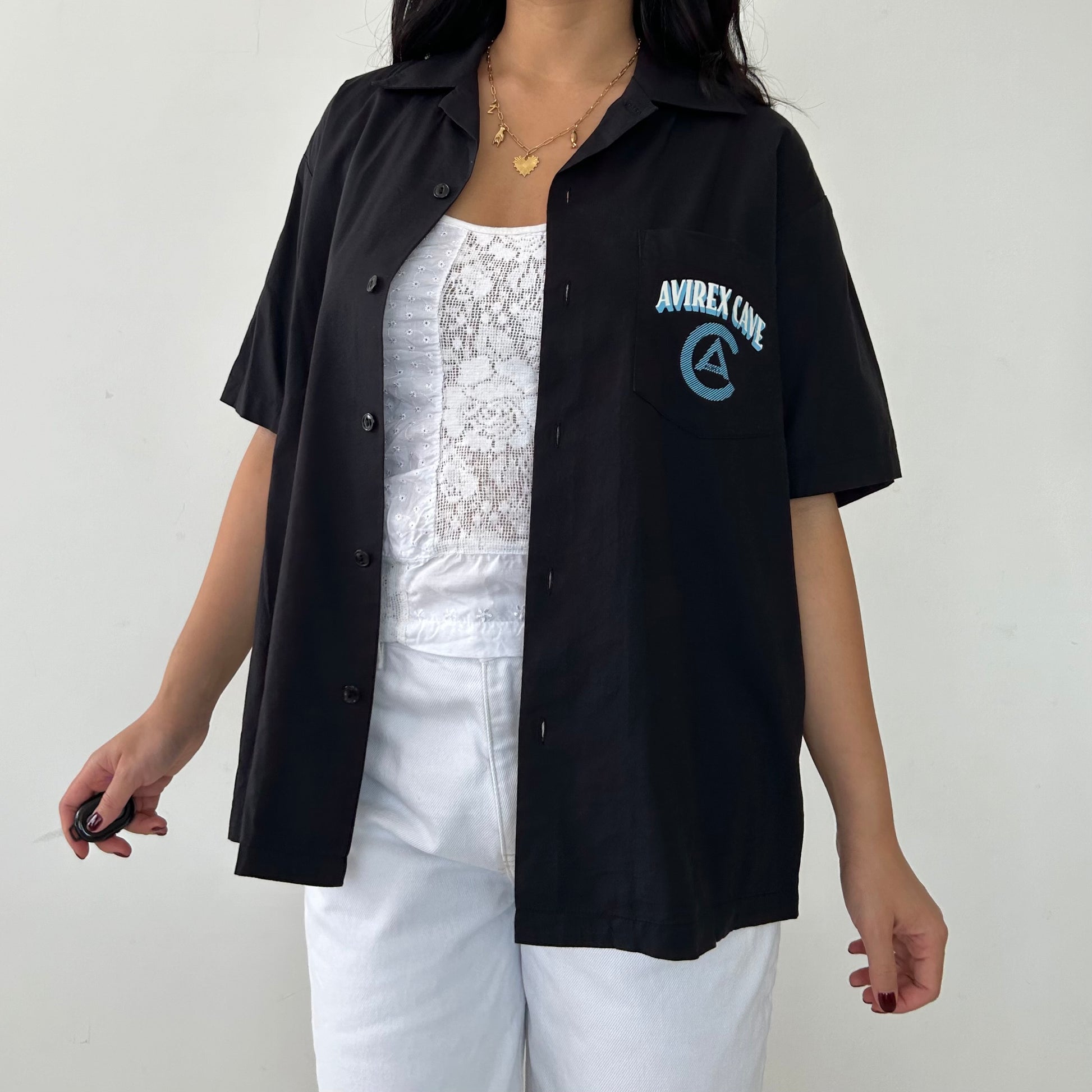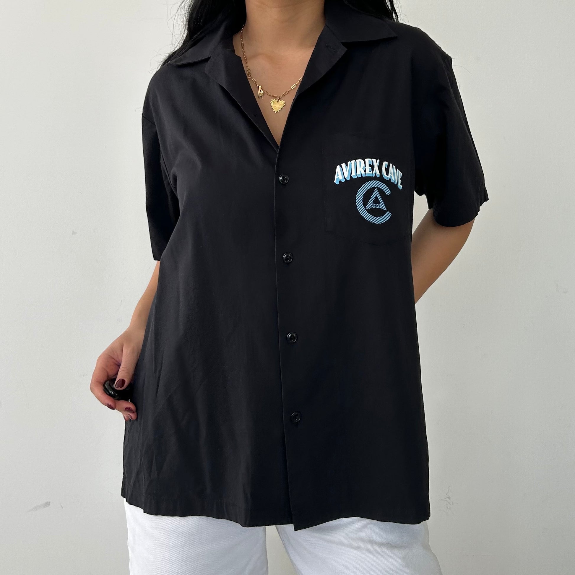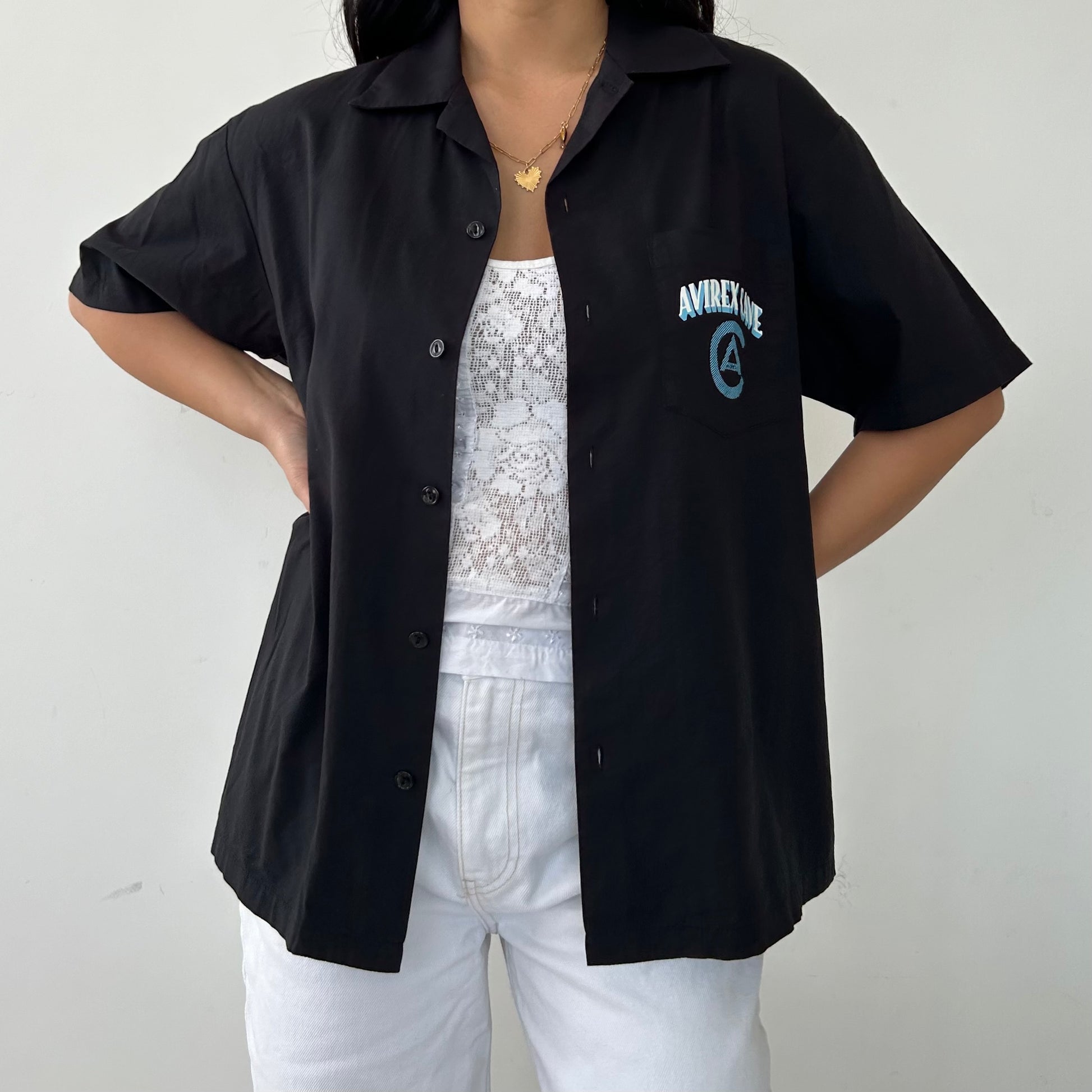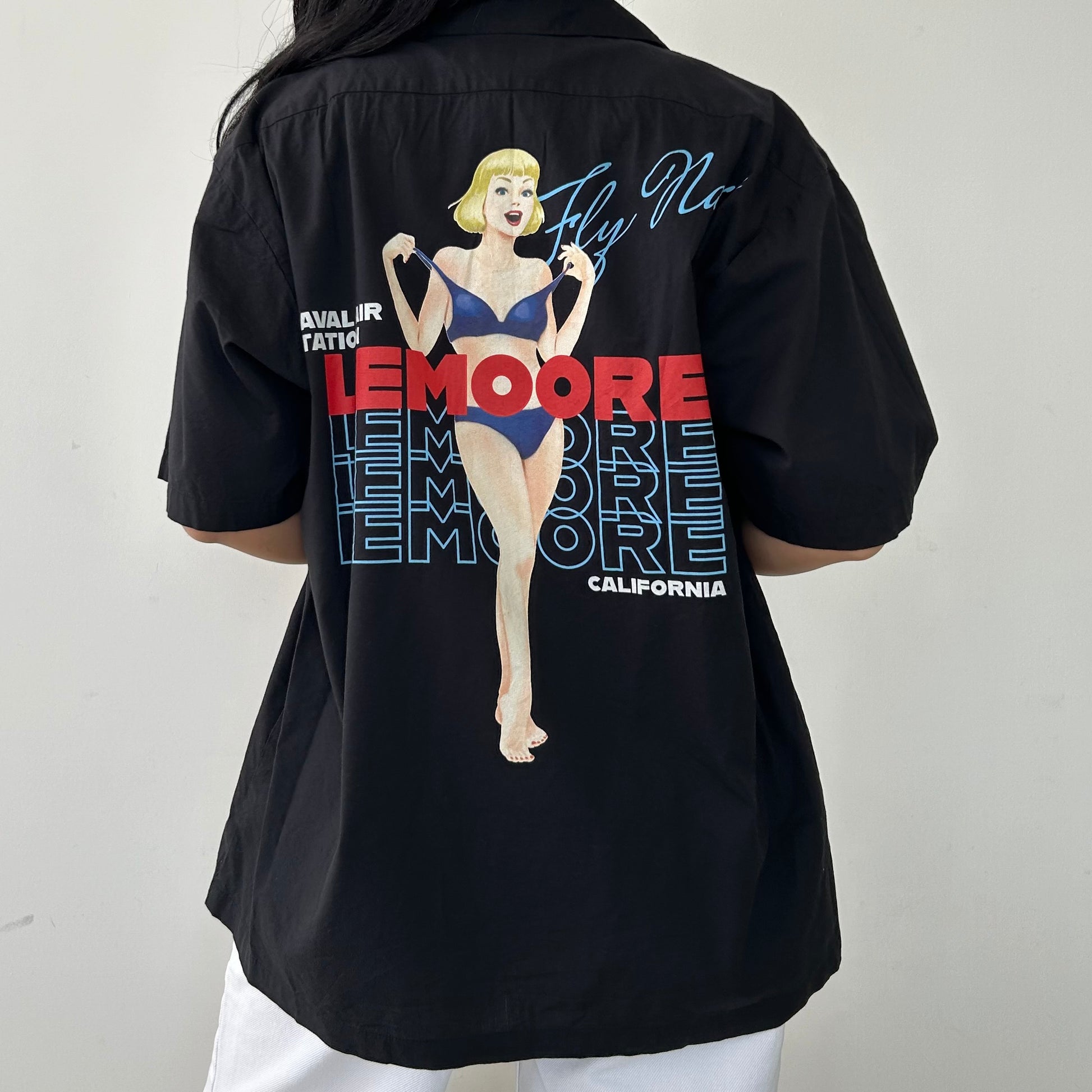 - Details: Graphic logo at the front pocket; button up short sleeve shirt; 'Naval Air Station Lemoore California' graphic at the back with a blonde woman in a bikini