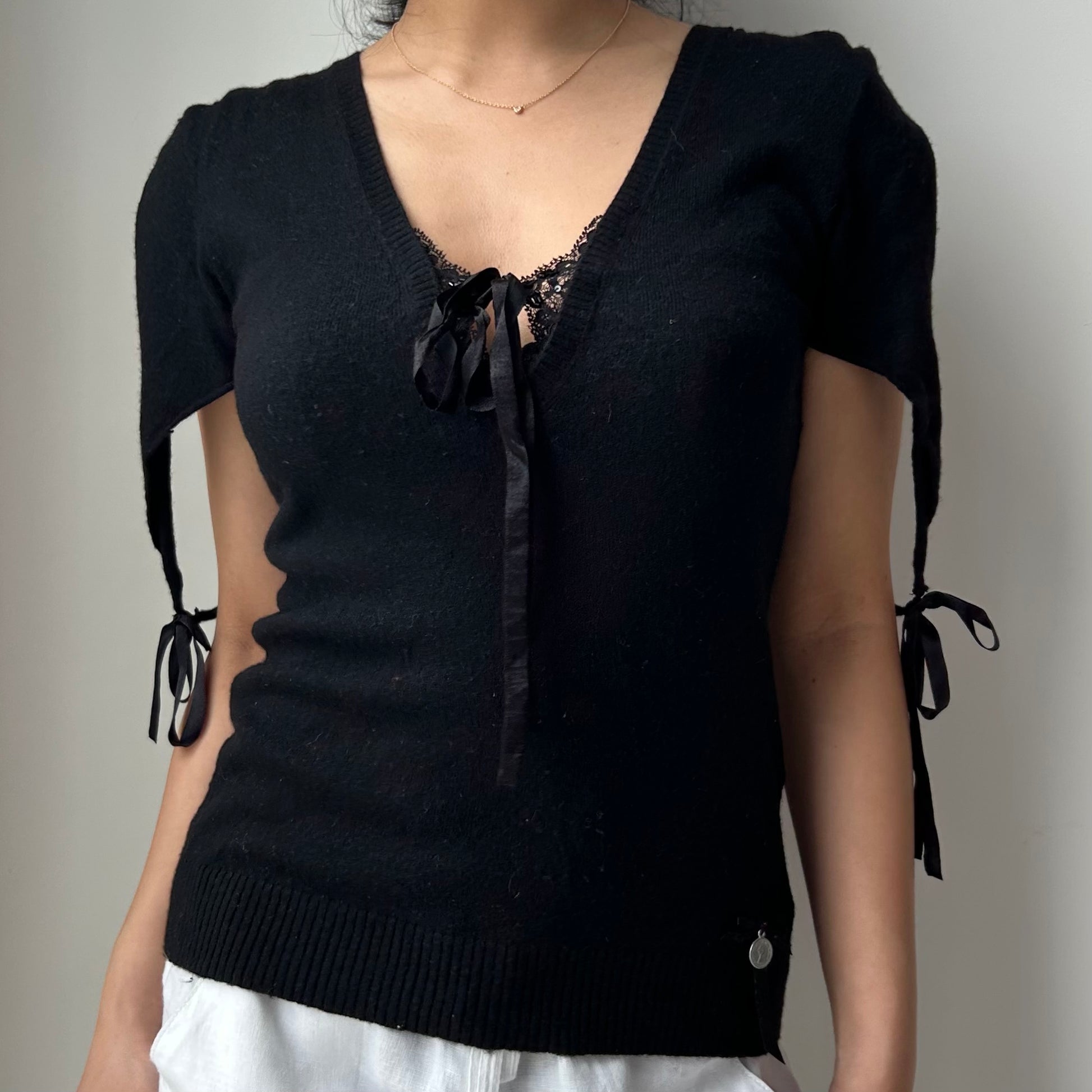 - Details: Black short sleeve knit top; v- neck with lace trim bust; coin embellishment at hem; tie sleeves