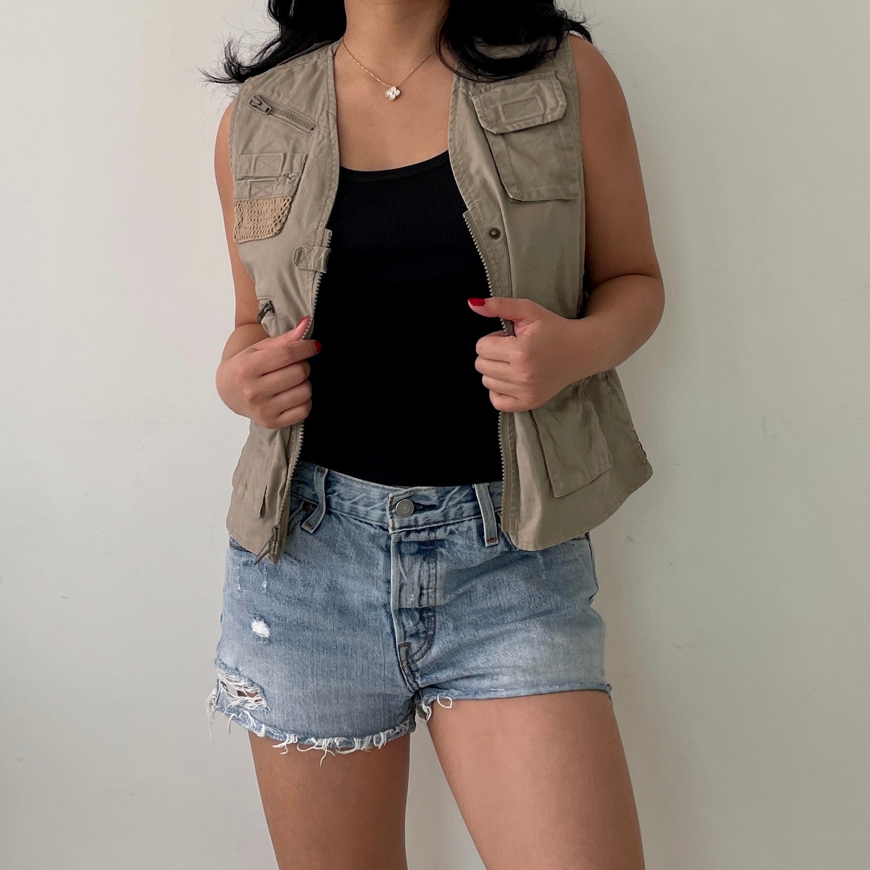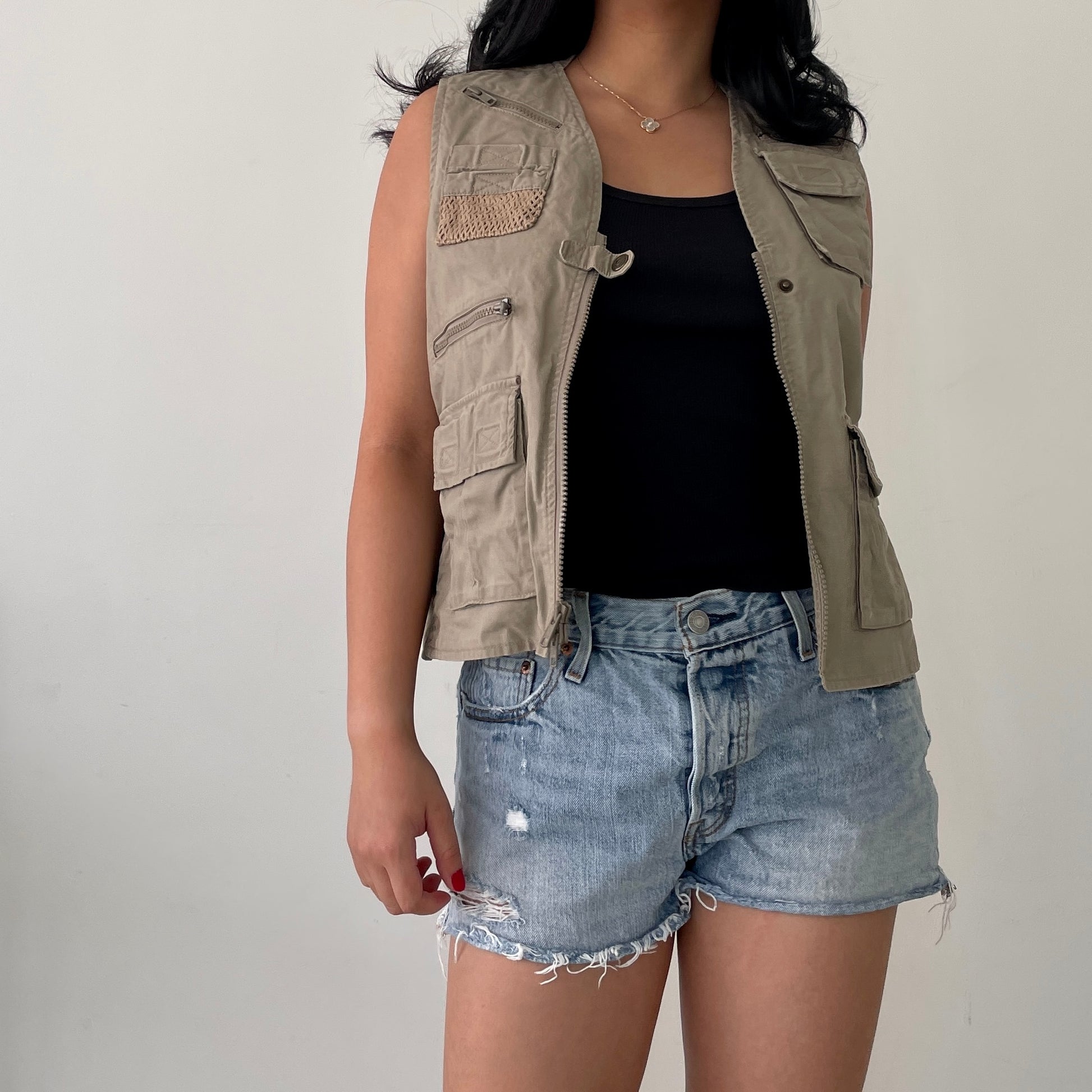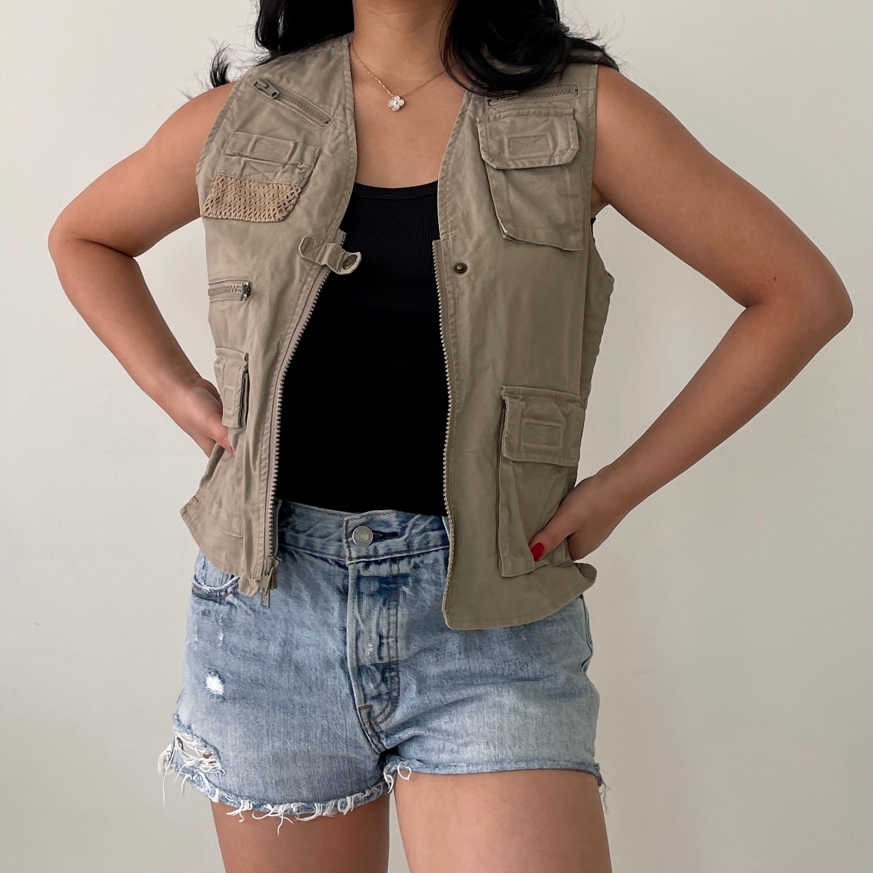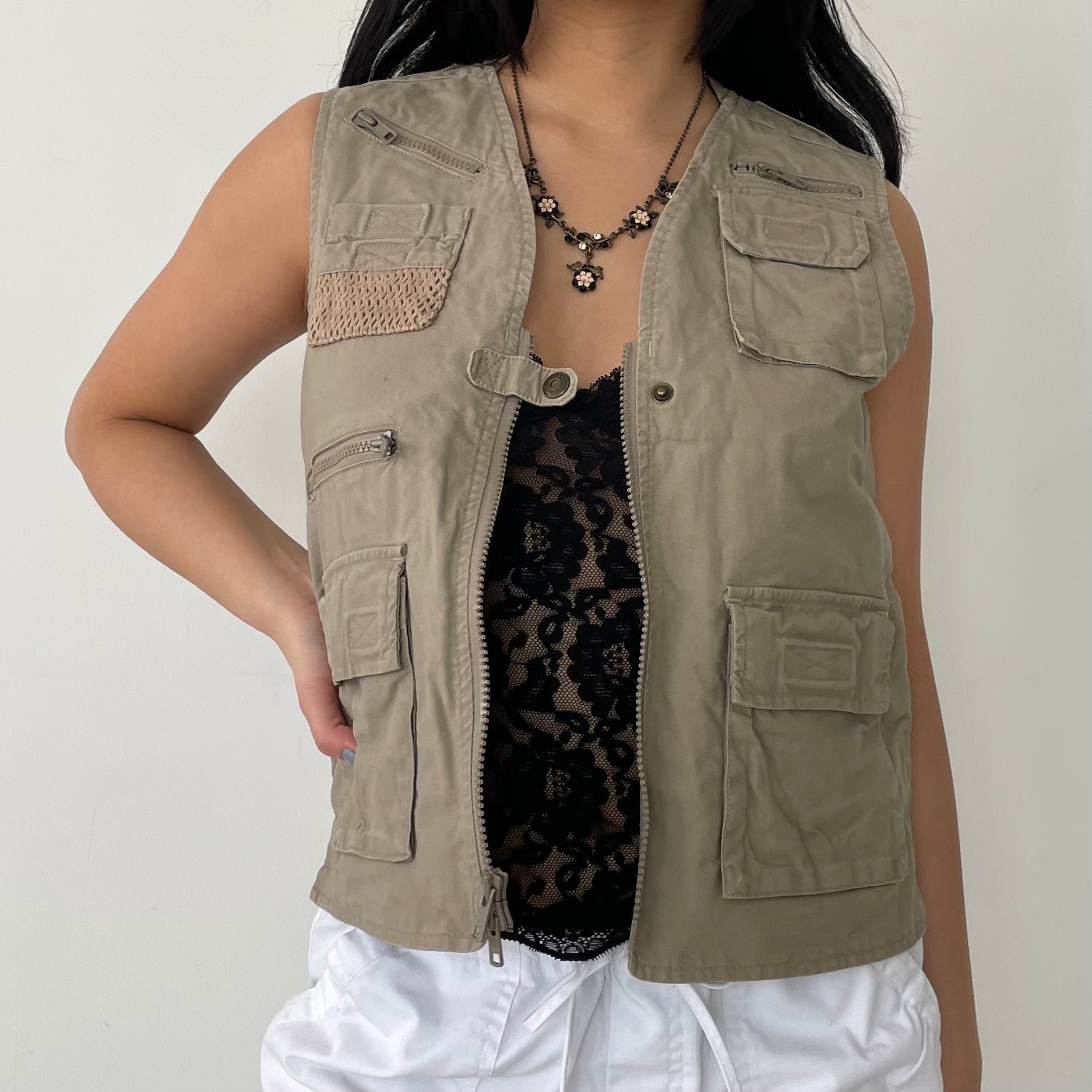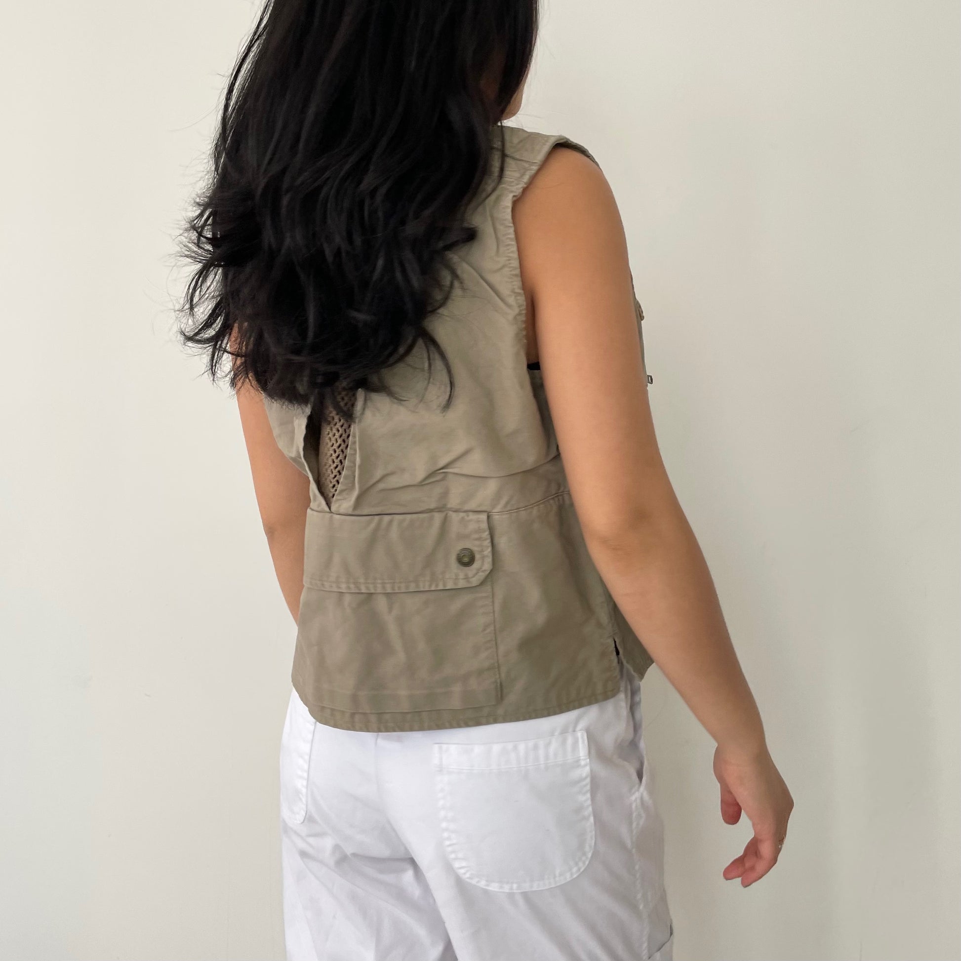 - Details: Khaki coloured sleeveless fly-fisherman vest. Lightly lined for easy layering through the seasons. 4 front and chest pockets. Zip front closure. Pocket at back originally designed to hold maps. Snap-tab on the zip and on the shoulders. Crafted in a sturdy cotton twill.