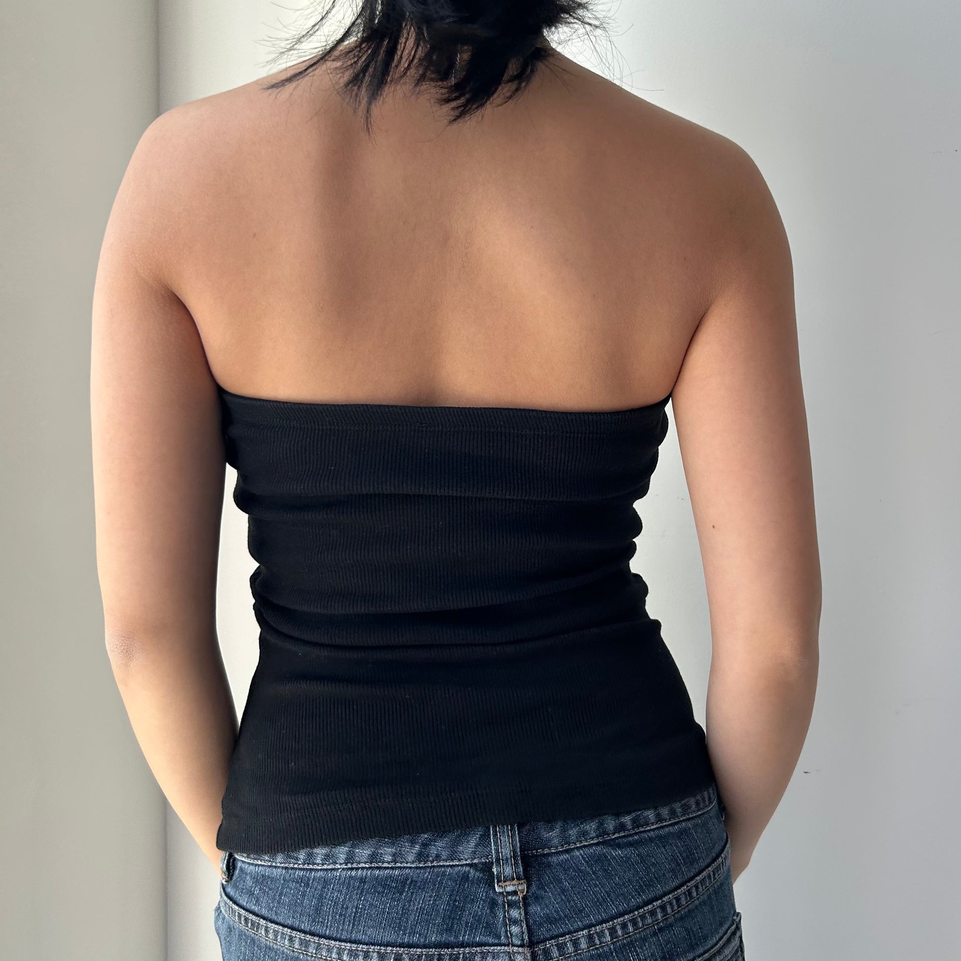 - Details: Black ribbed strapless top; built-in bra; diamante logo embellishment at front