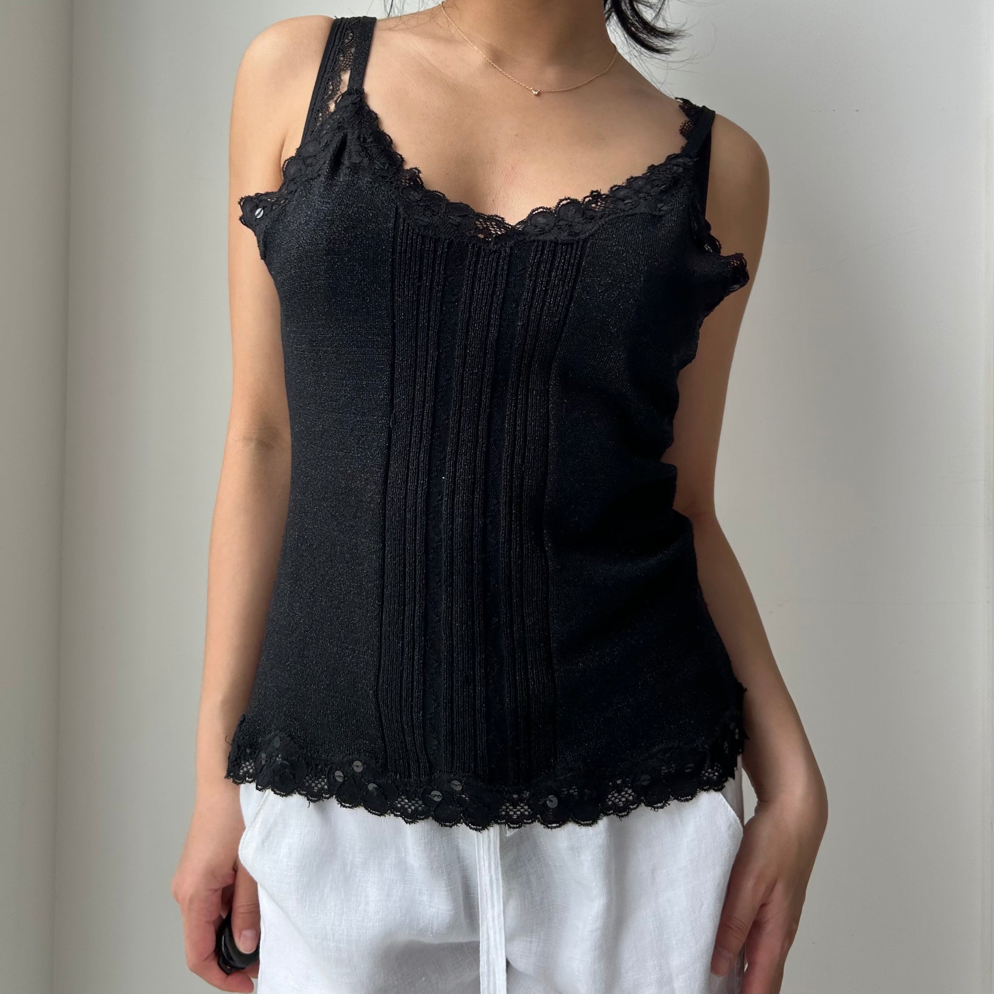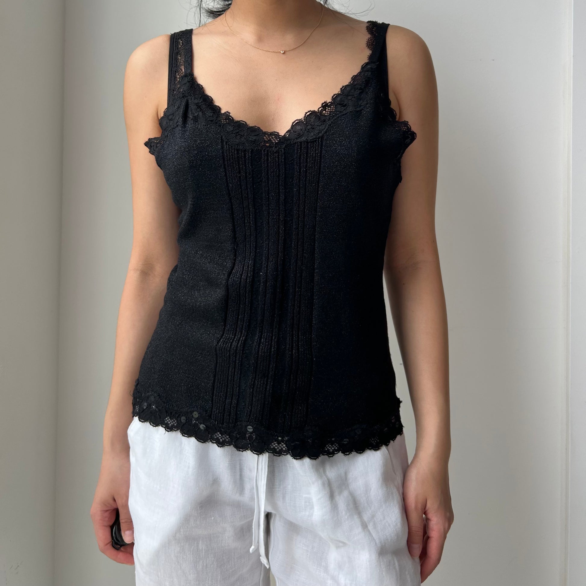 - Details: Black metallic knit lace trim tank top; v-neck; adjustable straps; lace trim detail with sequin embellishments; ribbed