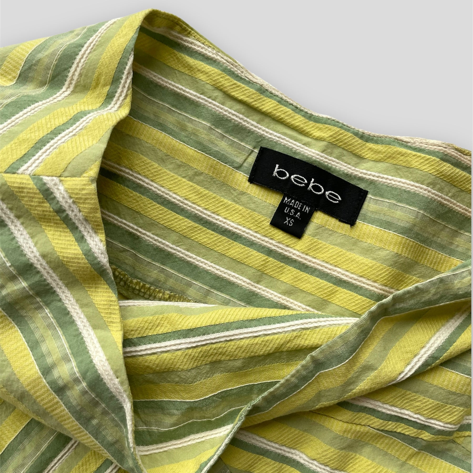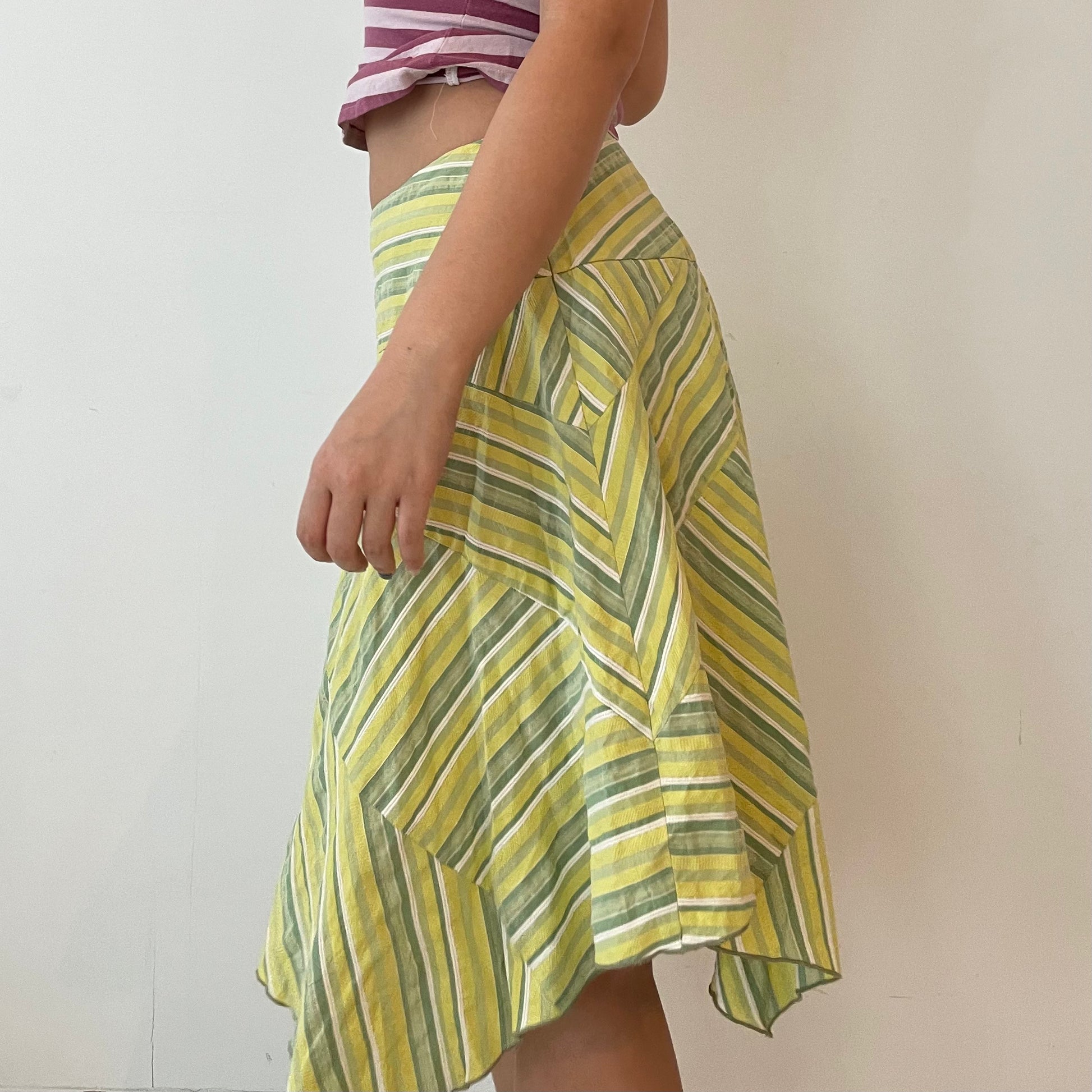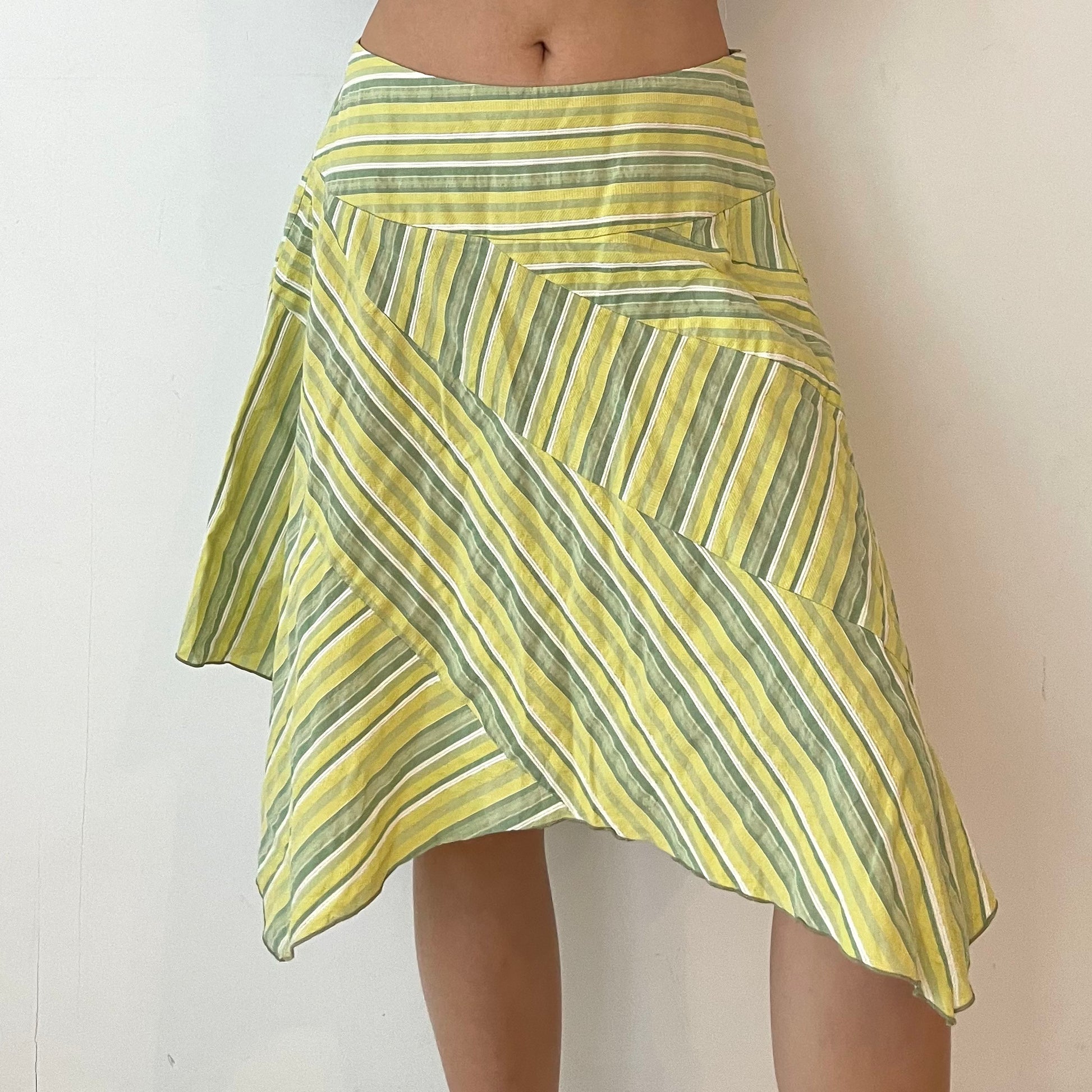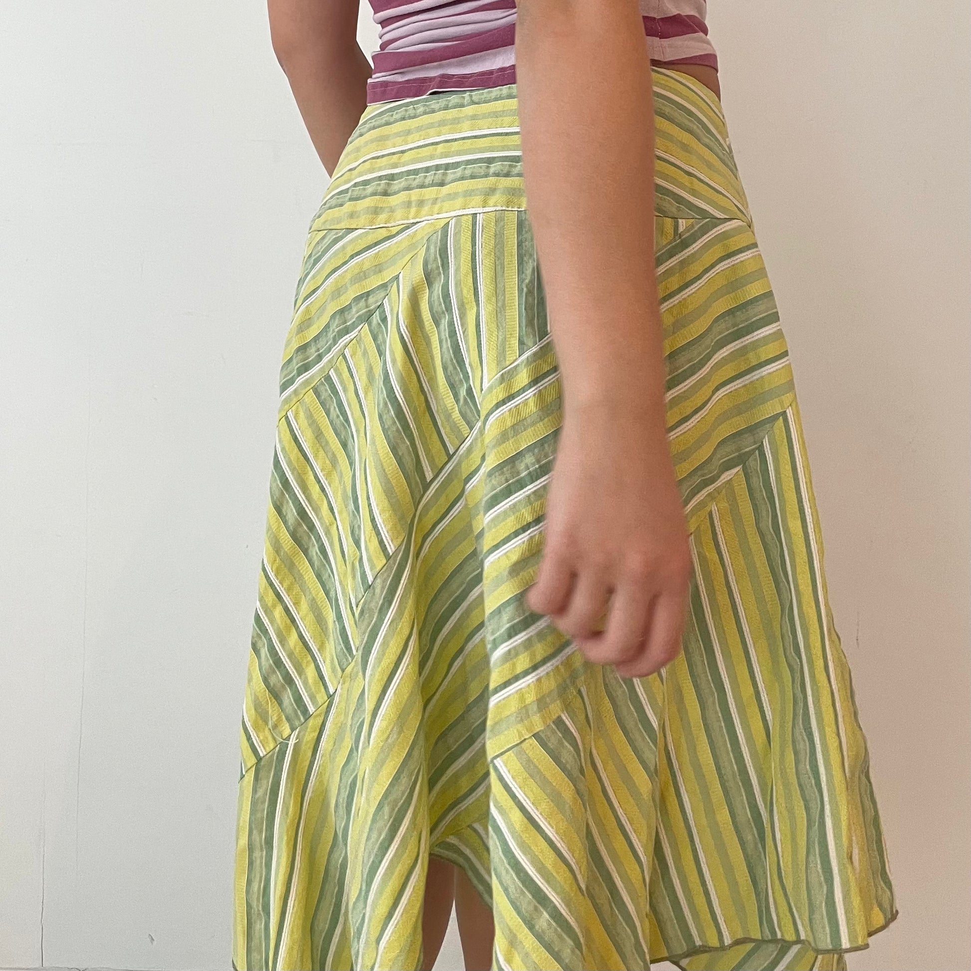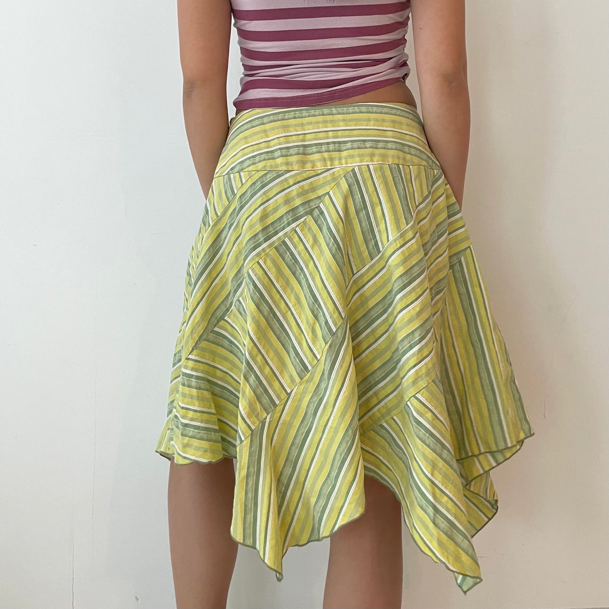 - Details: Green and white striped midi skirt with an asymmetrical fairy hem; concealed side zip