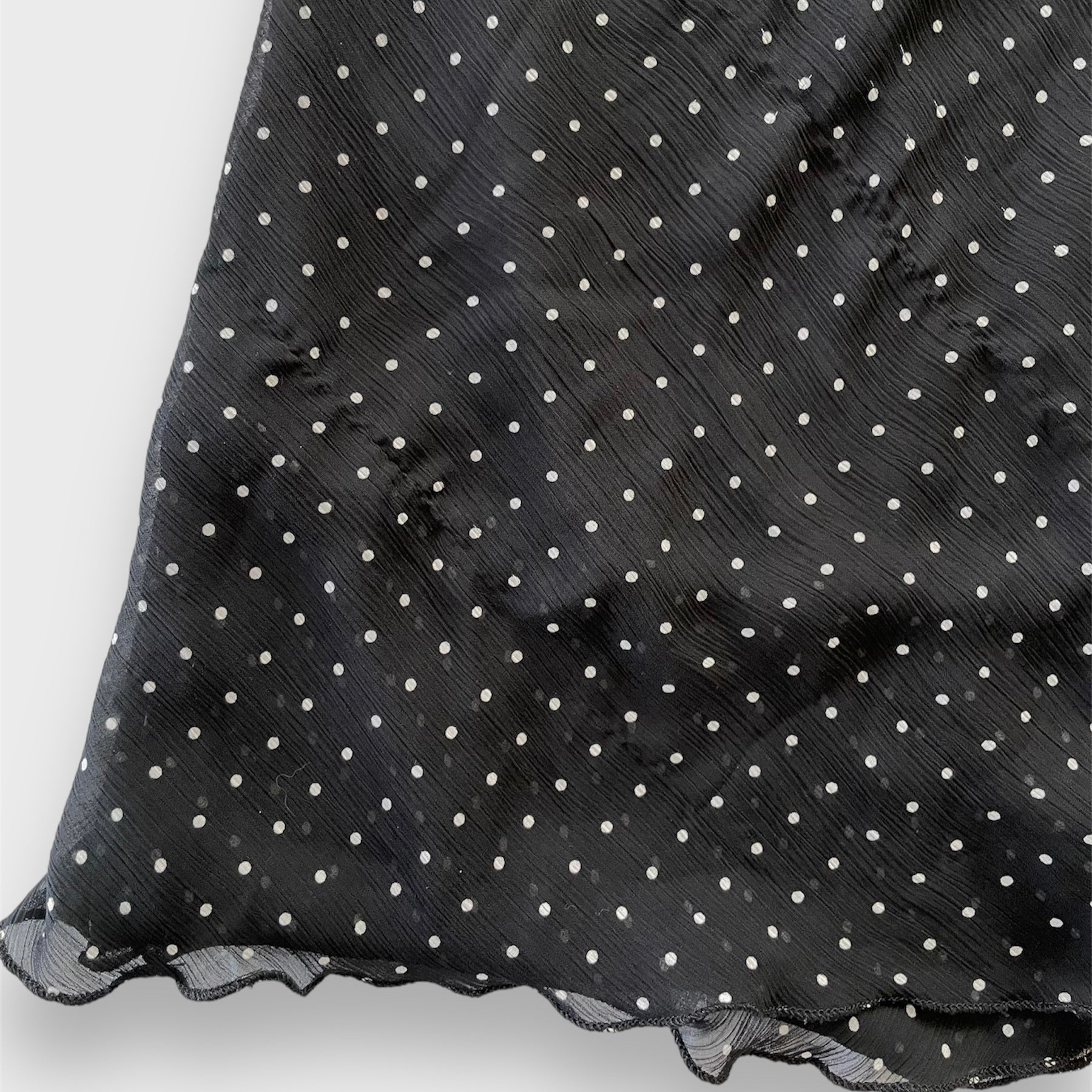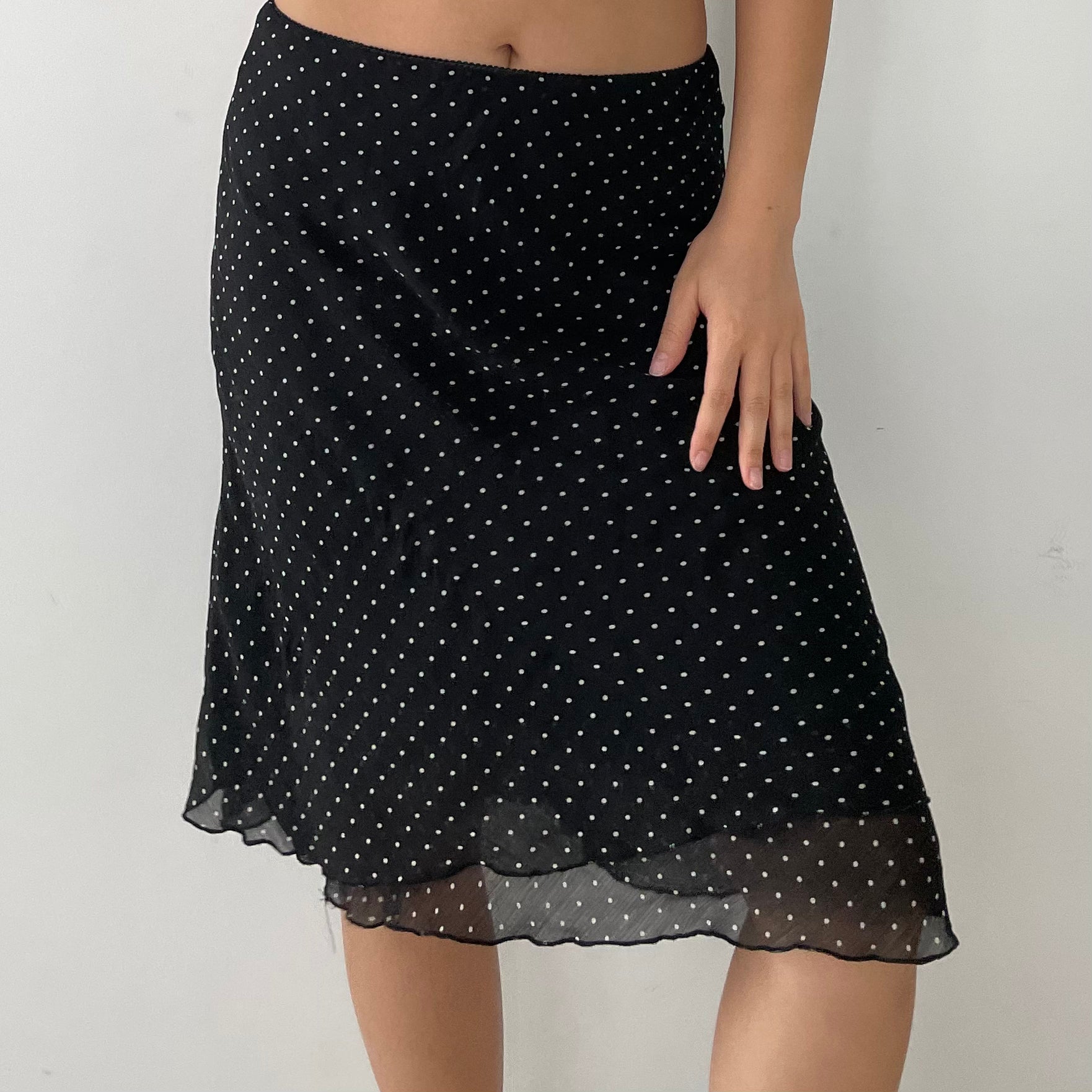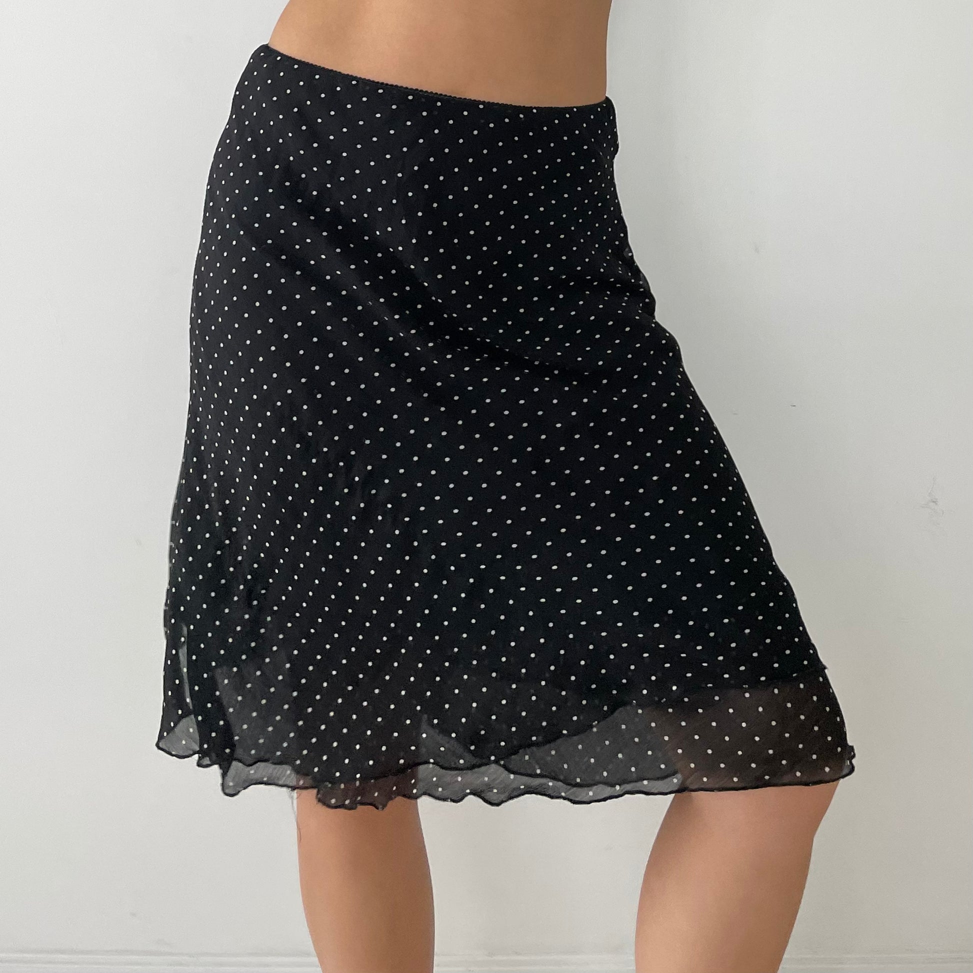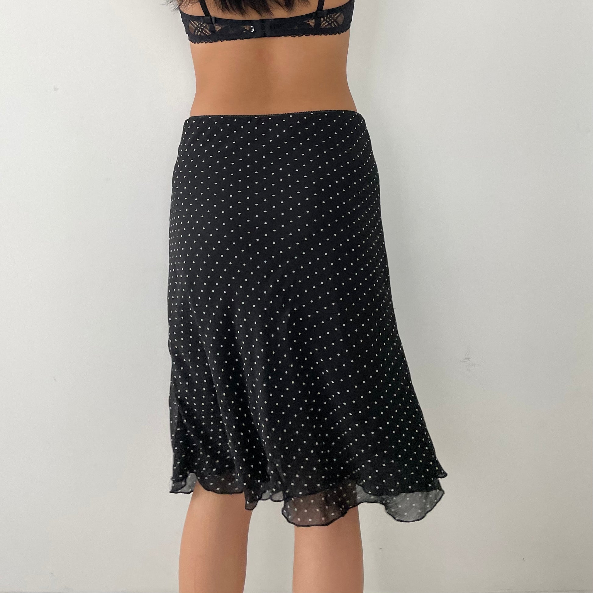 Details: Double lined; elasticated waistband; black and white polka dot print; slip skirt