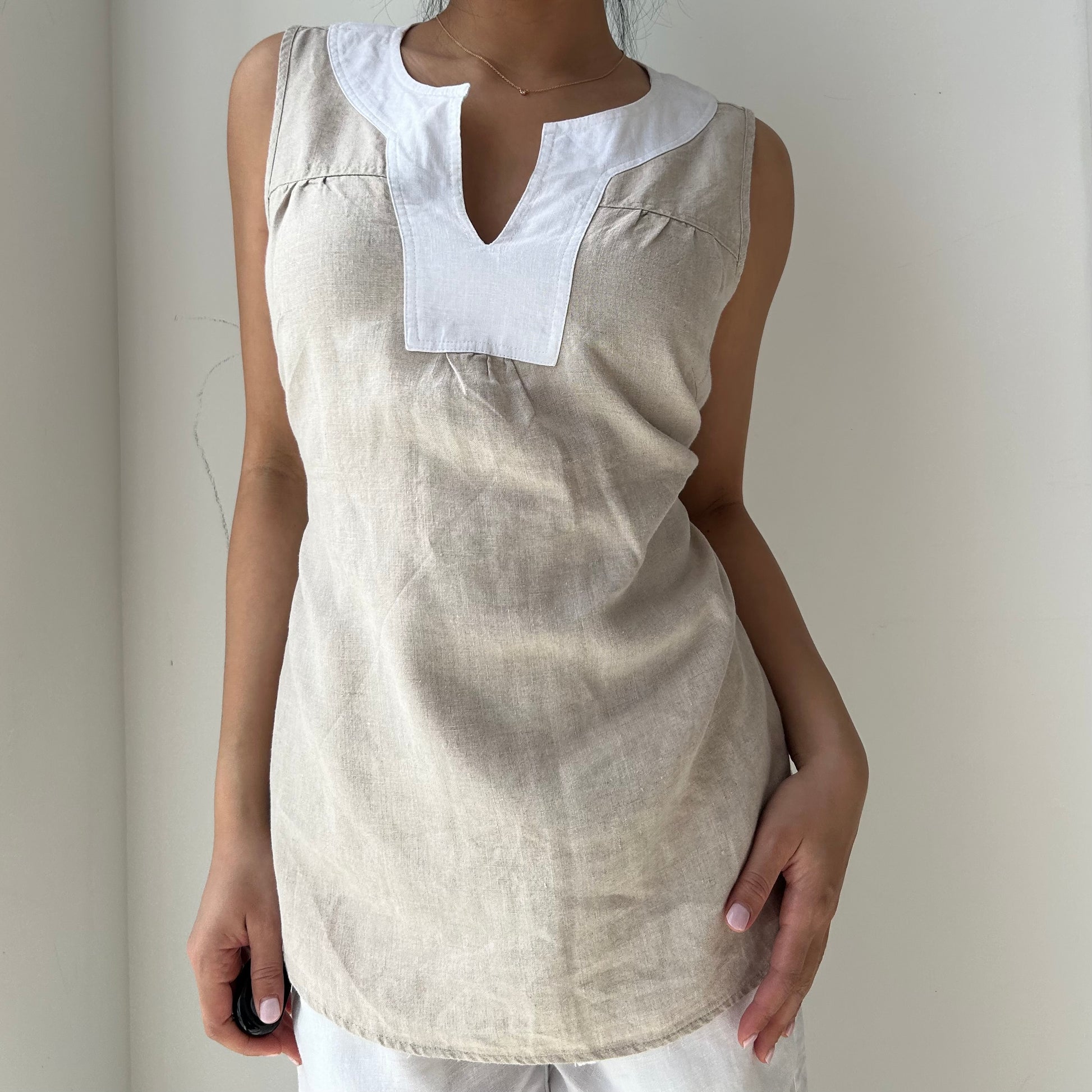• Details: Soft beige linen body with crisp white contrast bib; split neckline with gentle gathers below the bust; sleeveless cut and longline silhouette; tie waist back