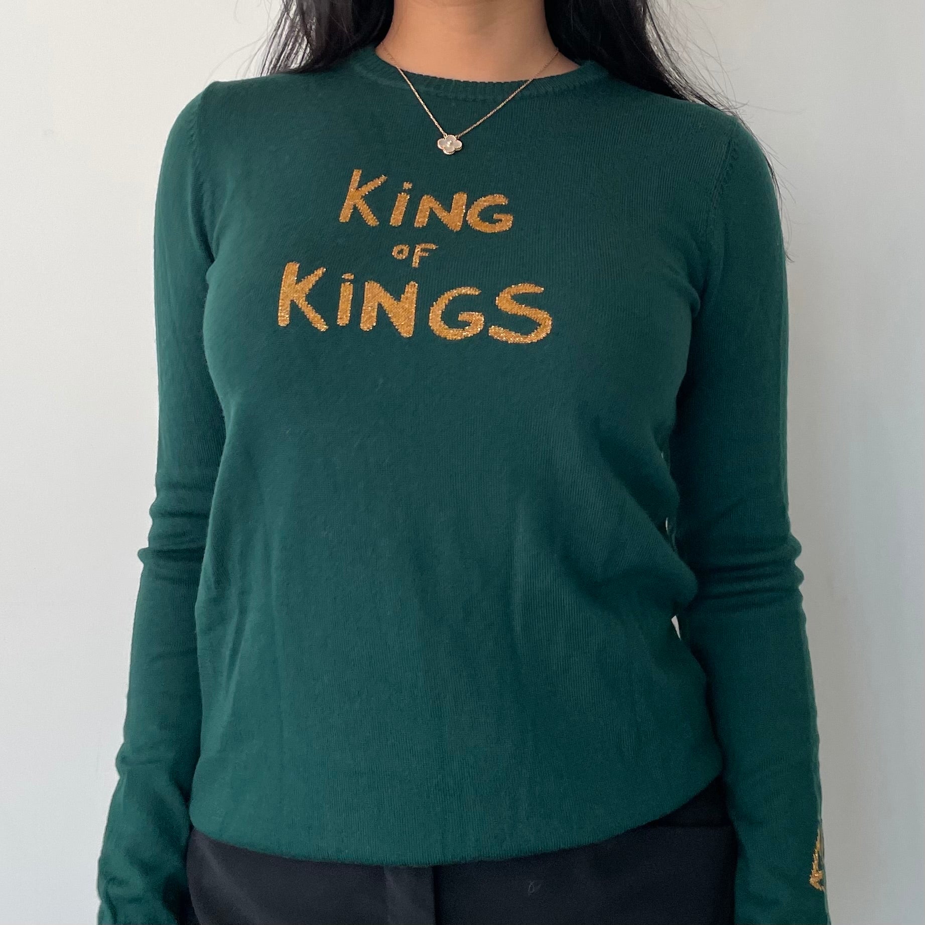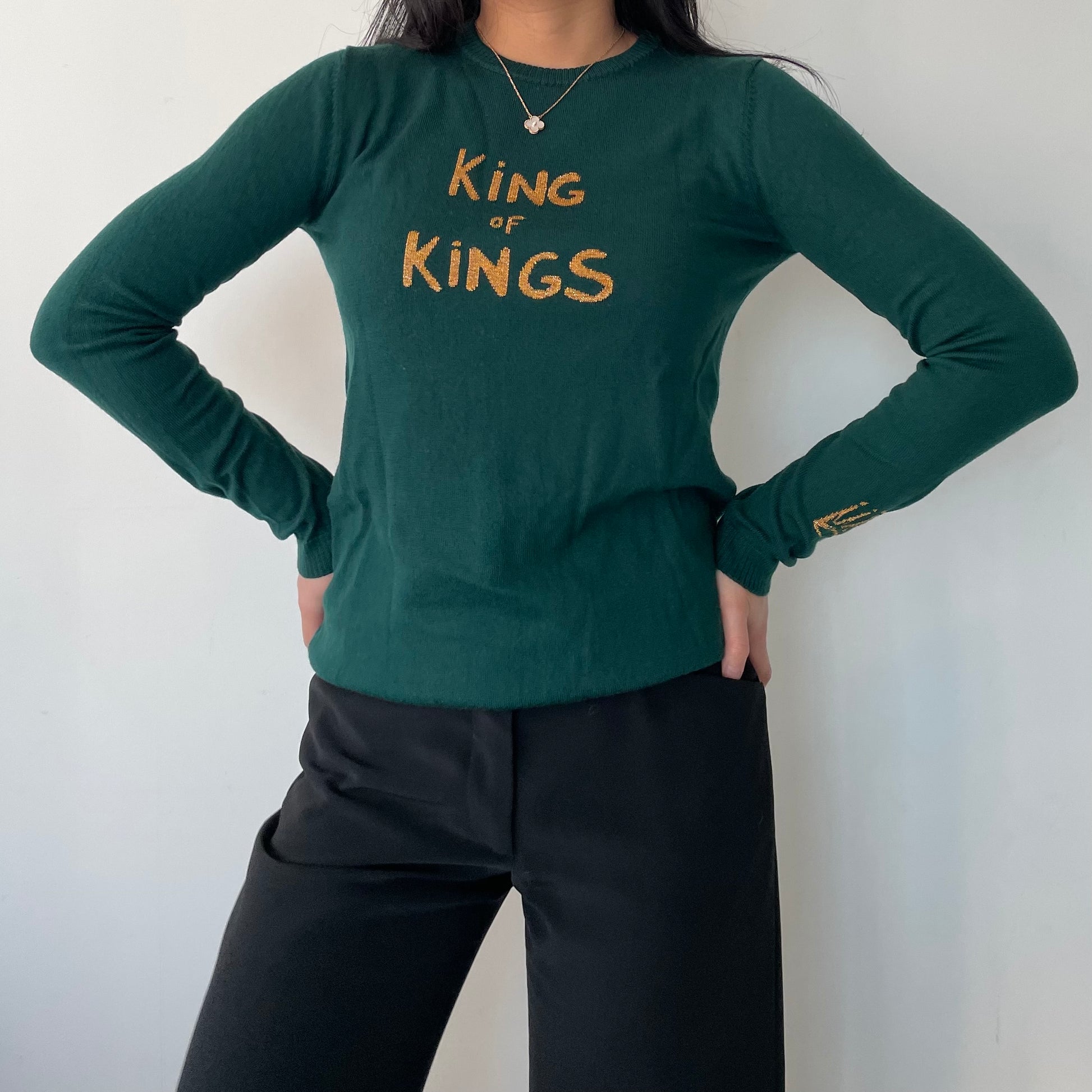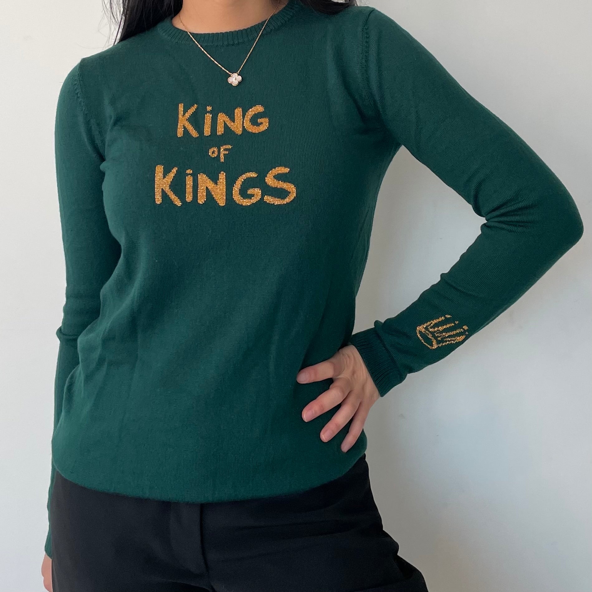 • Details: Merino wool fine gauge crewneck sweater; ribbed neck, hem, and cuffs; 'King of Kings' gold sparkle intarsia and sparkle crown on the sleeve