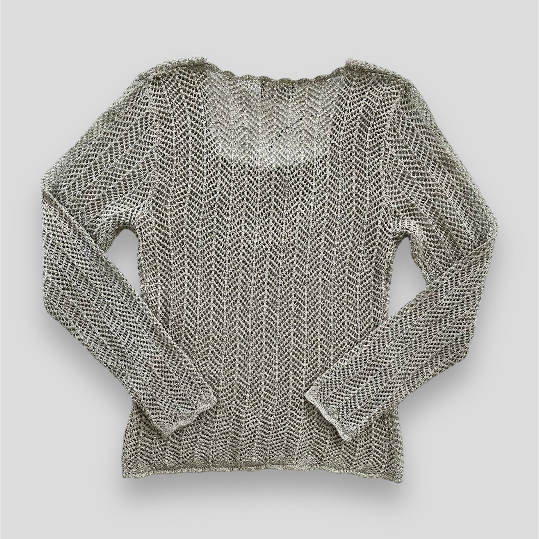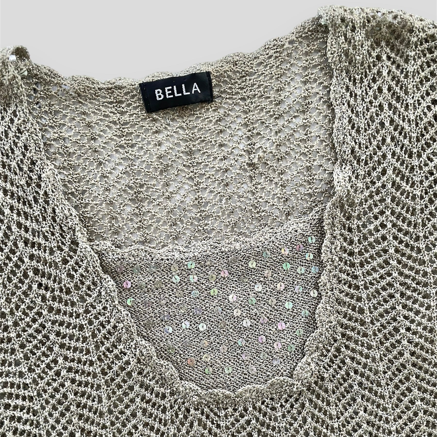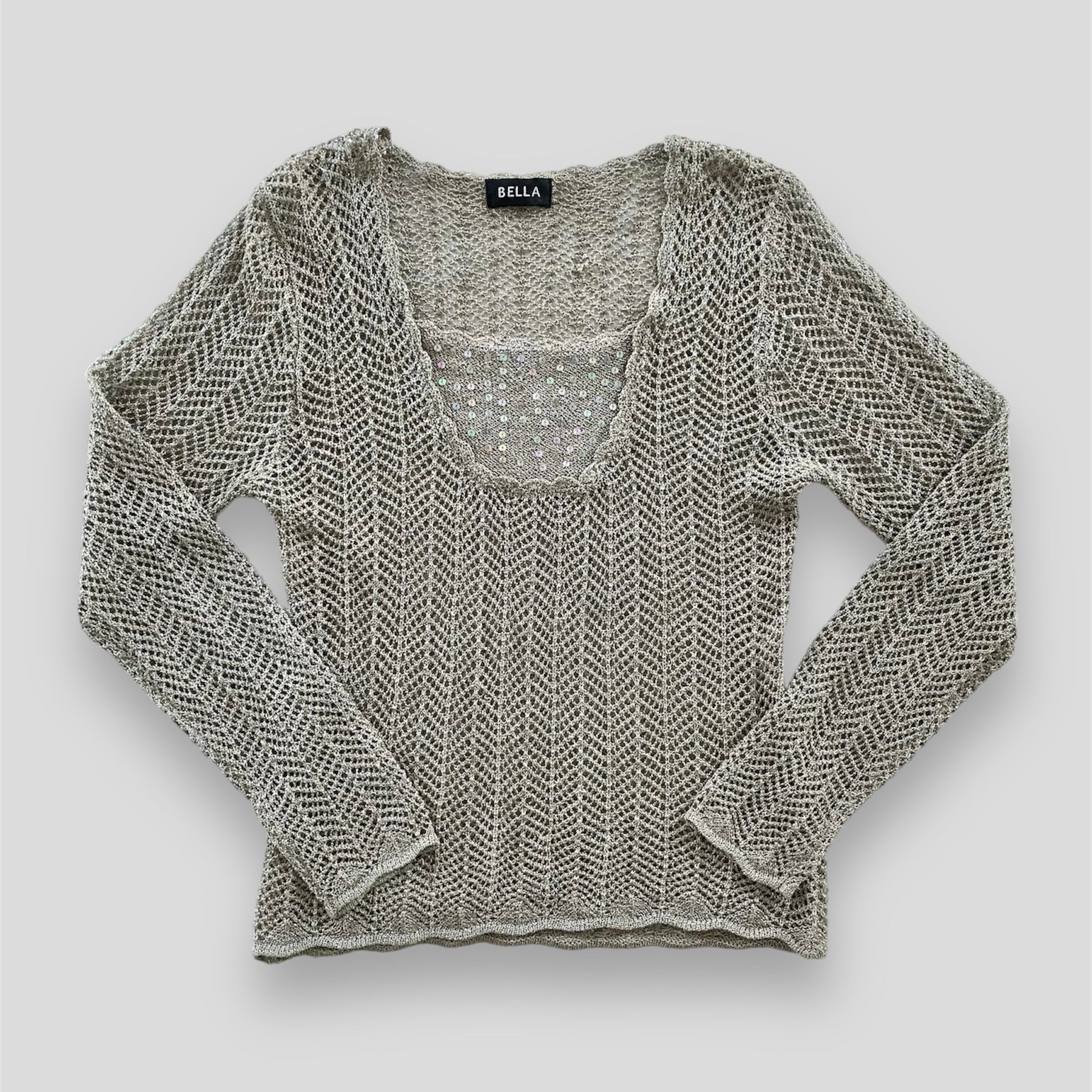 - Details: Lightweight material; gold long sleeve knit top with square neck; boho style; silver metallic thread throughout; sequin details on the bust