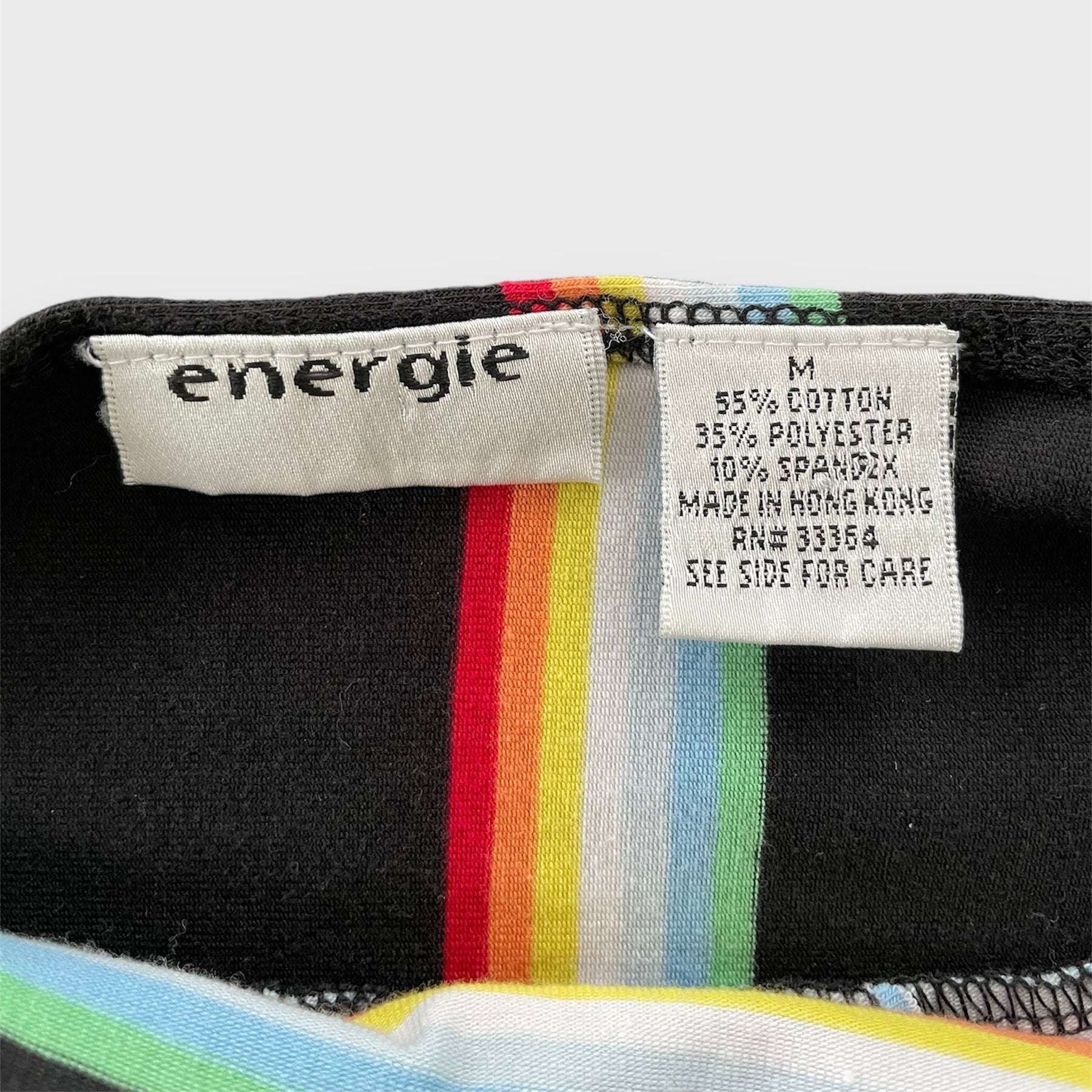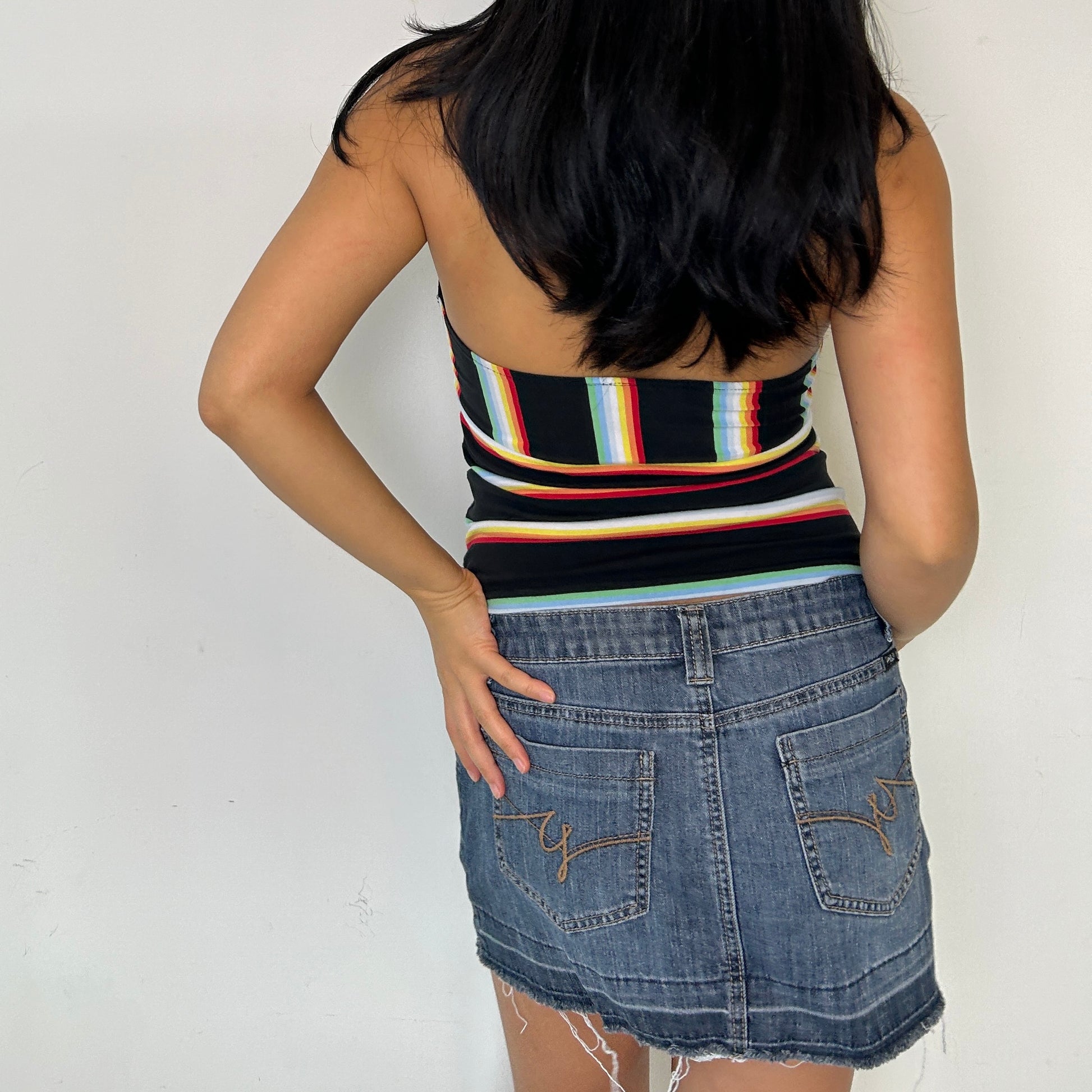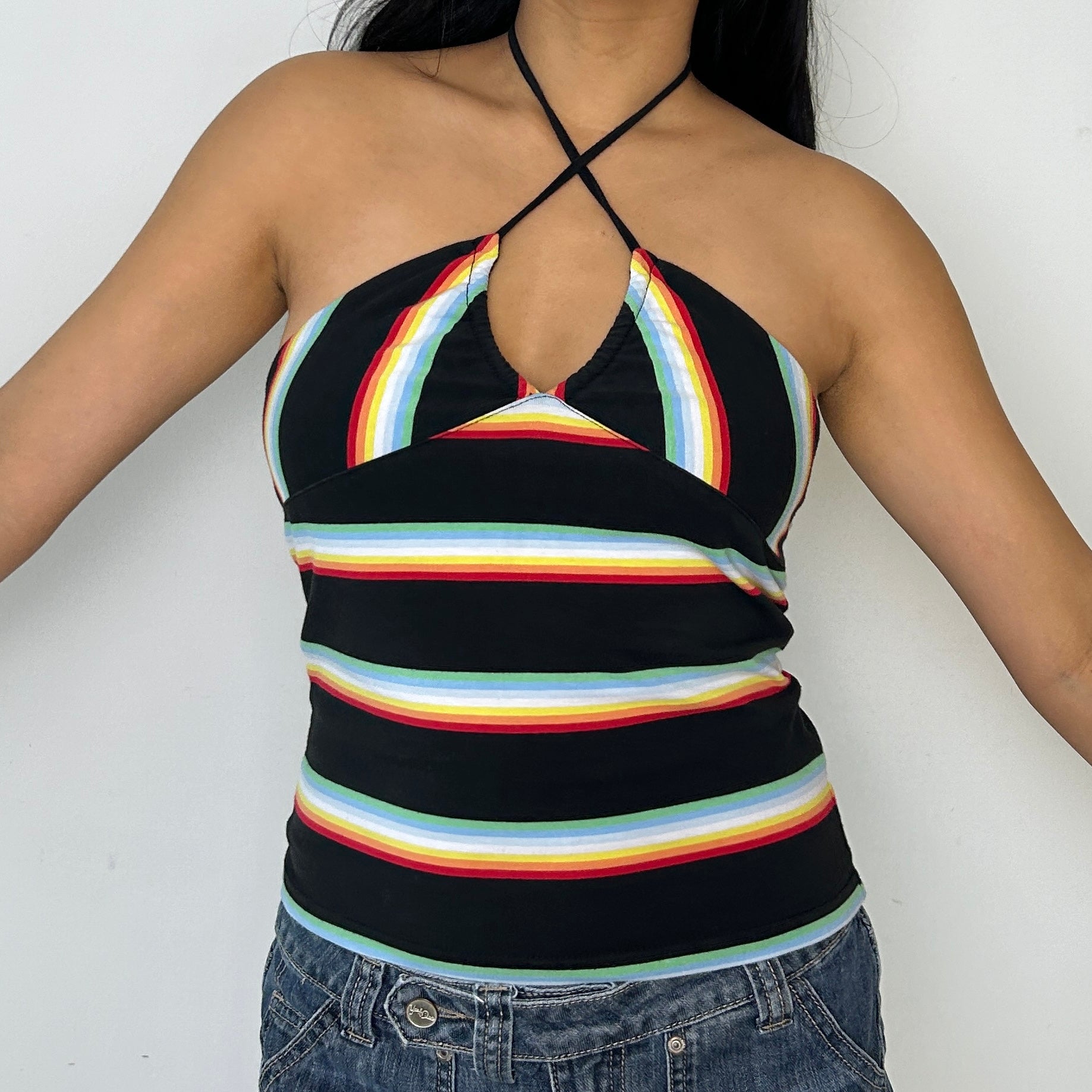 - Details: Black and rainbow stripes; halter tie neck; backless