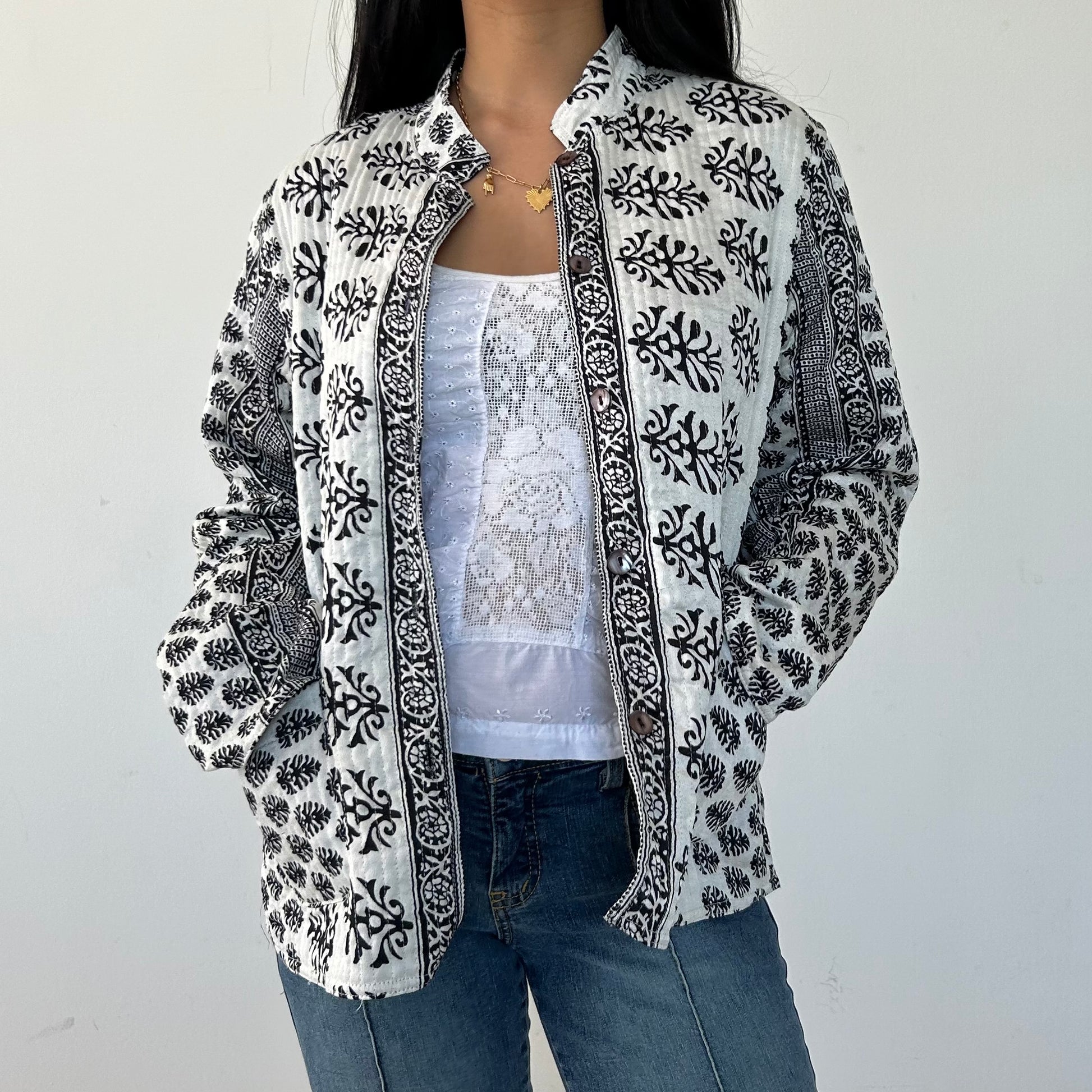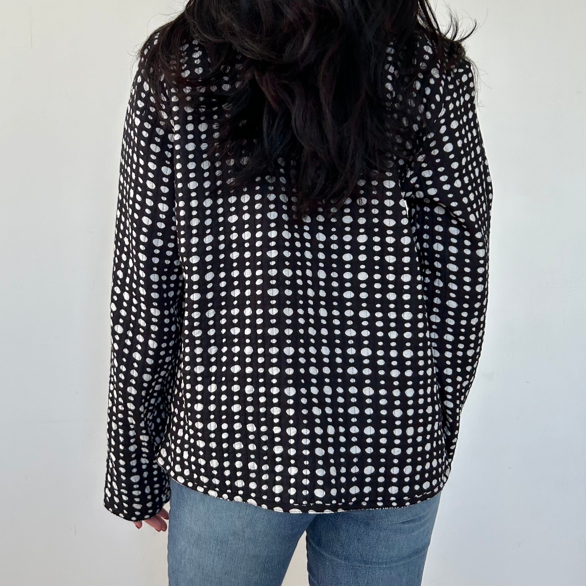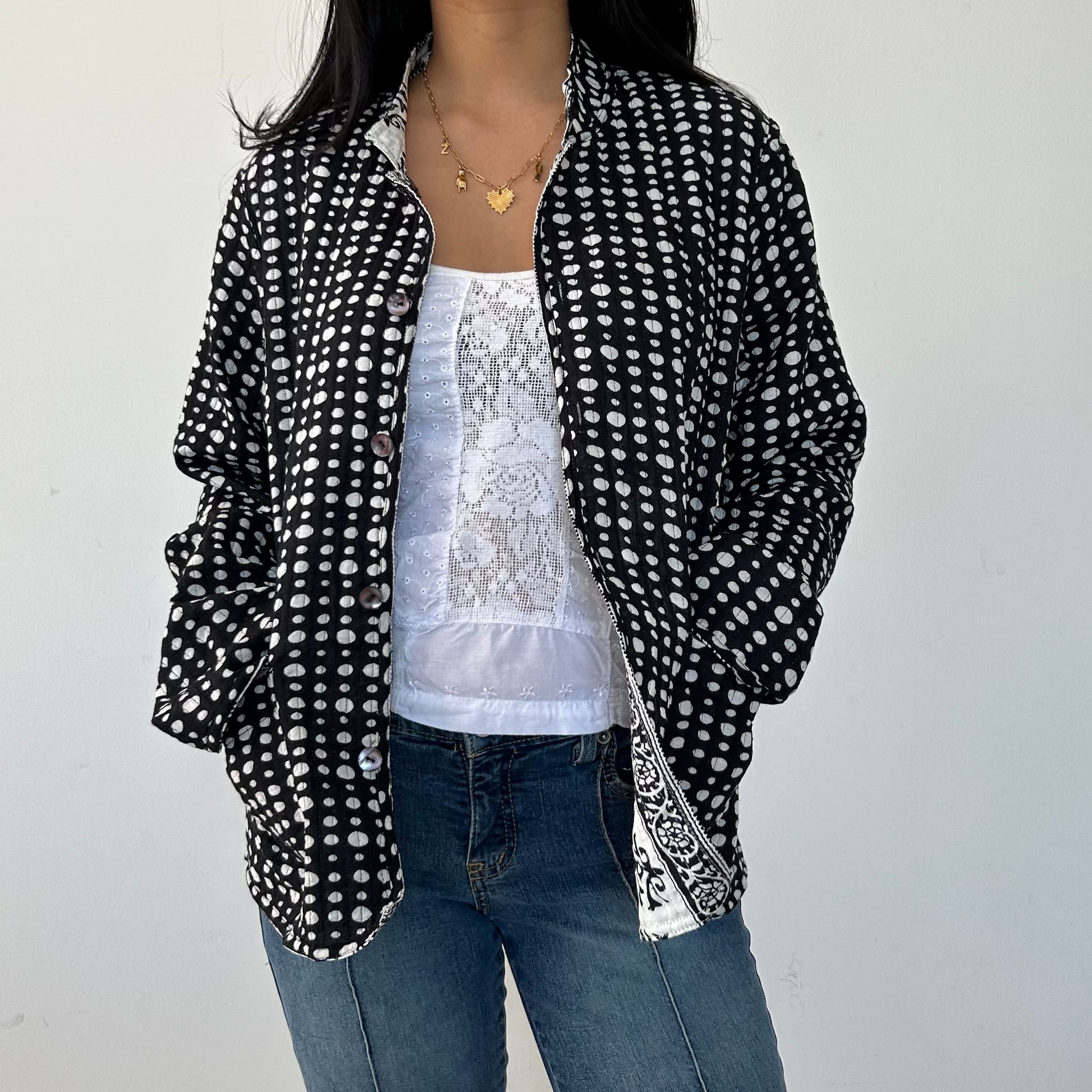 - Details: Black and white plant print on one side, polka dot print on the other; fully reversible; patch pockets; button enclosure