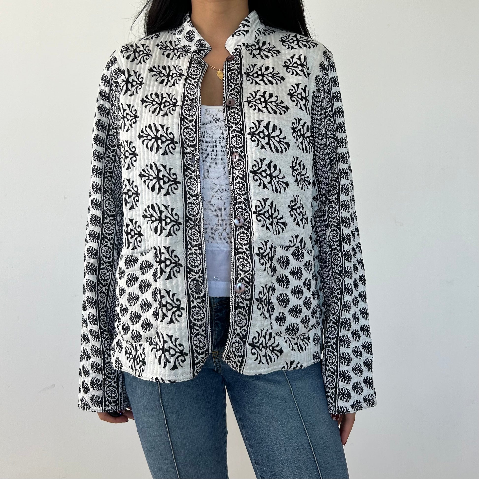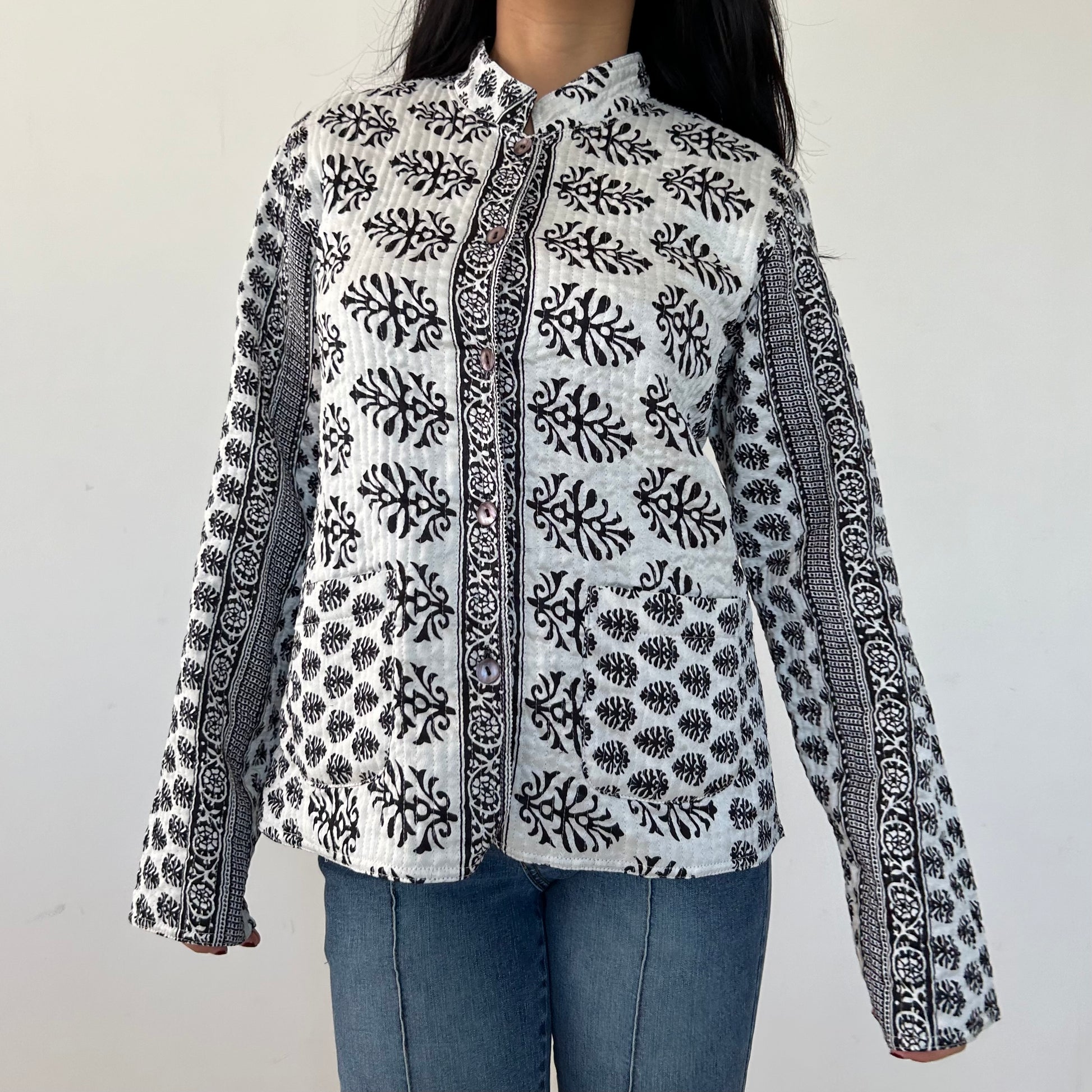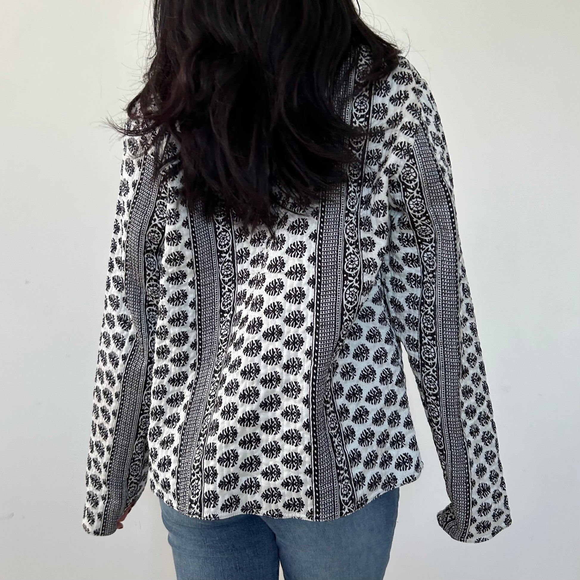 - Details: Black and white plant print on one side, polka dot print on the other; fully reversible; patch pockets; button enclosure