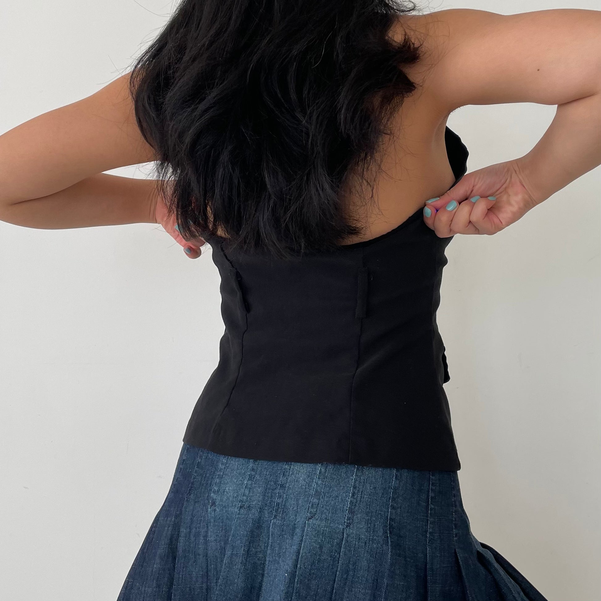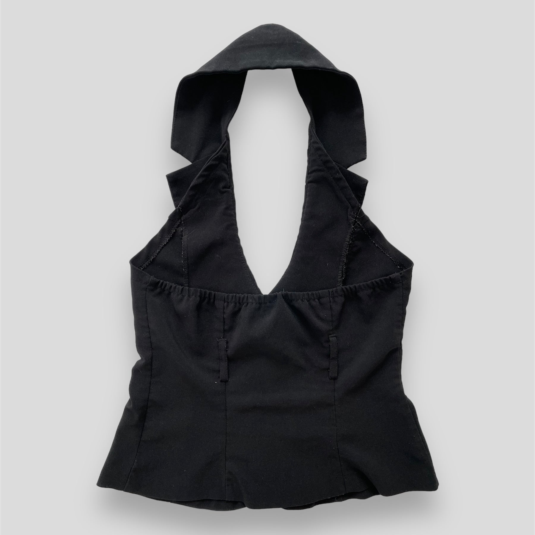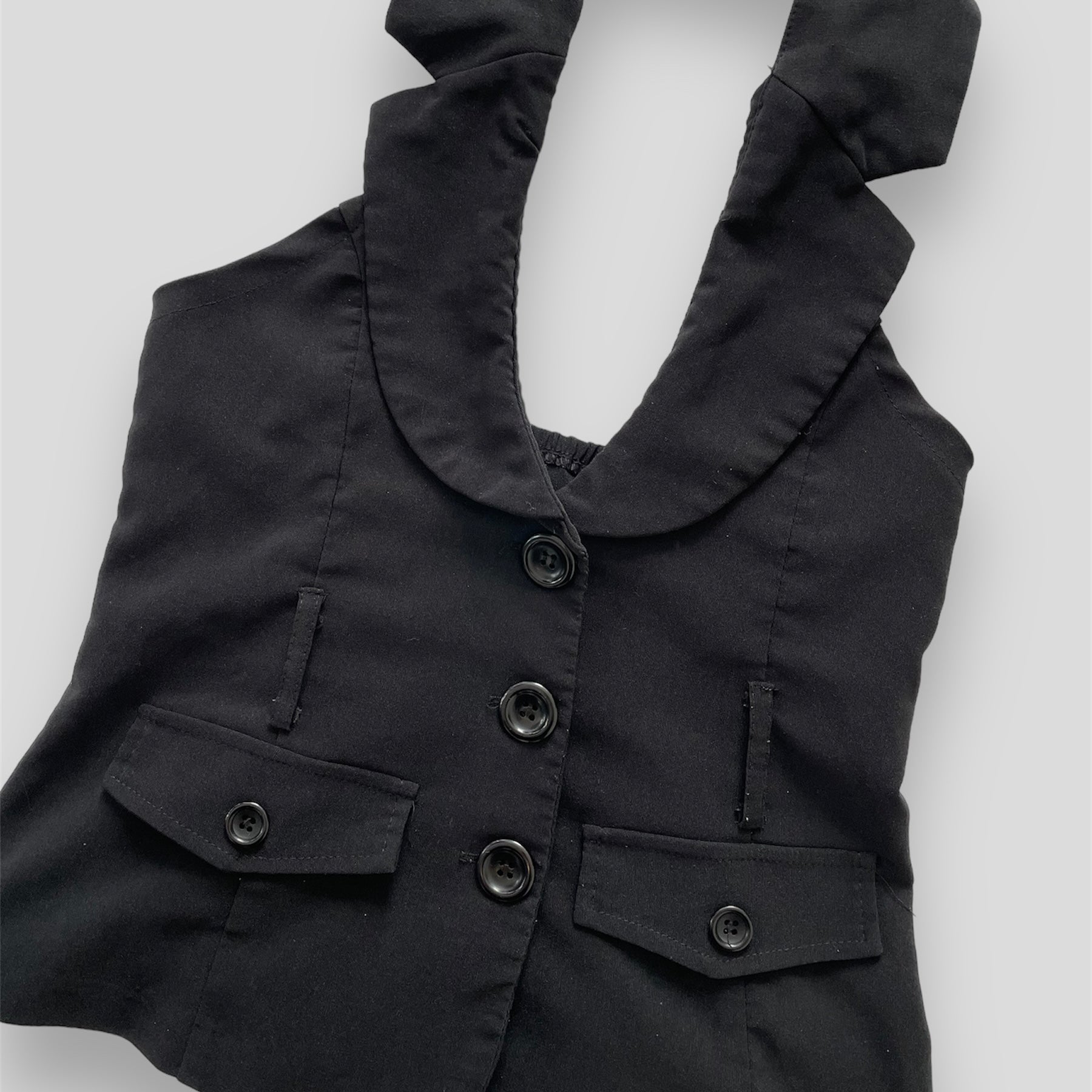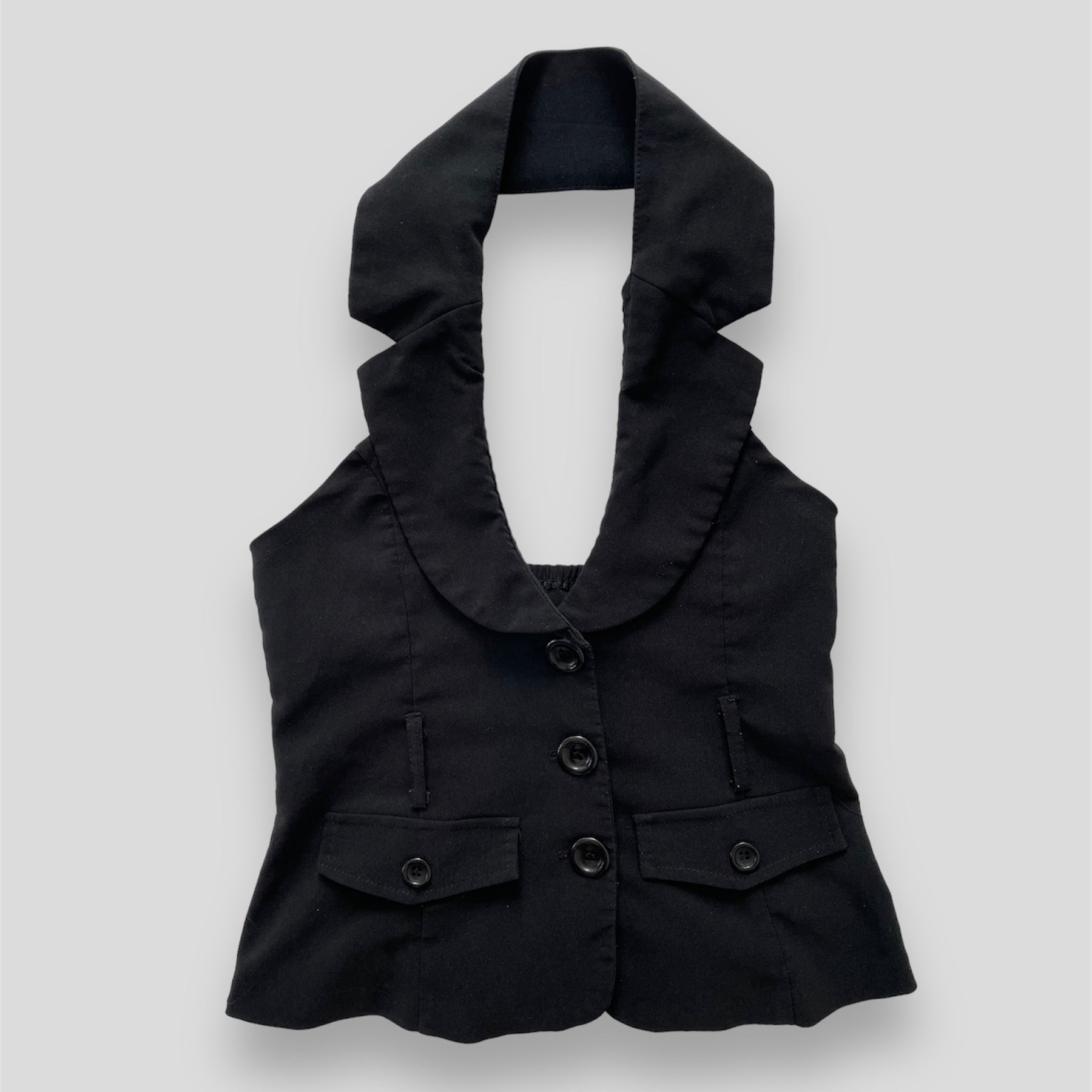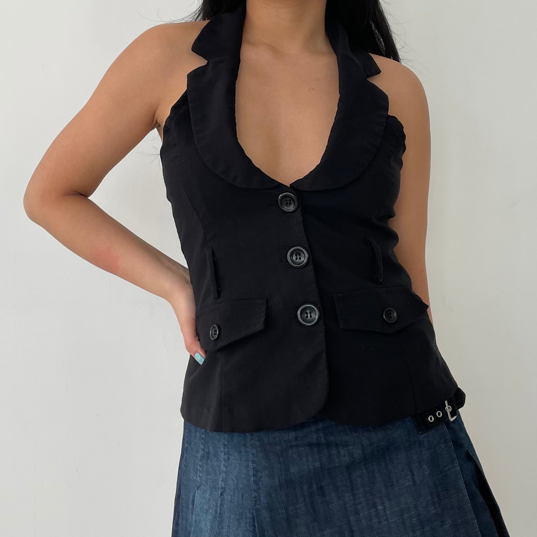 - Details: 2000s style black halter button up vest; belt loop and faux pocket details