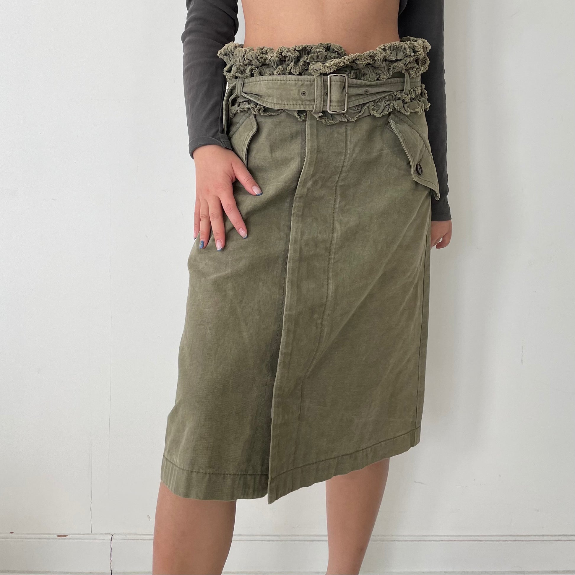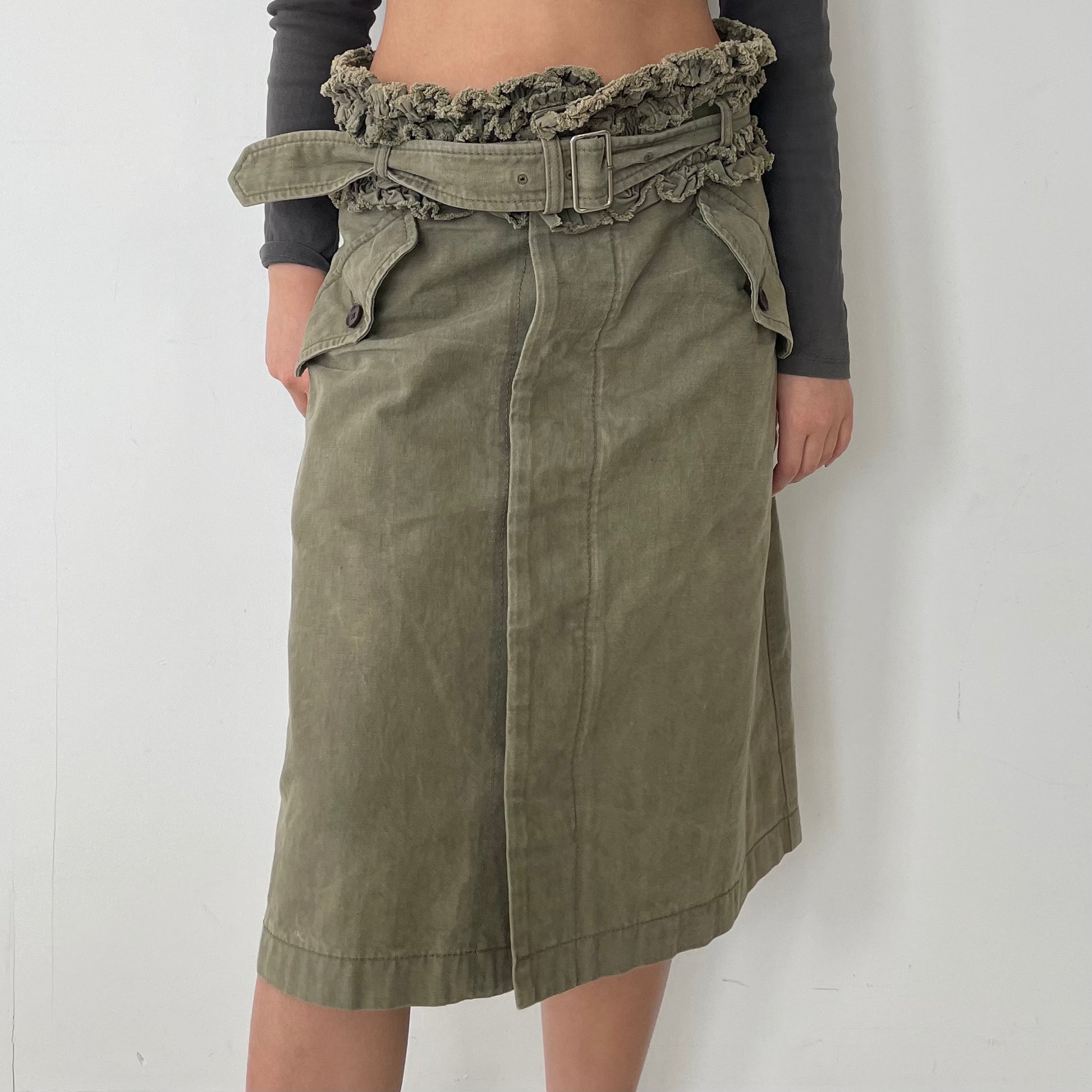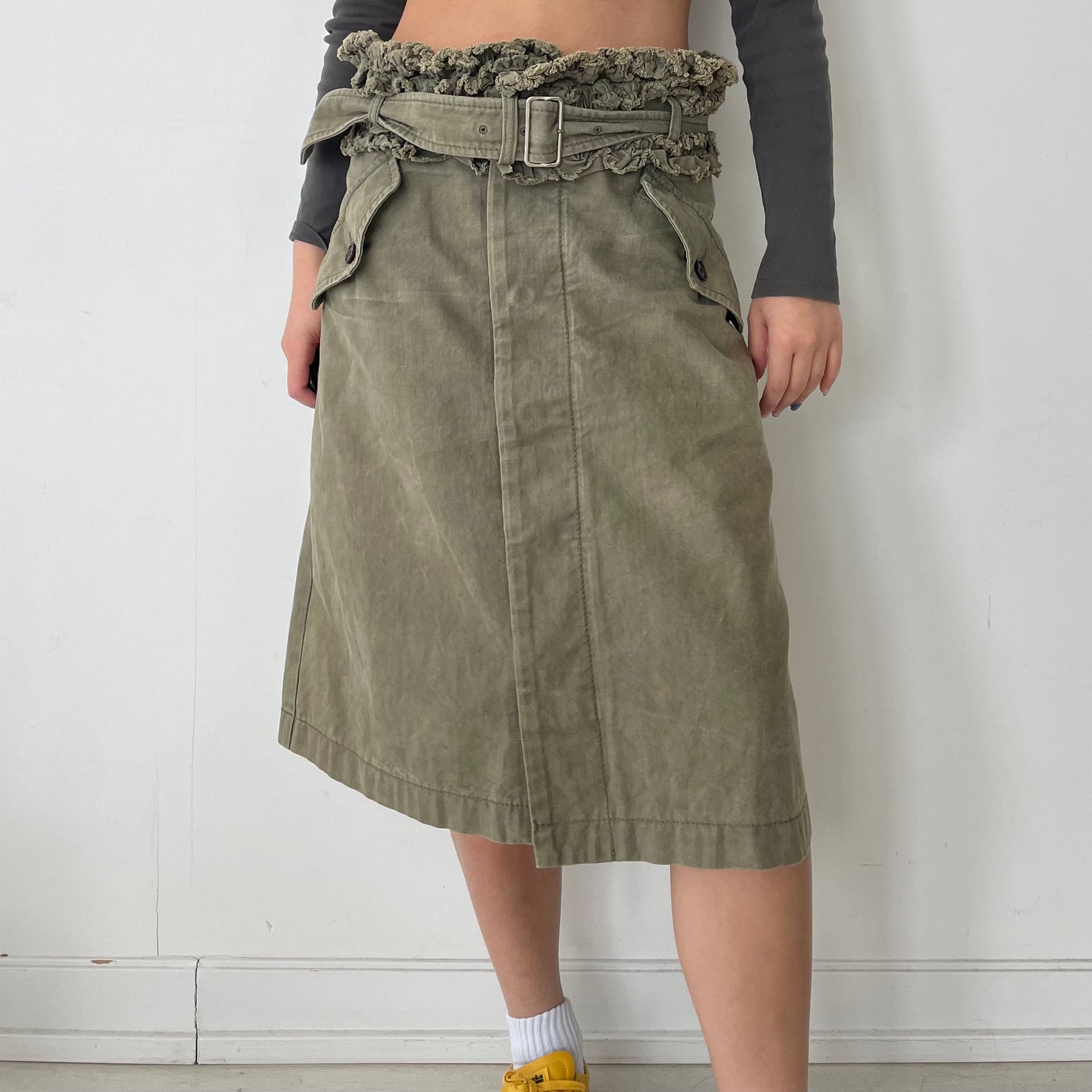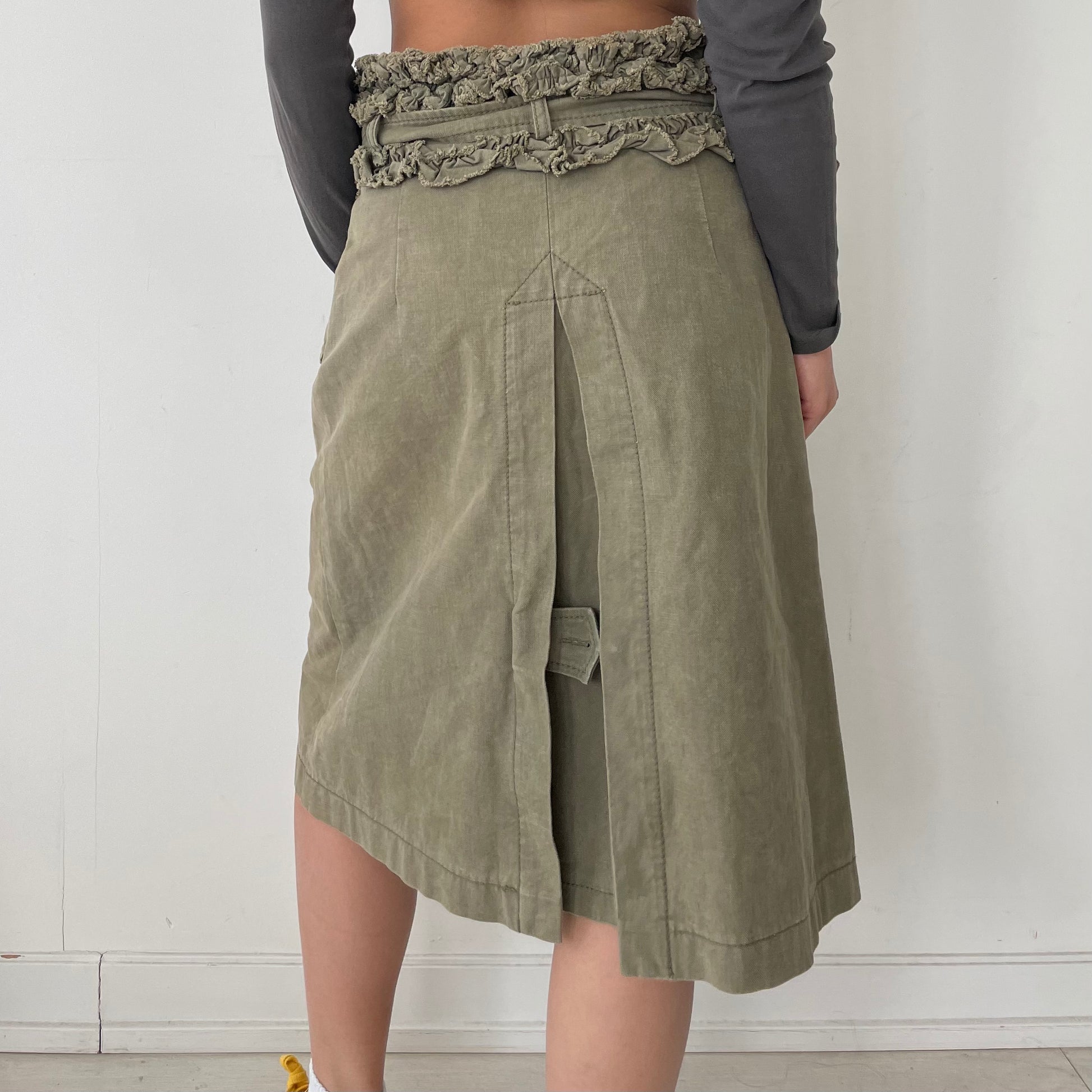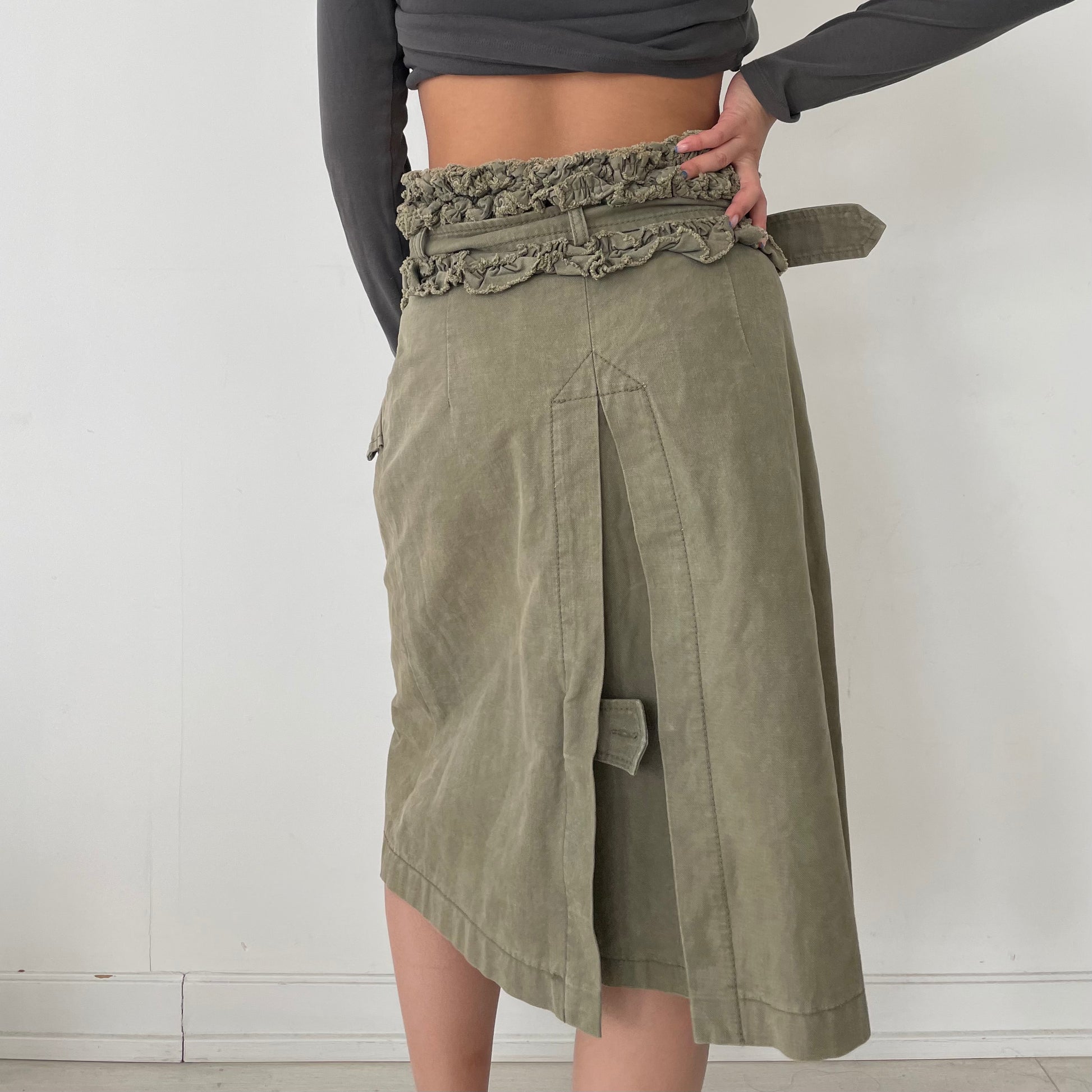 • Details: Khaki green midi skirt with buckle belt and ruffle details on the waist; front button down; two front pockets; slit at the back