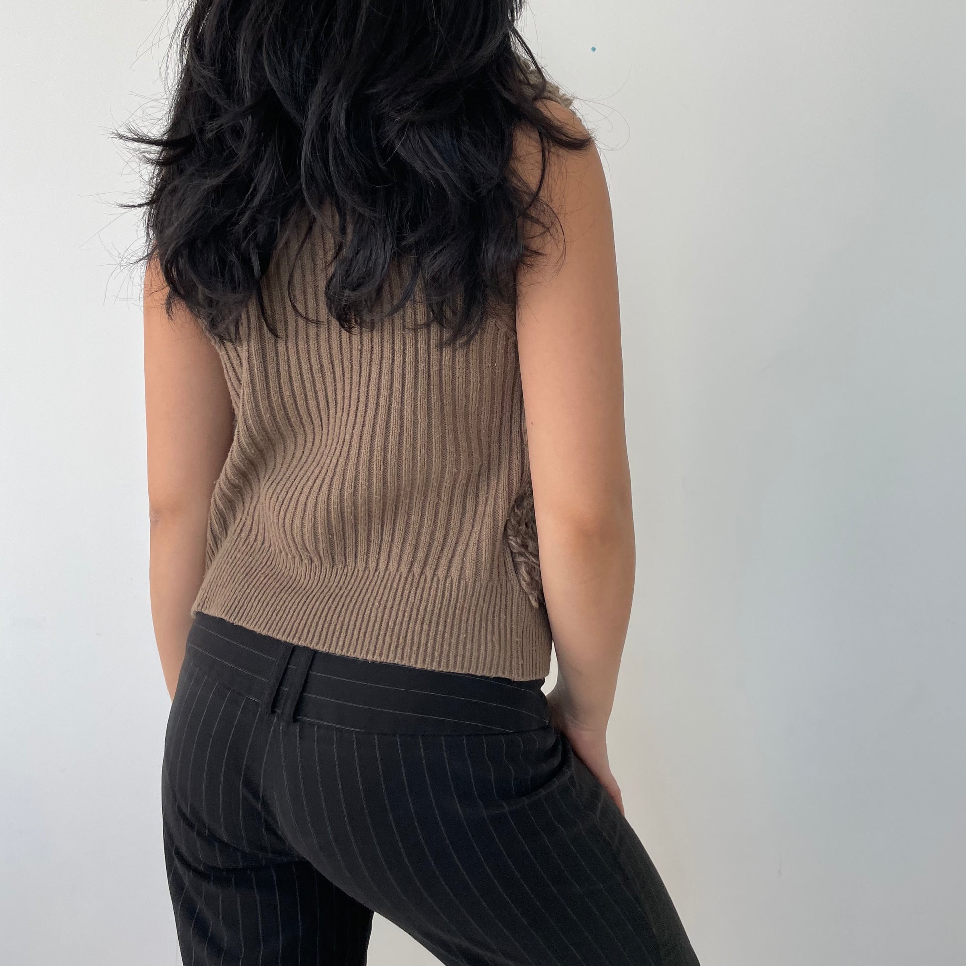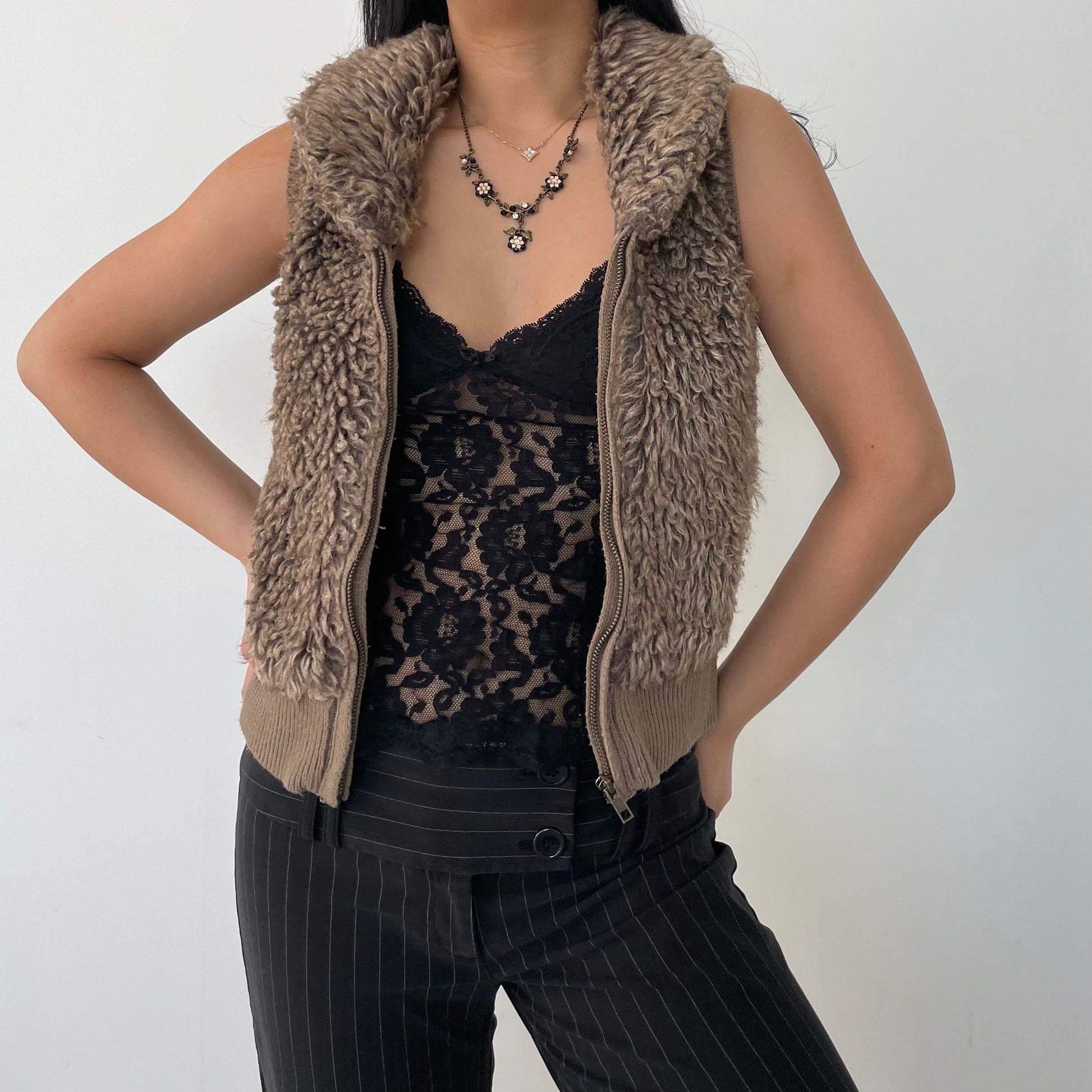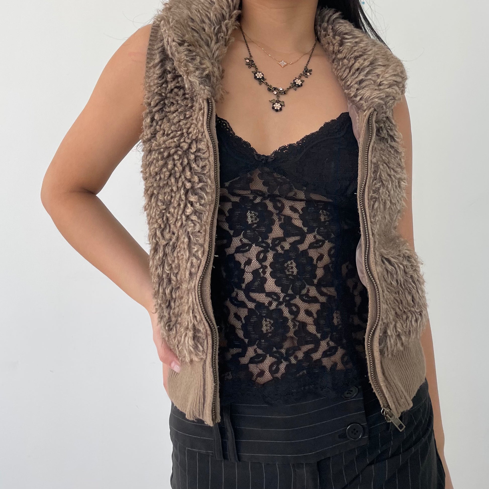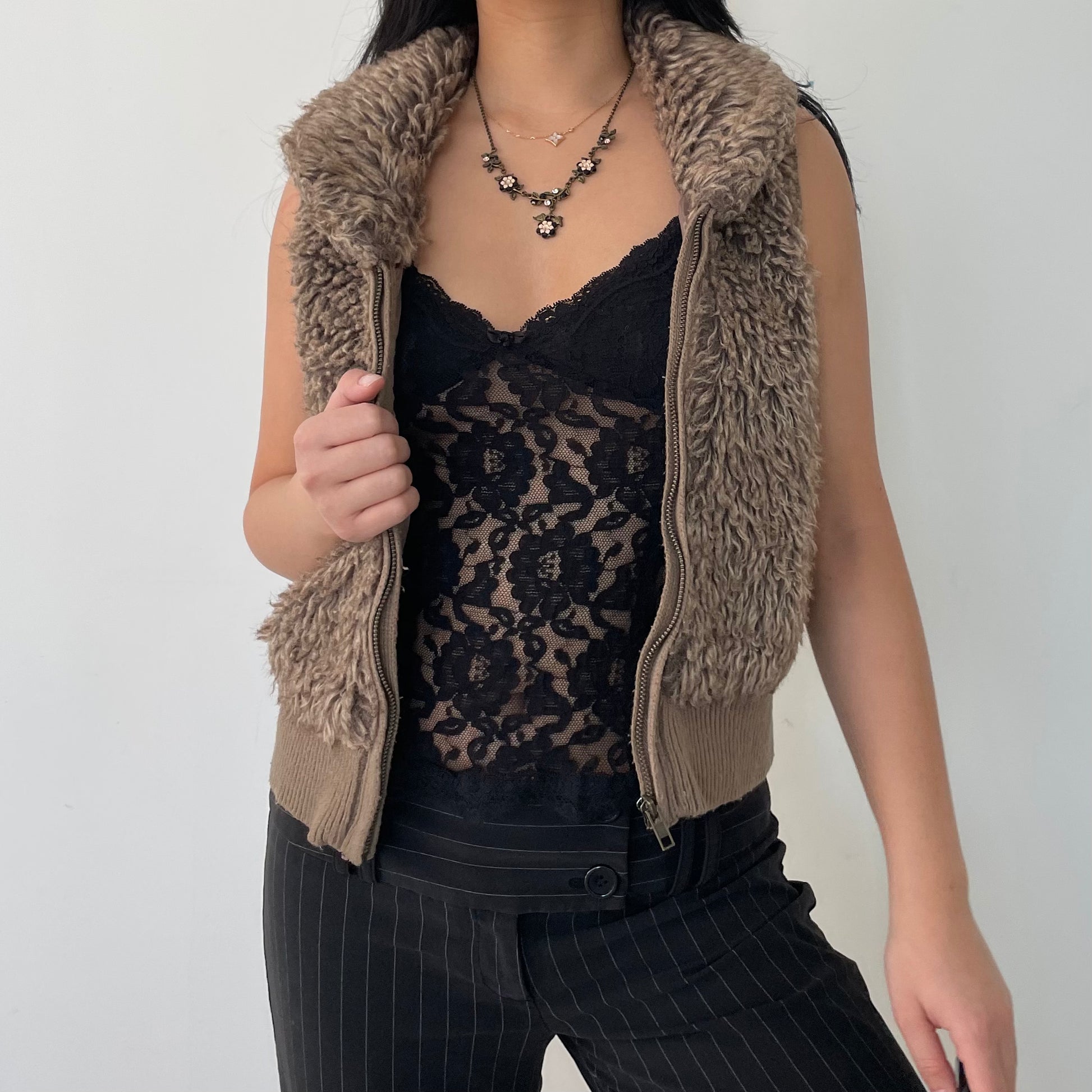 - Details: Brown faux fur zip up vest; ribbed knit back; faux fur collar