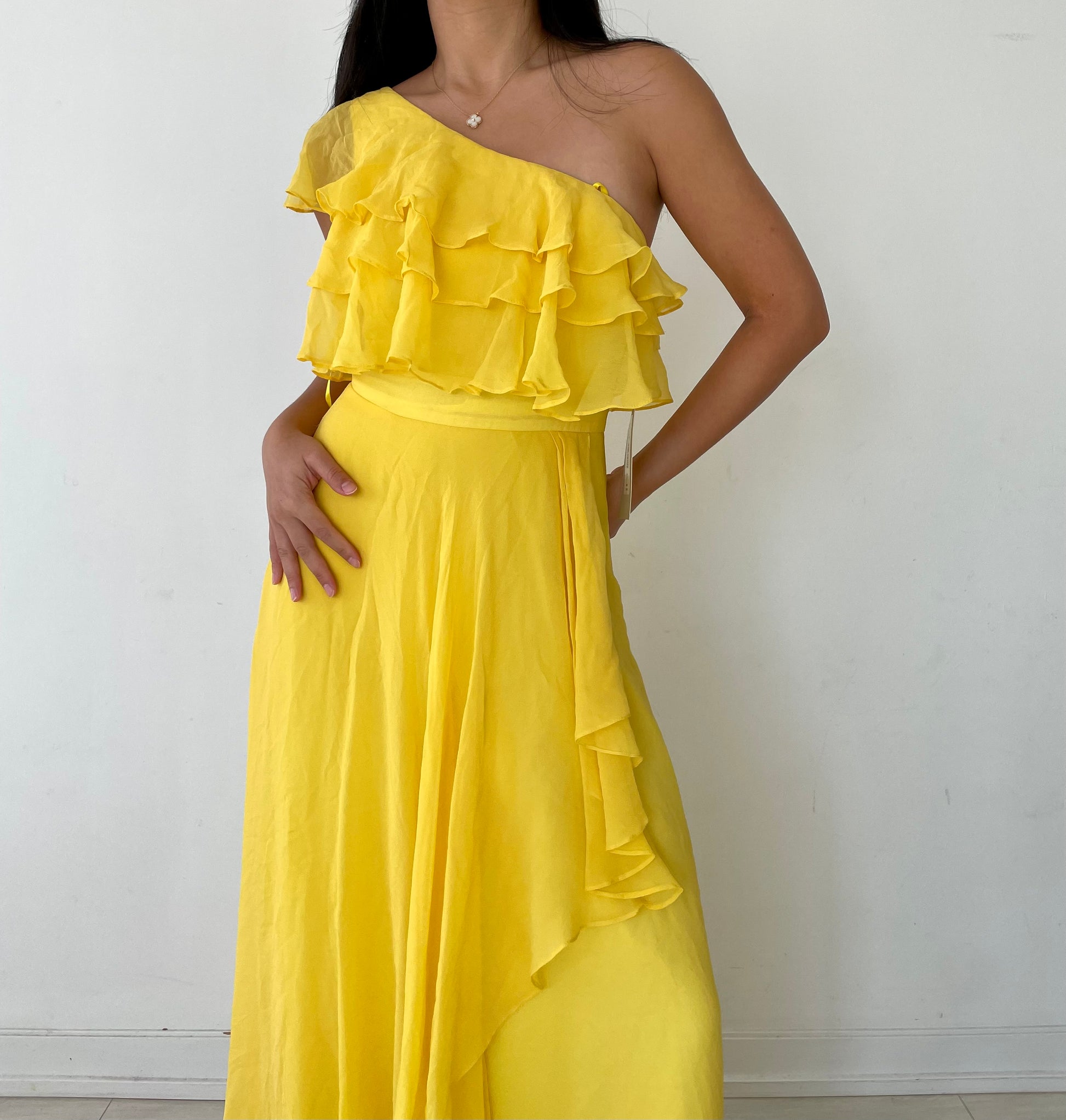 - Details: Exact same shade of yellow as Belle's dress from Beauty and the Beast! One shoulder silk ruffle floor-length gown; double lined