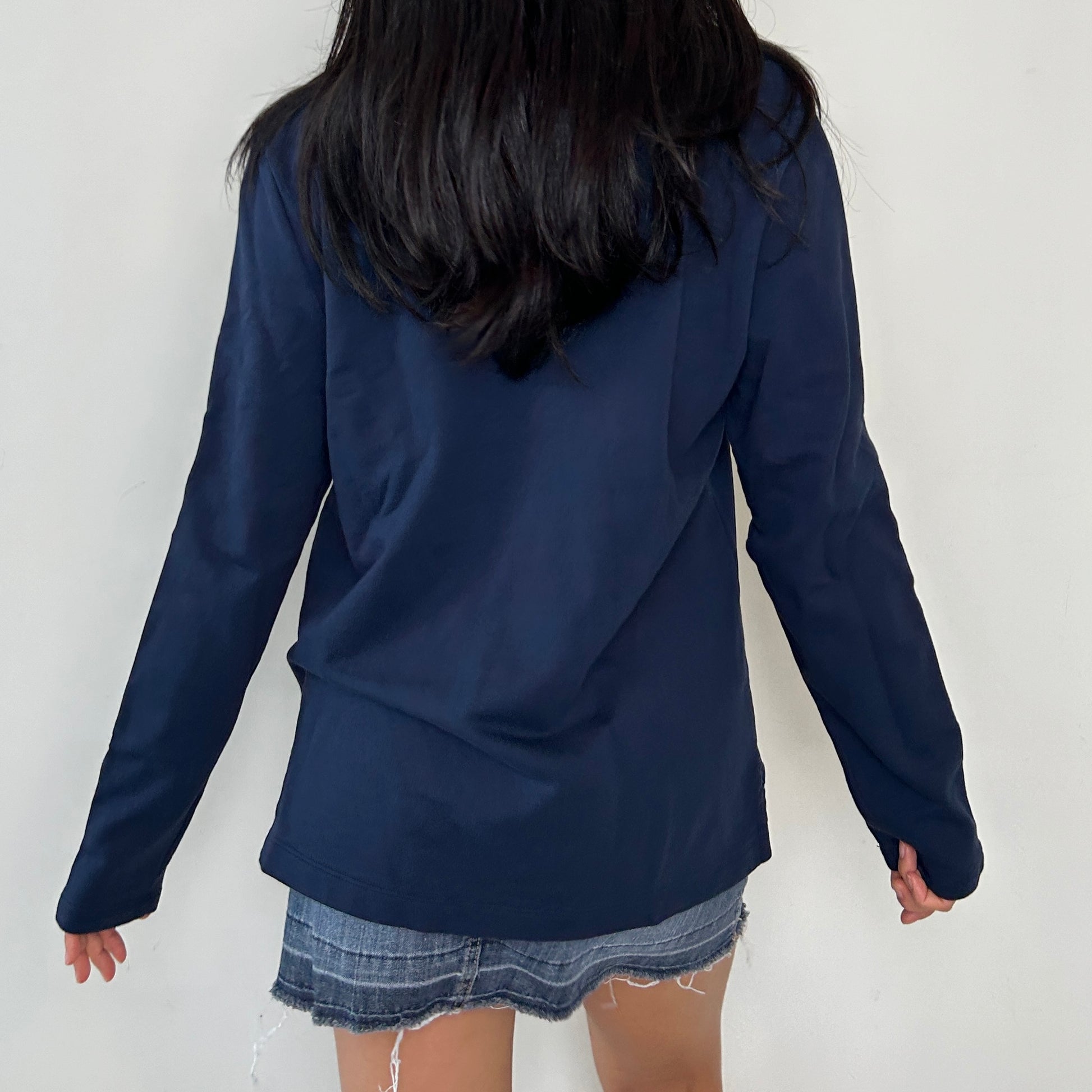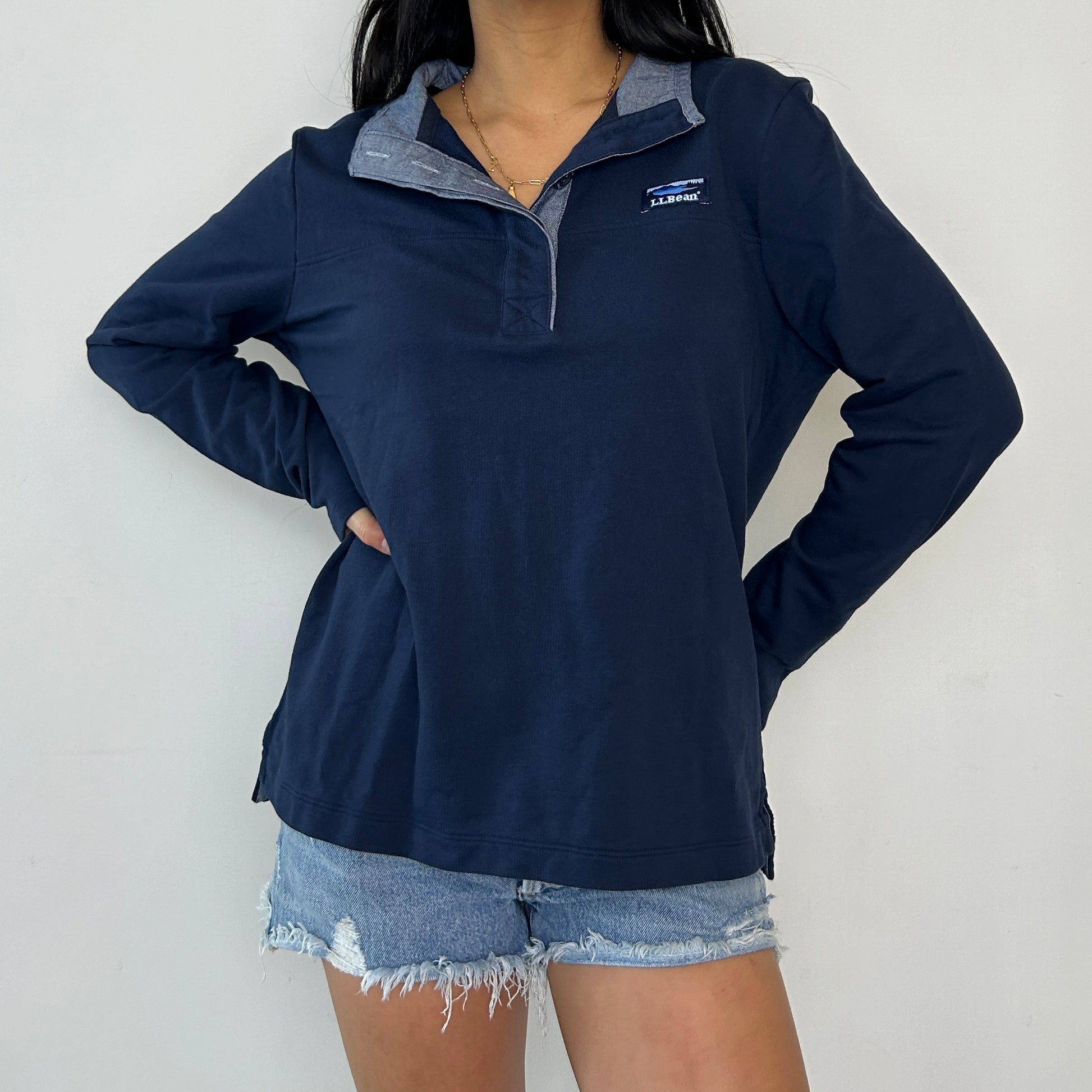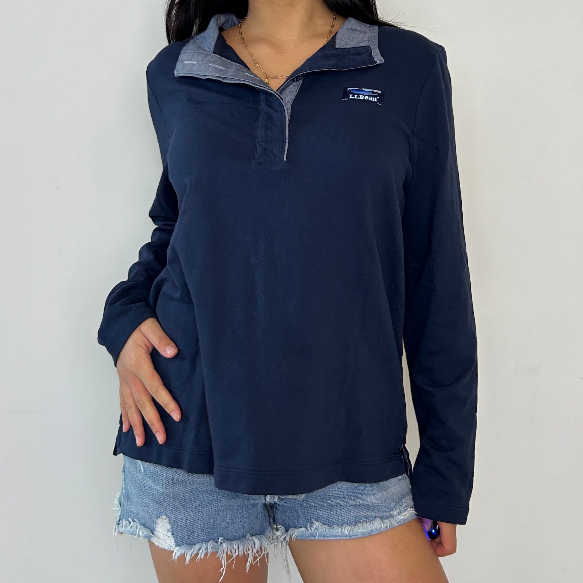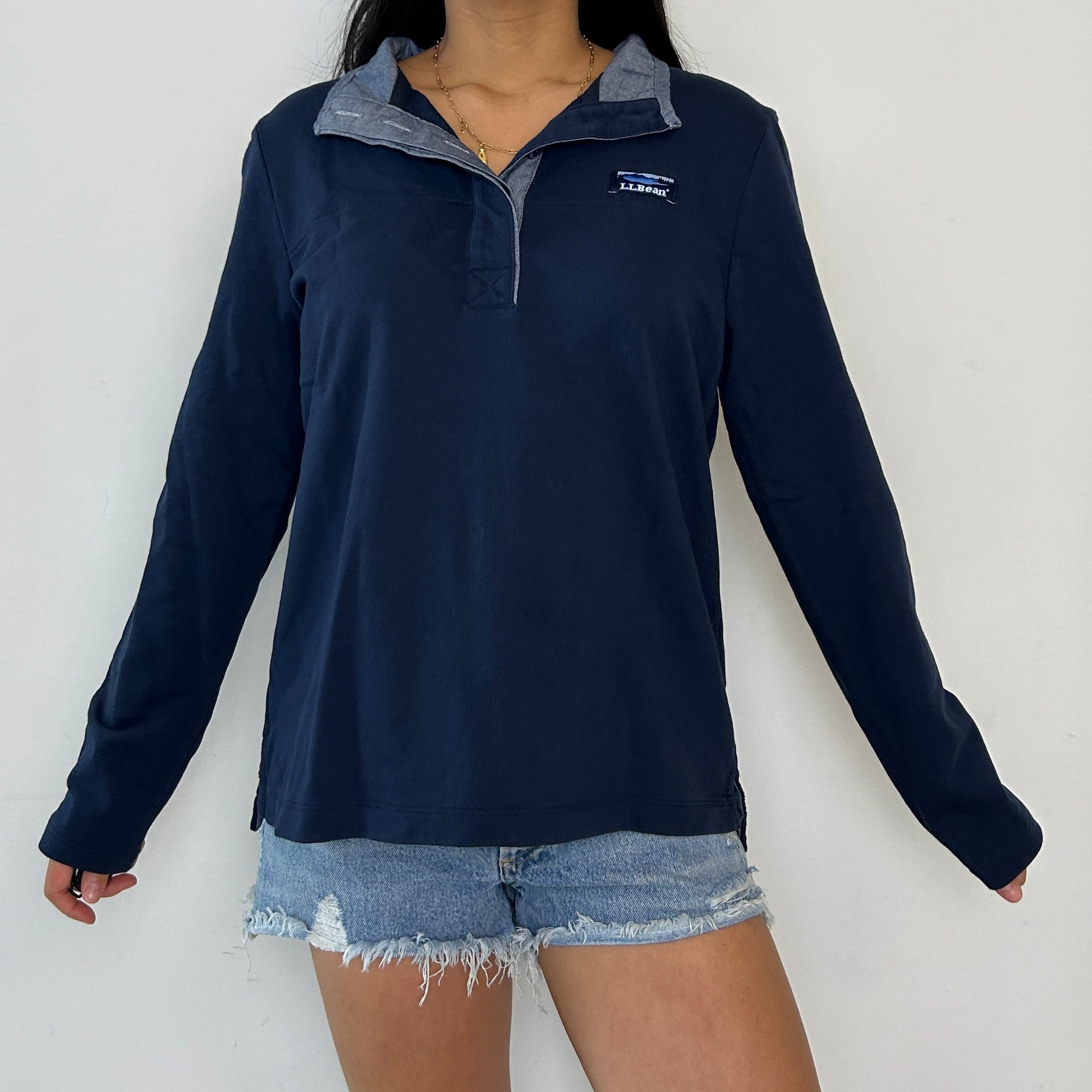 Details: Navy with long sleeves; half-snap placket; pullover; classic L.L. Bean Mount Katahdin logo