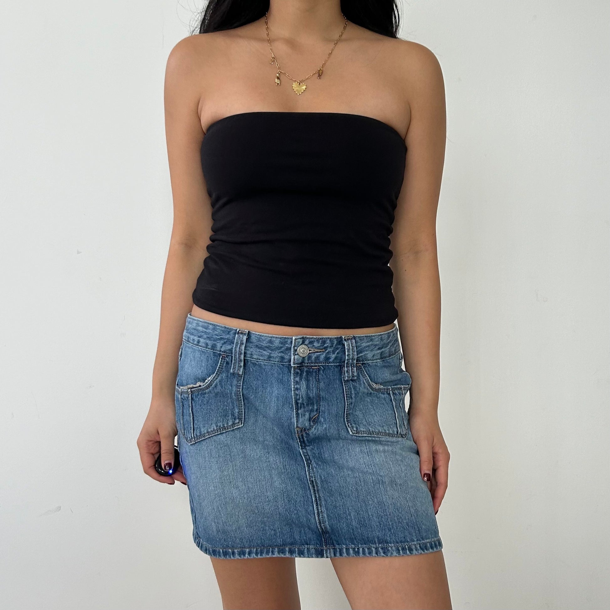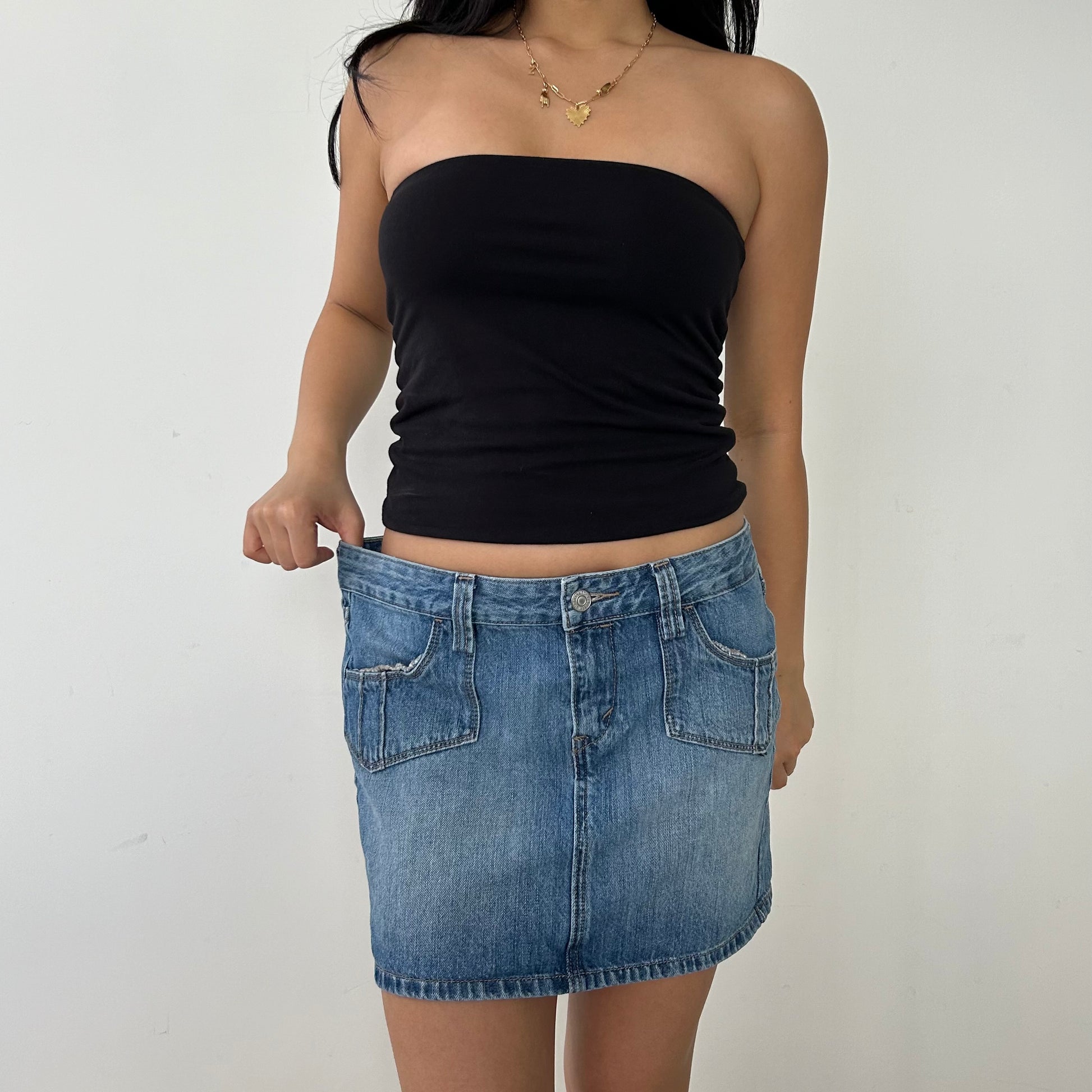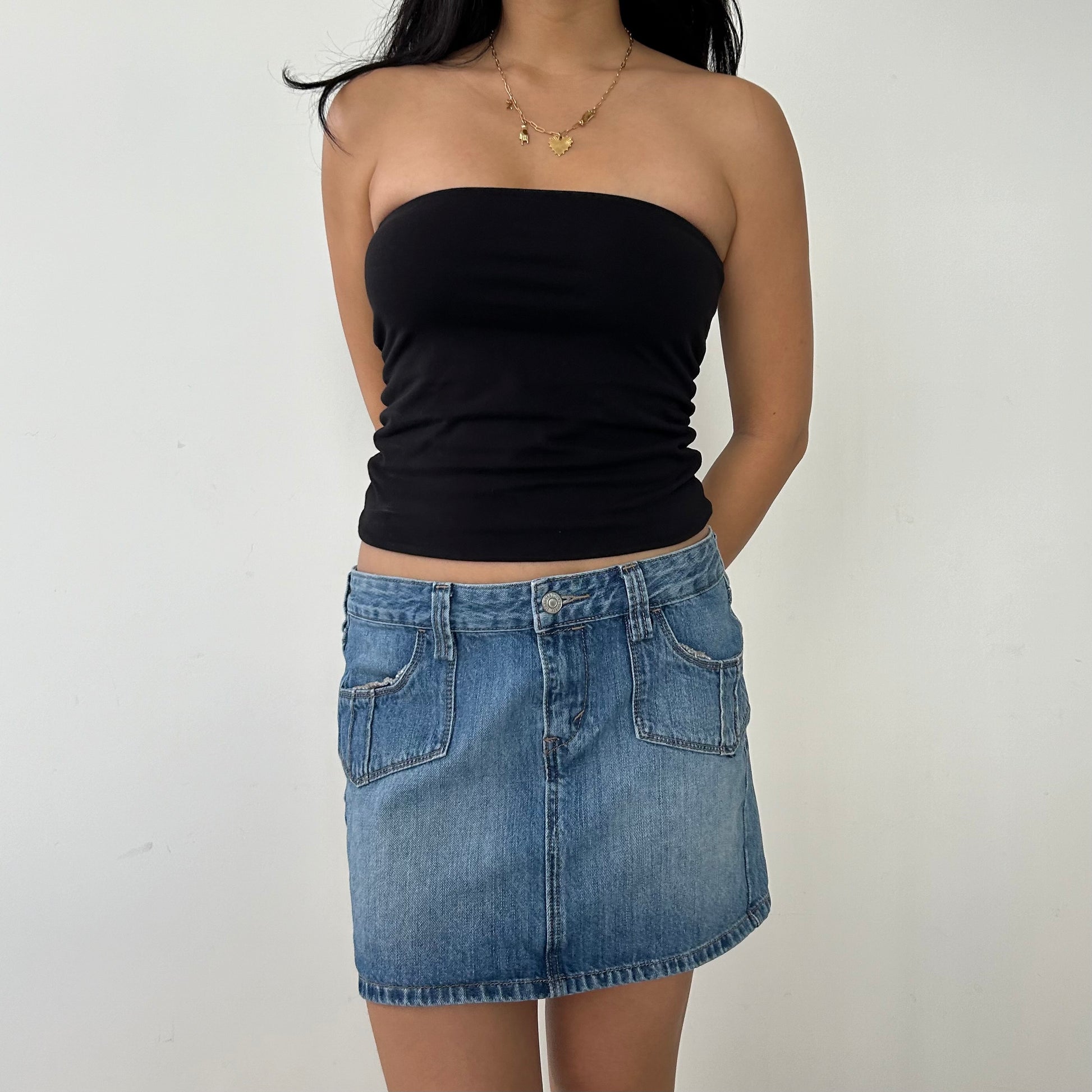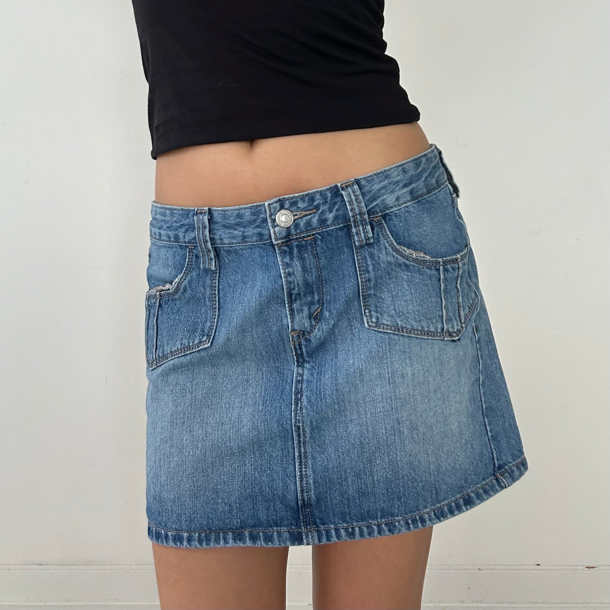- Details: Classic denim mini skirt; belt loops; four pockets