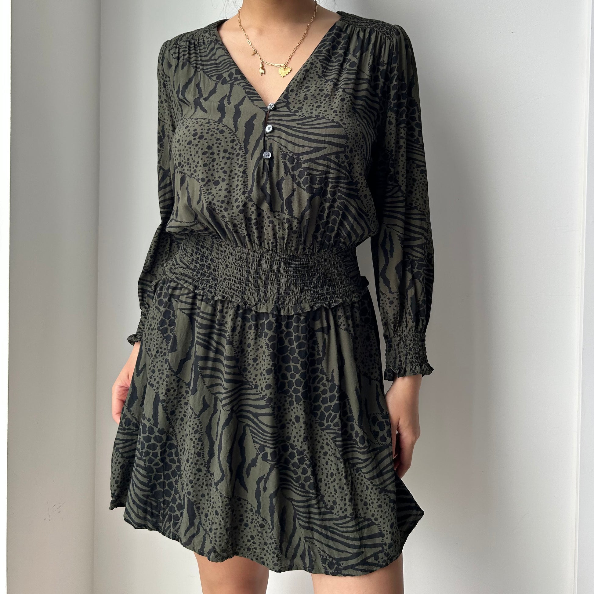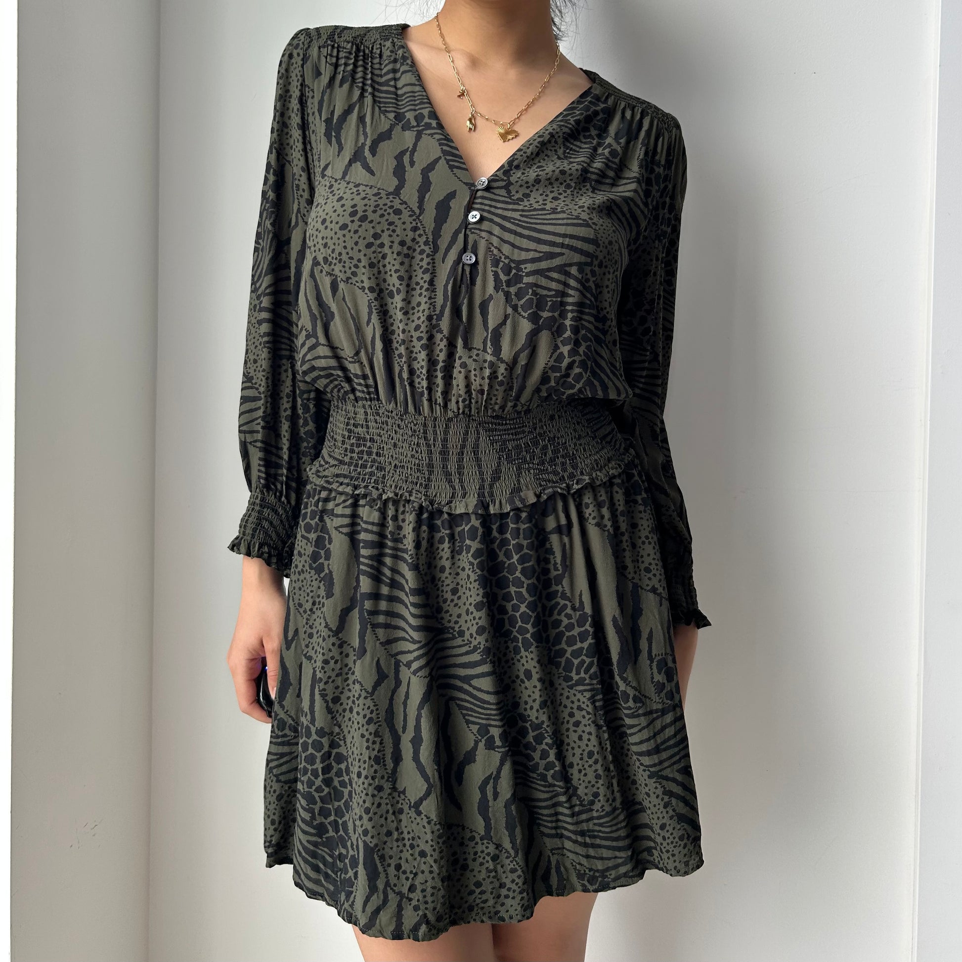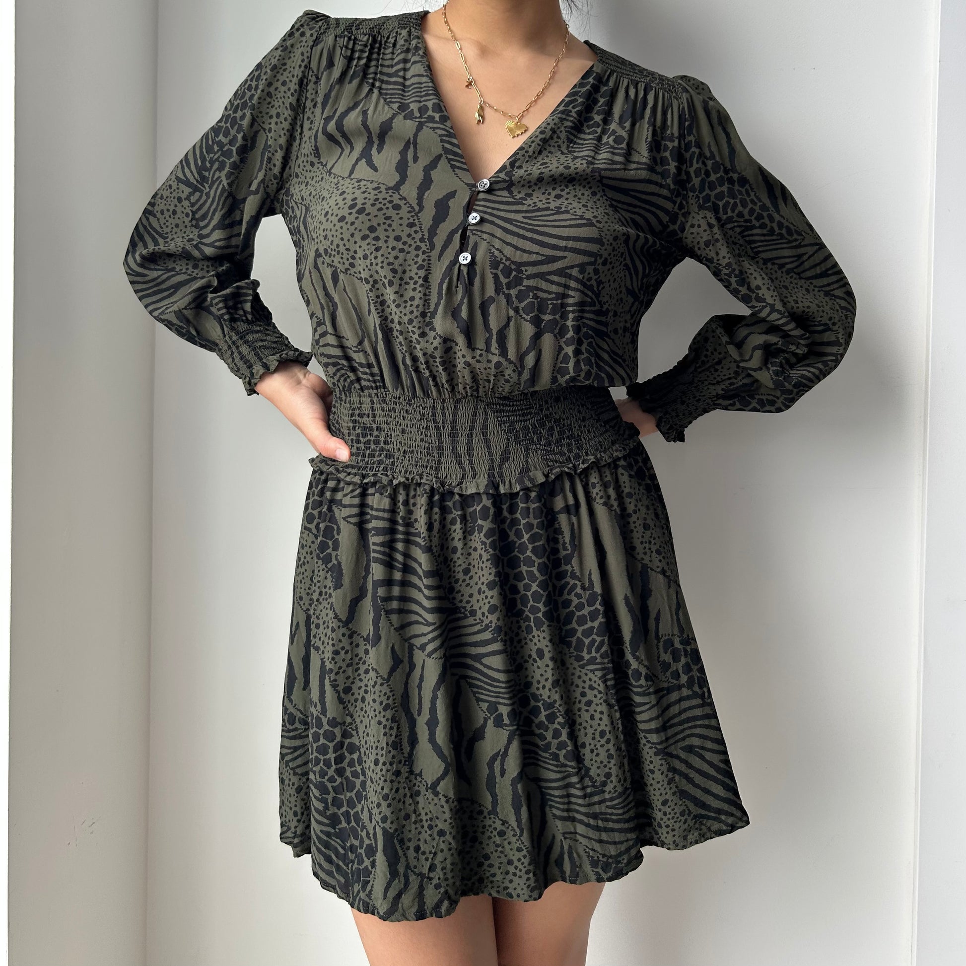 - Details: The 'Zana olive mixed animal stripe' dress; Olive green and black animal print; button front; v-neck; shirred waist; long sleeve mini dress