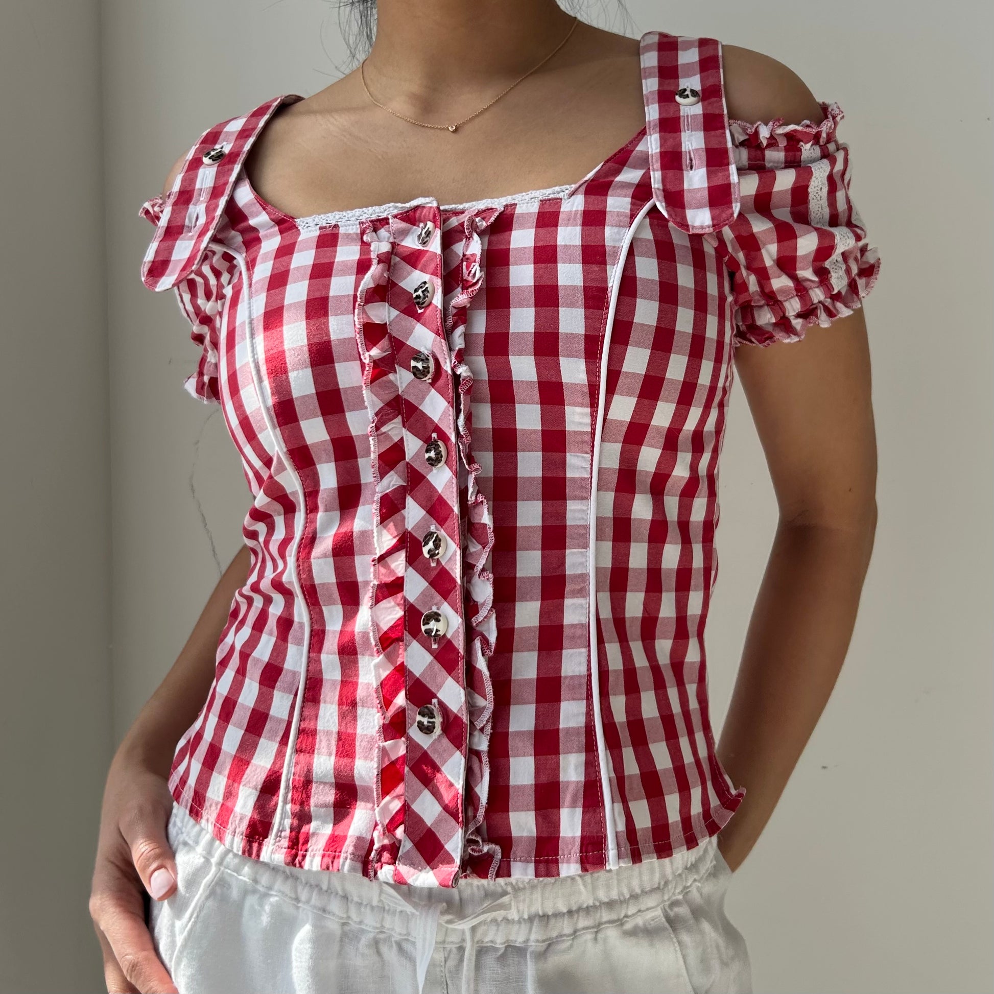 • Details: Red gingham short sleeve cold shoulder blouse; button front closure