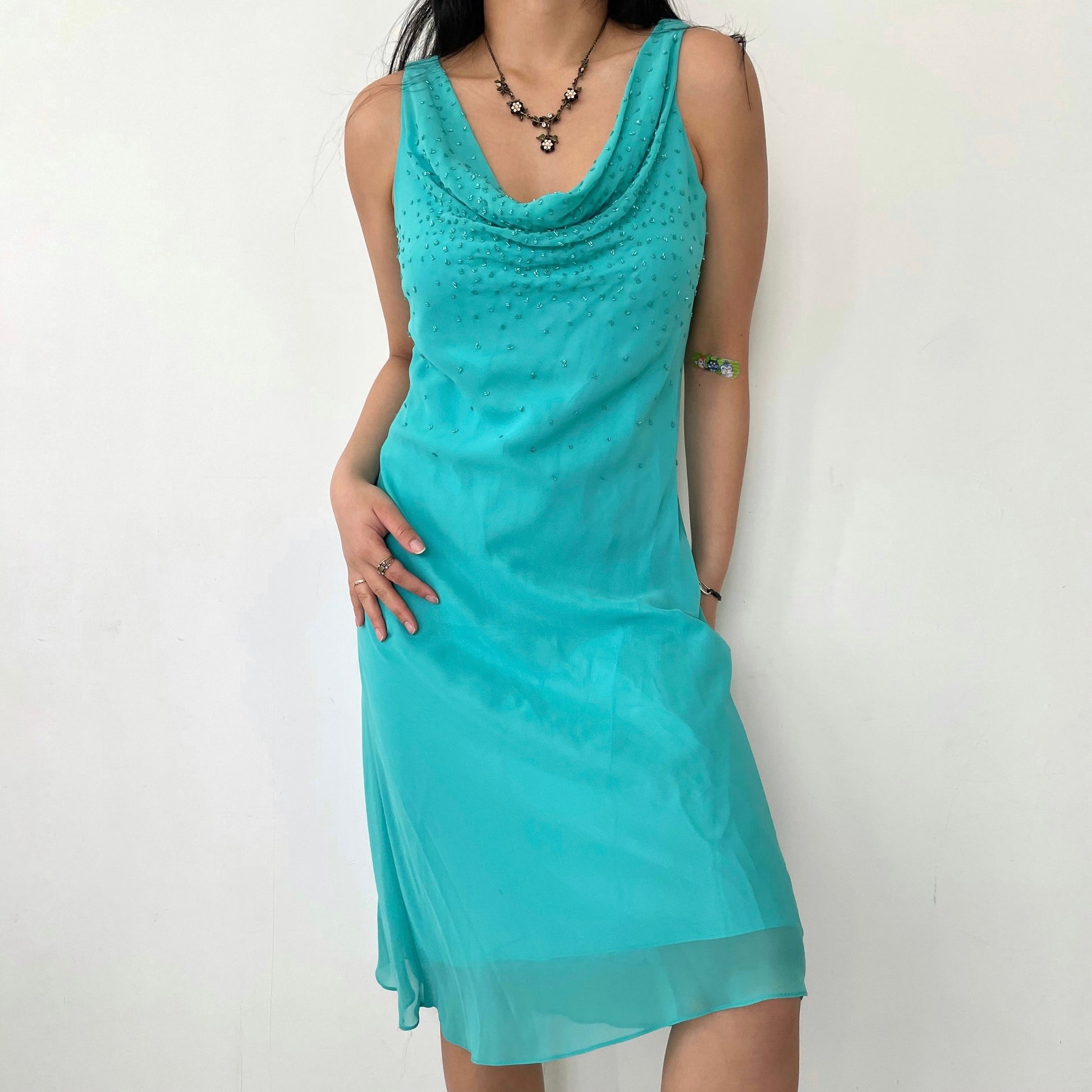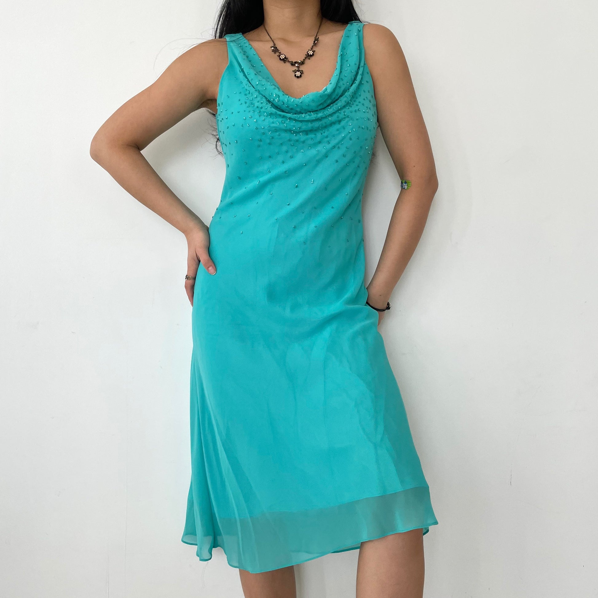 - Details: Sleeveless turquoise midi dress with beading on the neckline; cowl neck on the front; no zipper