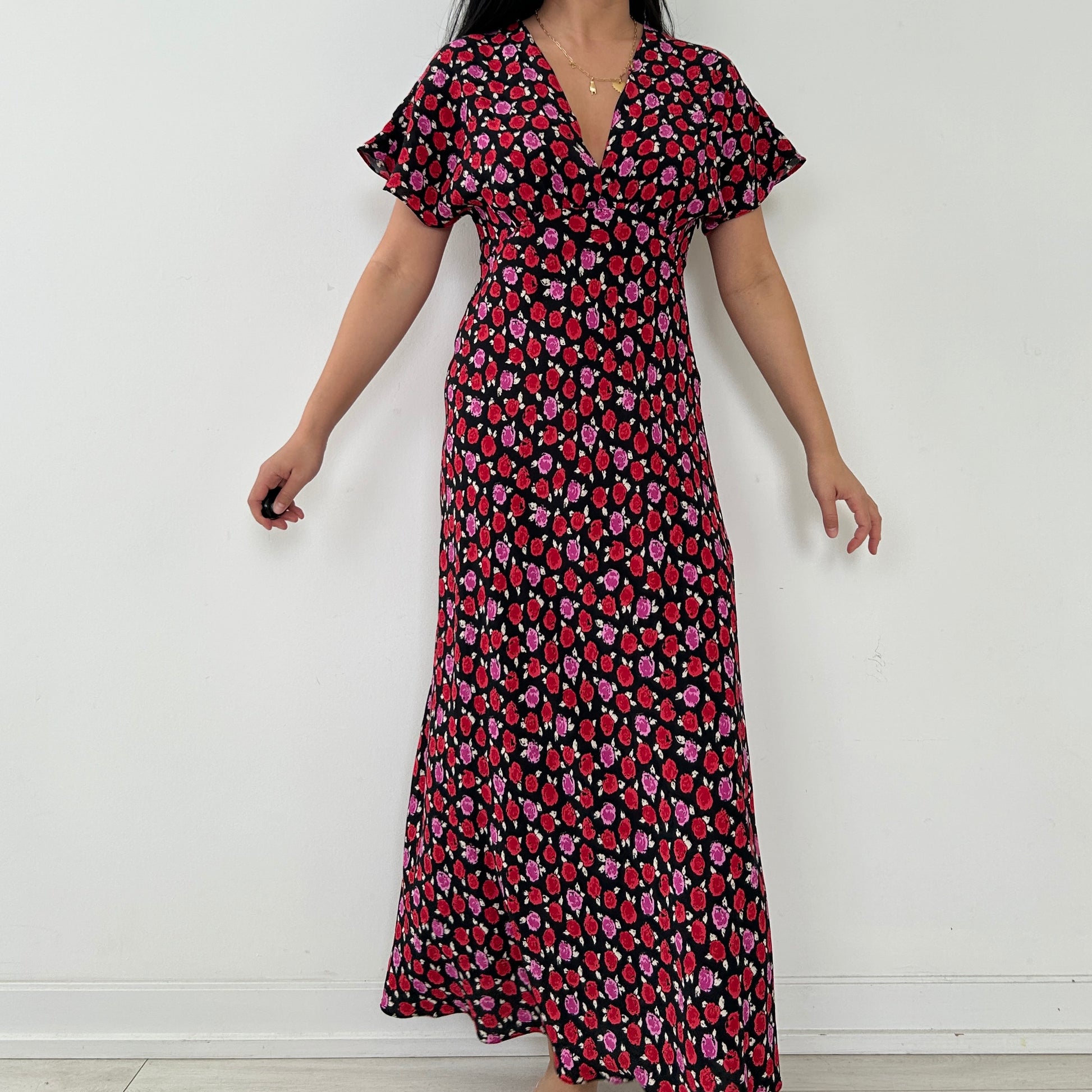 - Details: Short sleeve maxi dress with red, pink, and black rose print; v-neck; concealed side zip