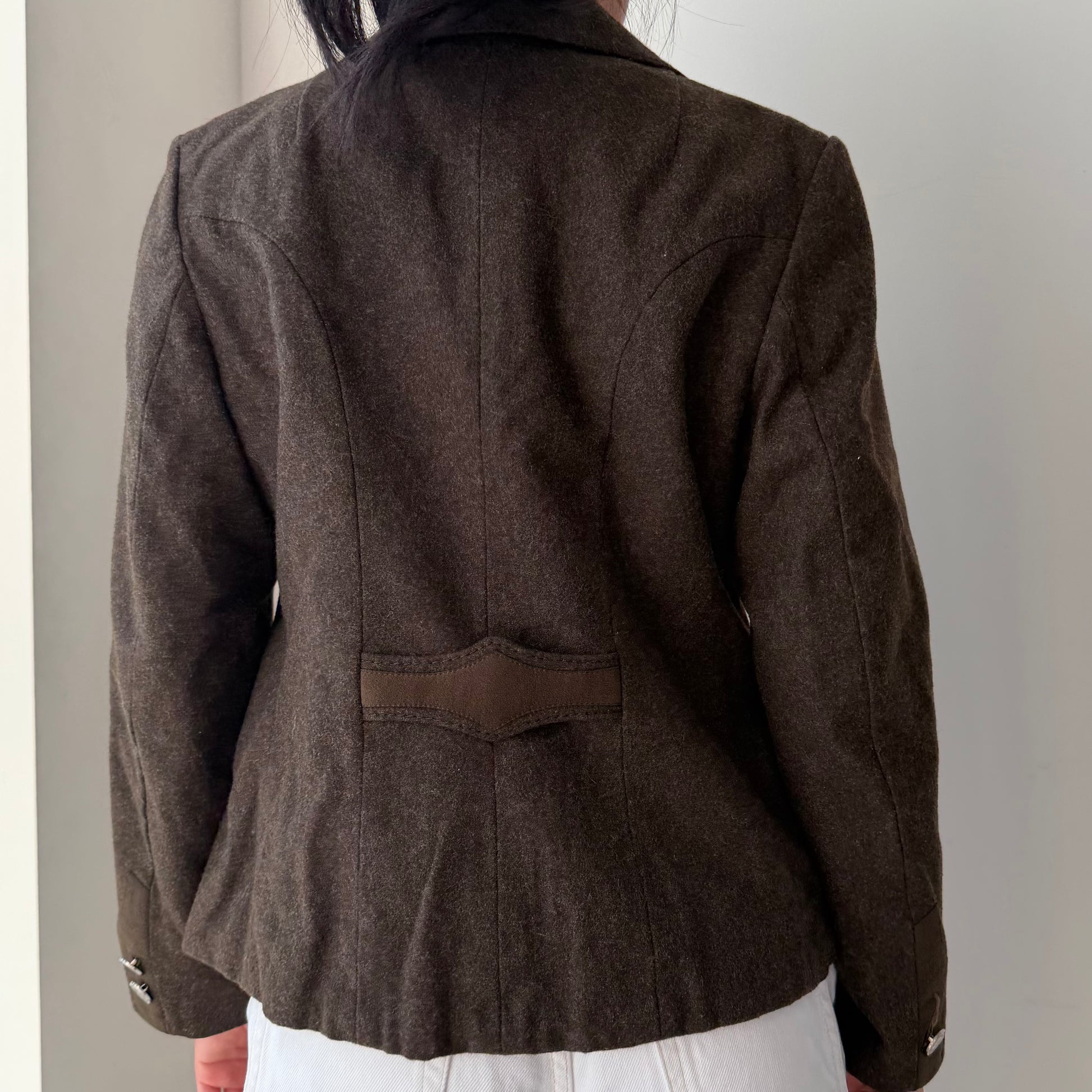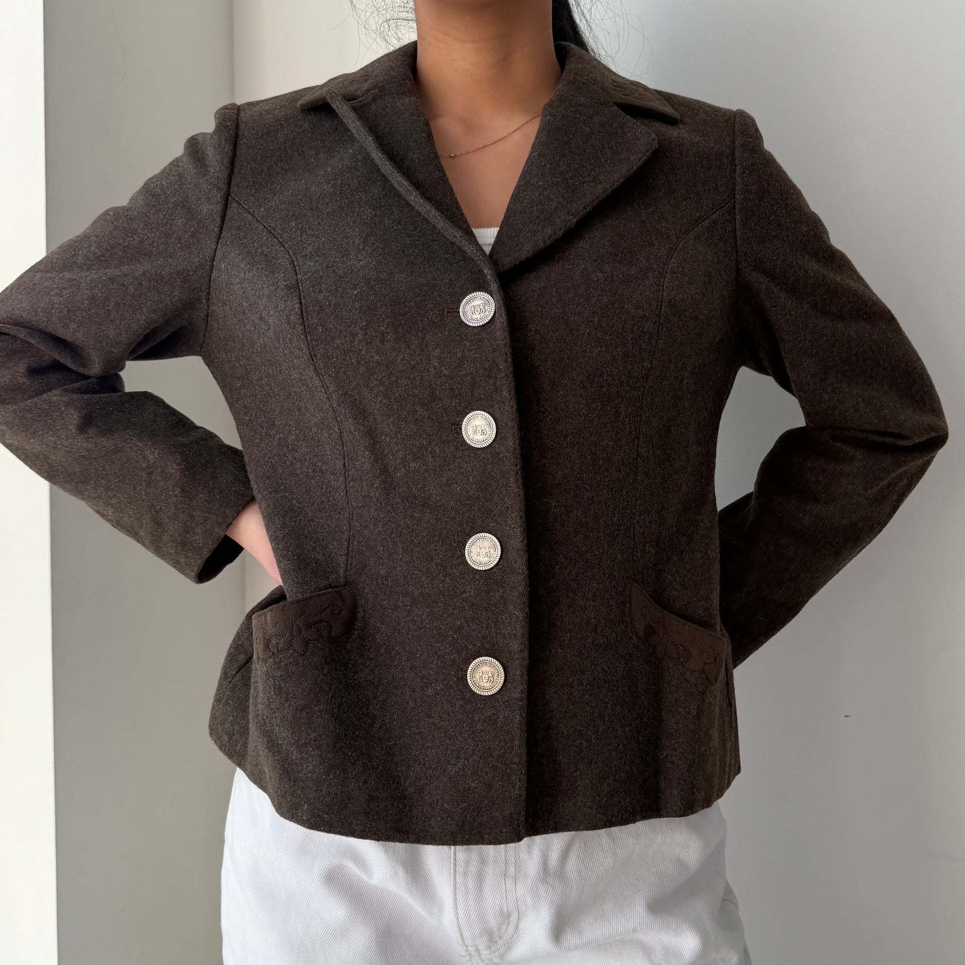 Details: Vintage West German Trachten-style wool blazer in brown; notched lapels with four silver-tone embossed buttons; curved seams, darting, flap pockets with trim; fully lined