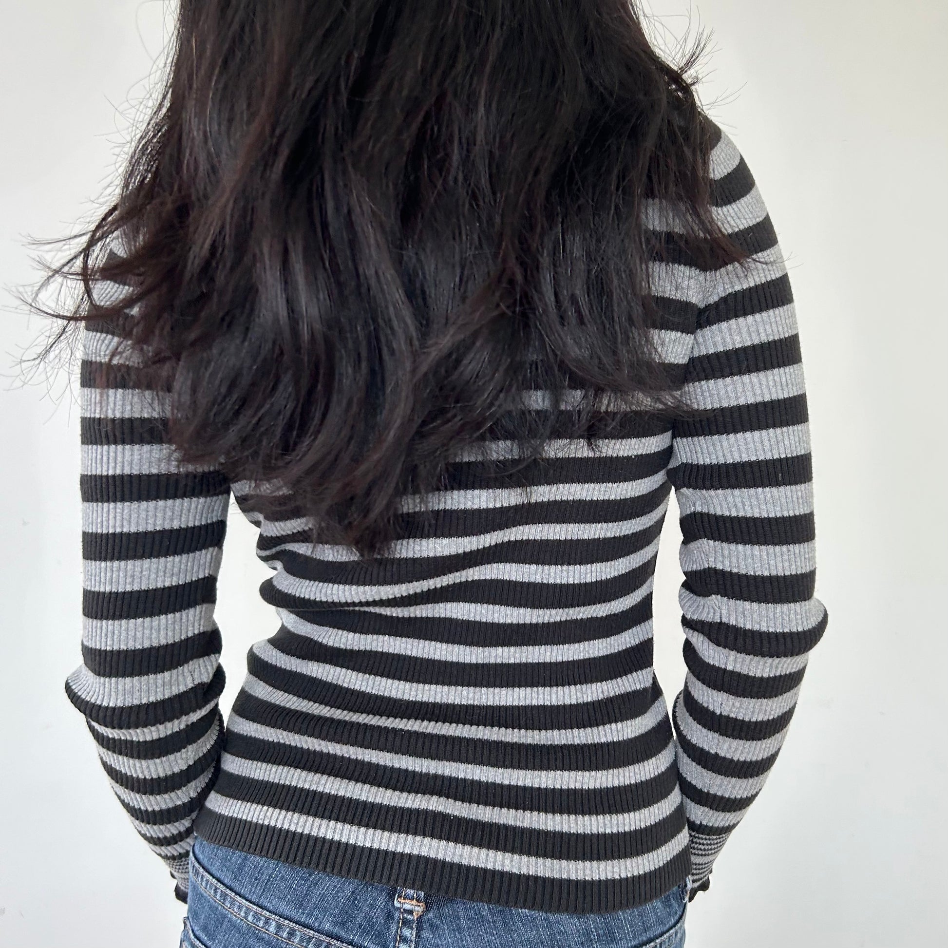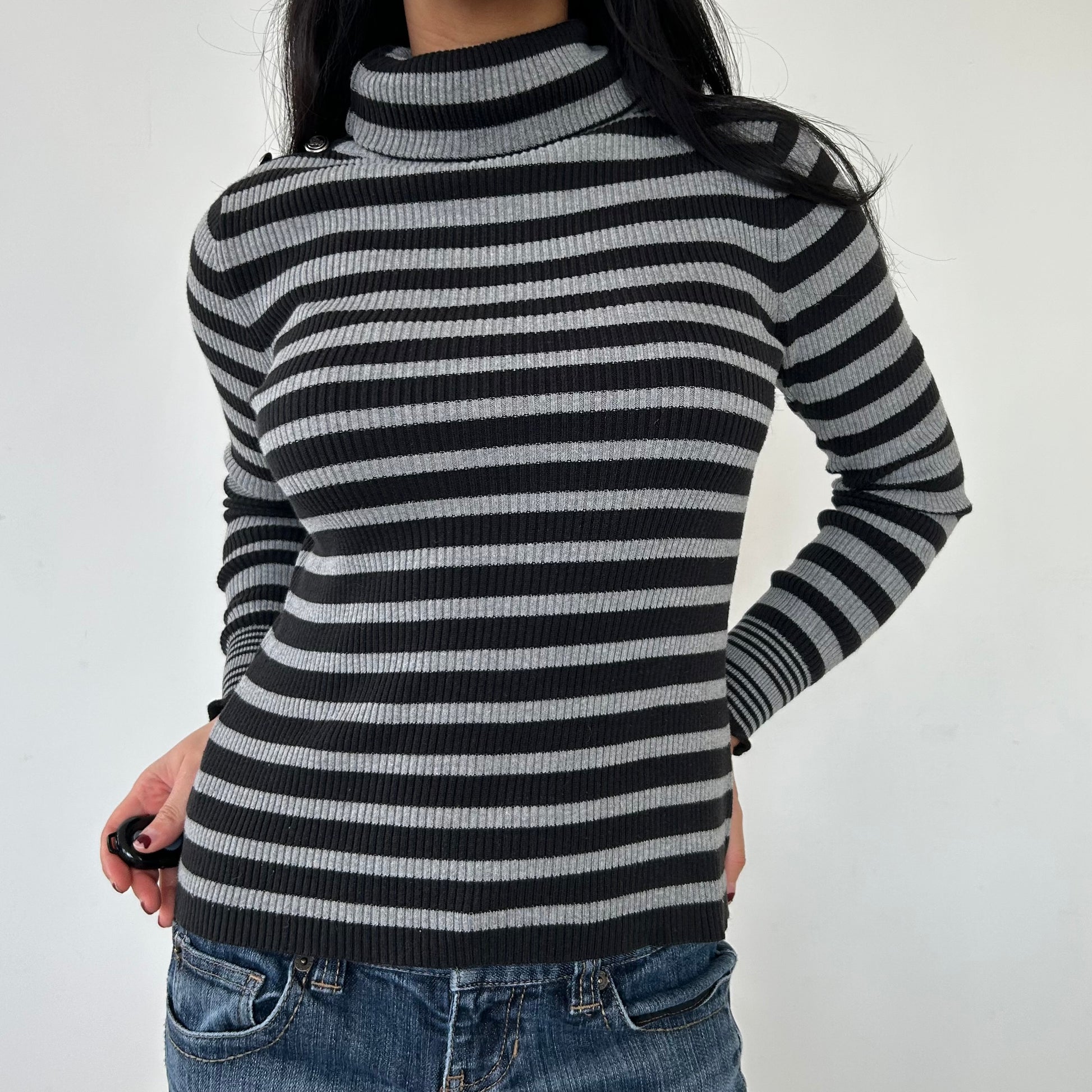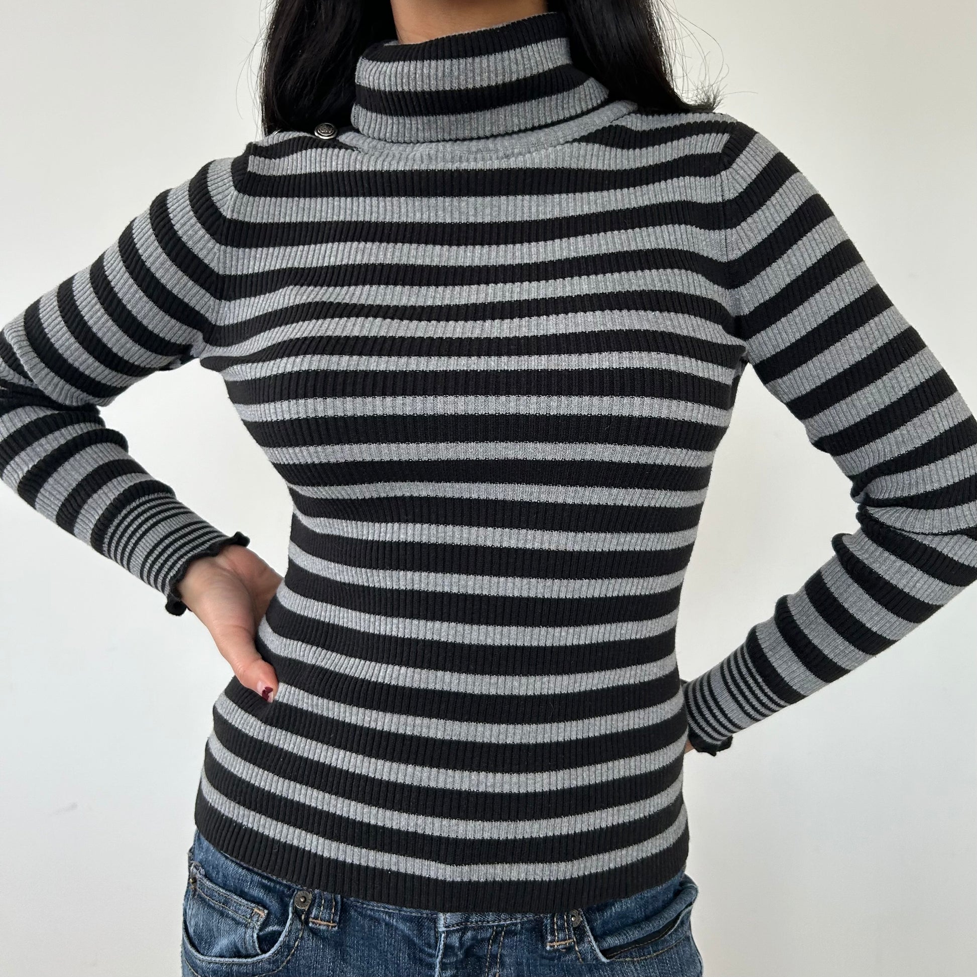 - Details: Black and grey horizontal striped turtleneck top; long sleeves; silver button details on the neck