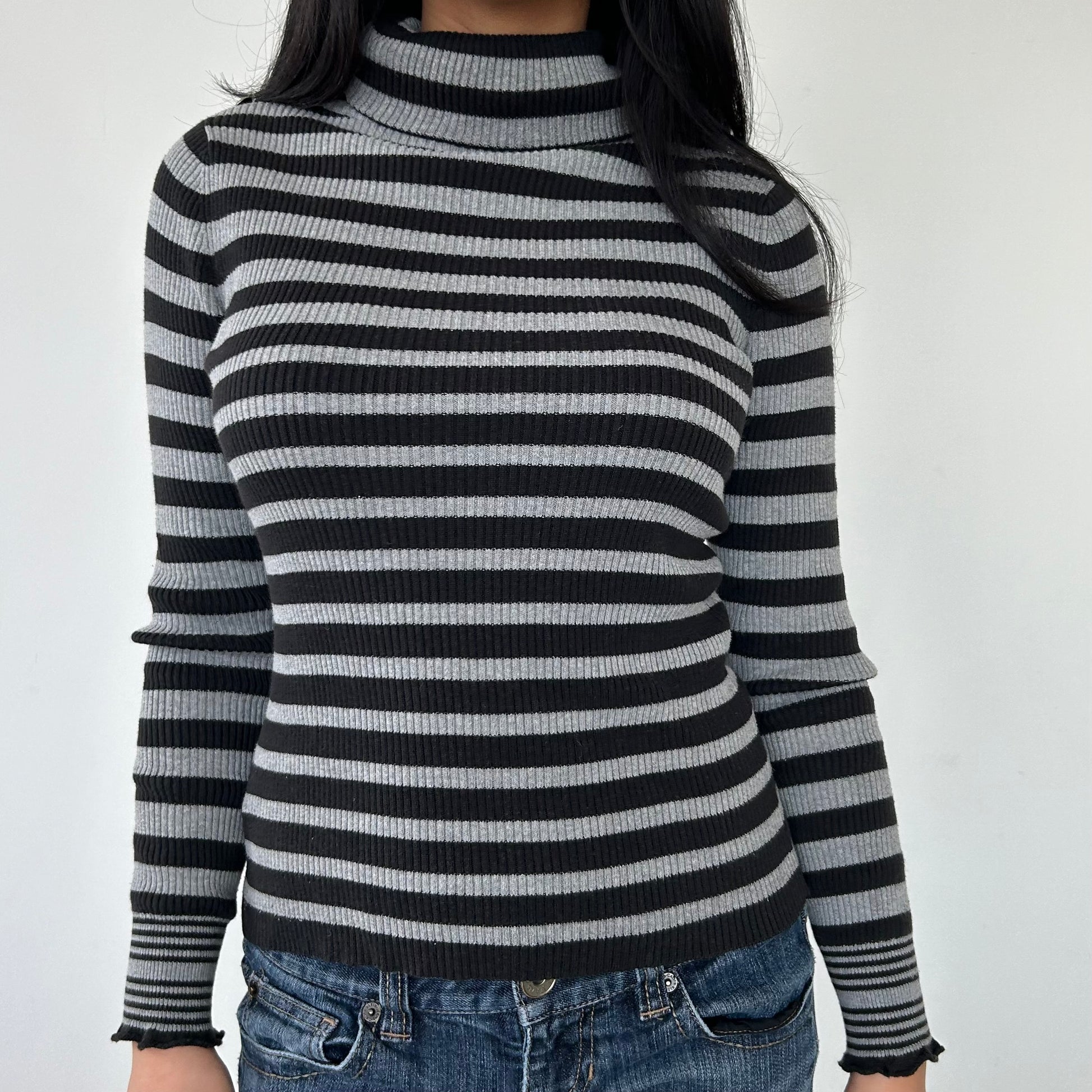 Black and Grey Striped Ribbed Knit Turtleneck Top - Medium