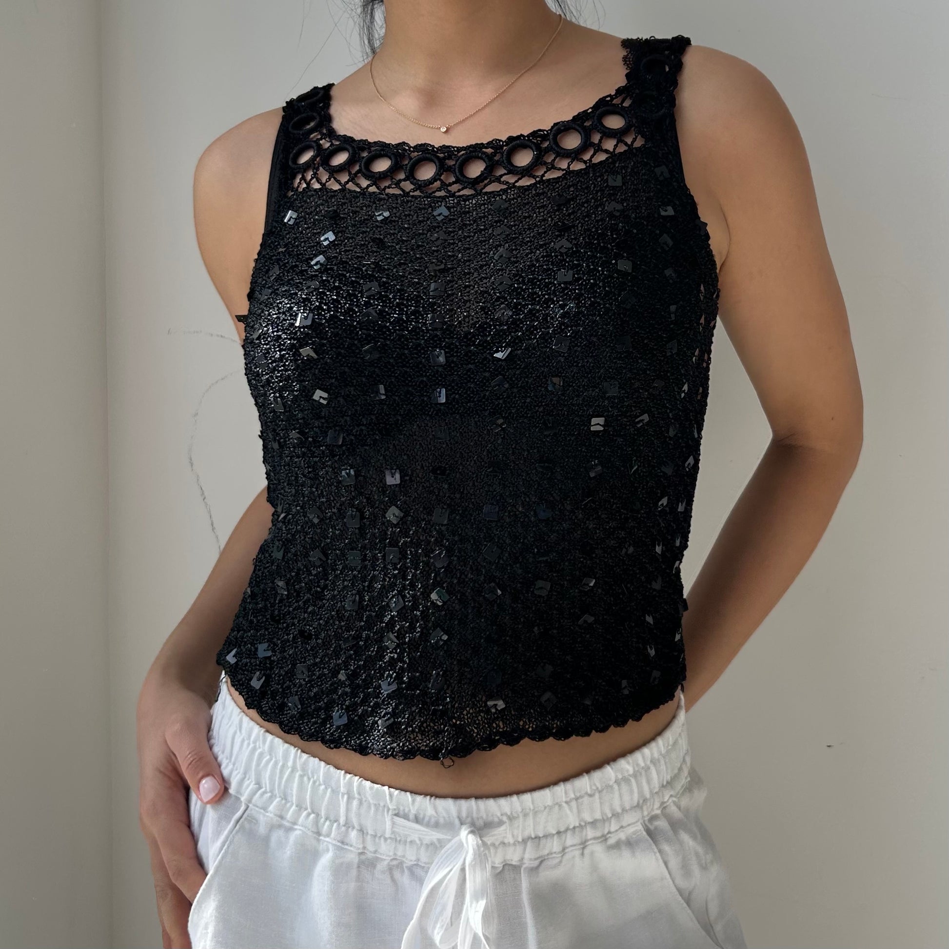 - Details: Black sleeveless crochet knit tank; circle details and neckline; square sequin embellishment at front