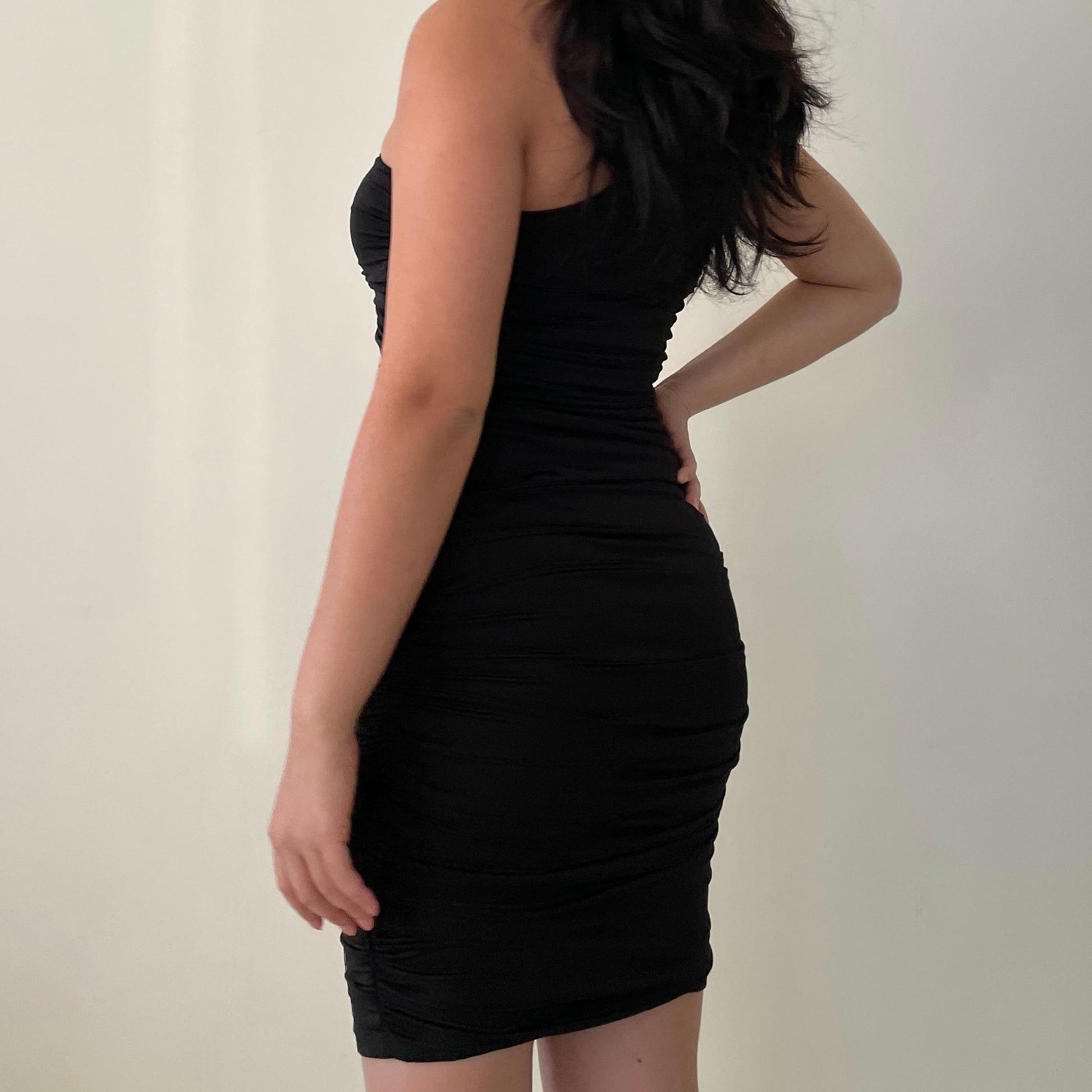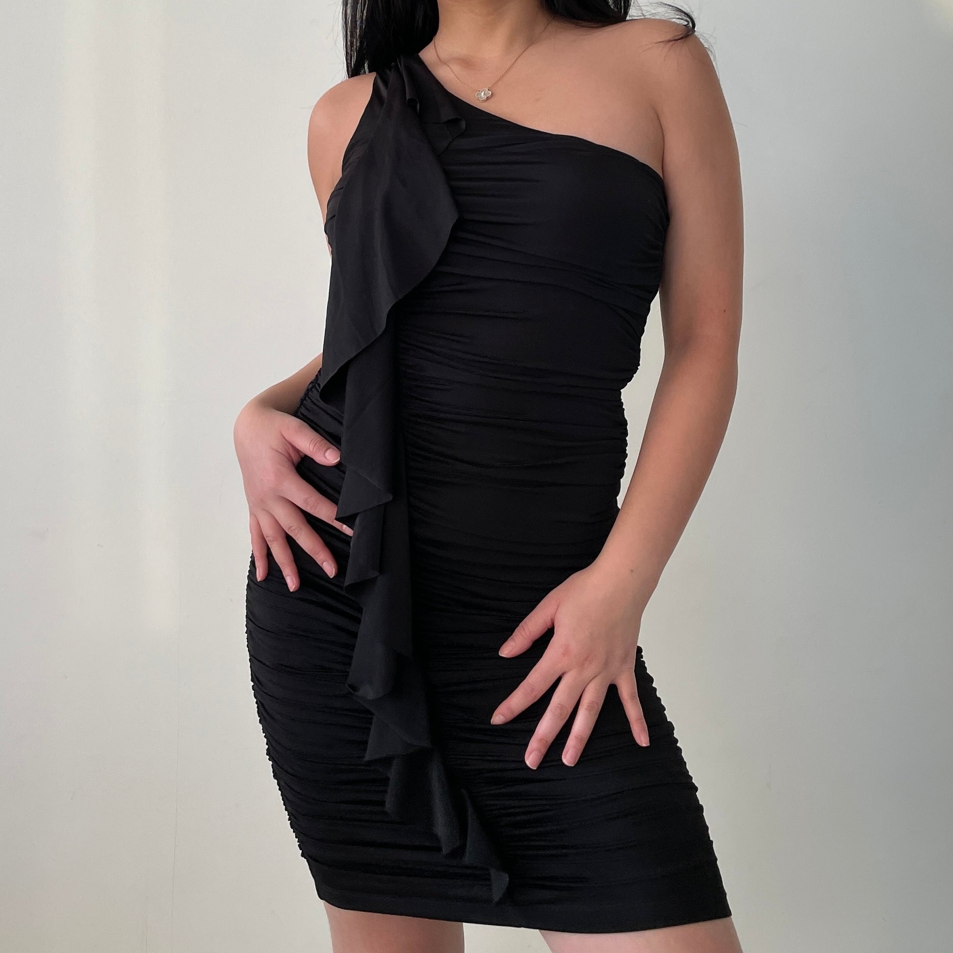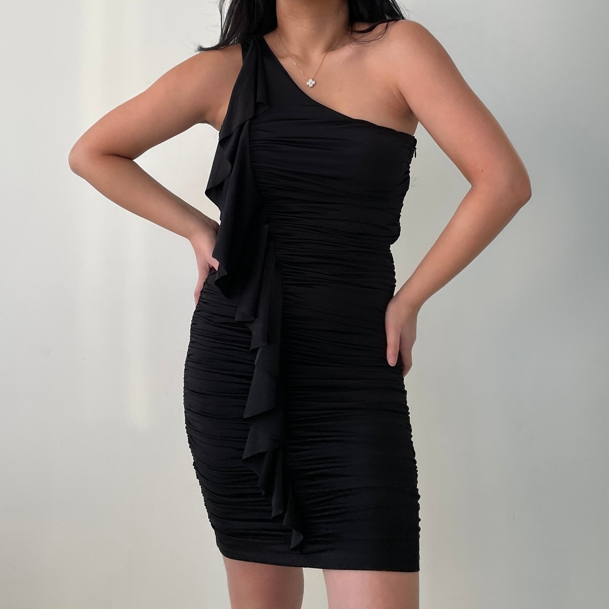 - Details: Bodycon fit; one shoulder mini dress; concealed side zip; very flattering ruching on the body and ruffles along the side of the dress; double lined; thick stretchy material
