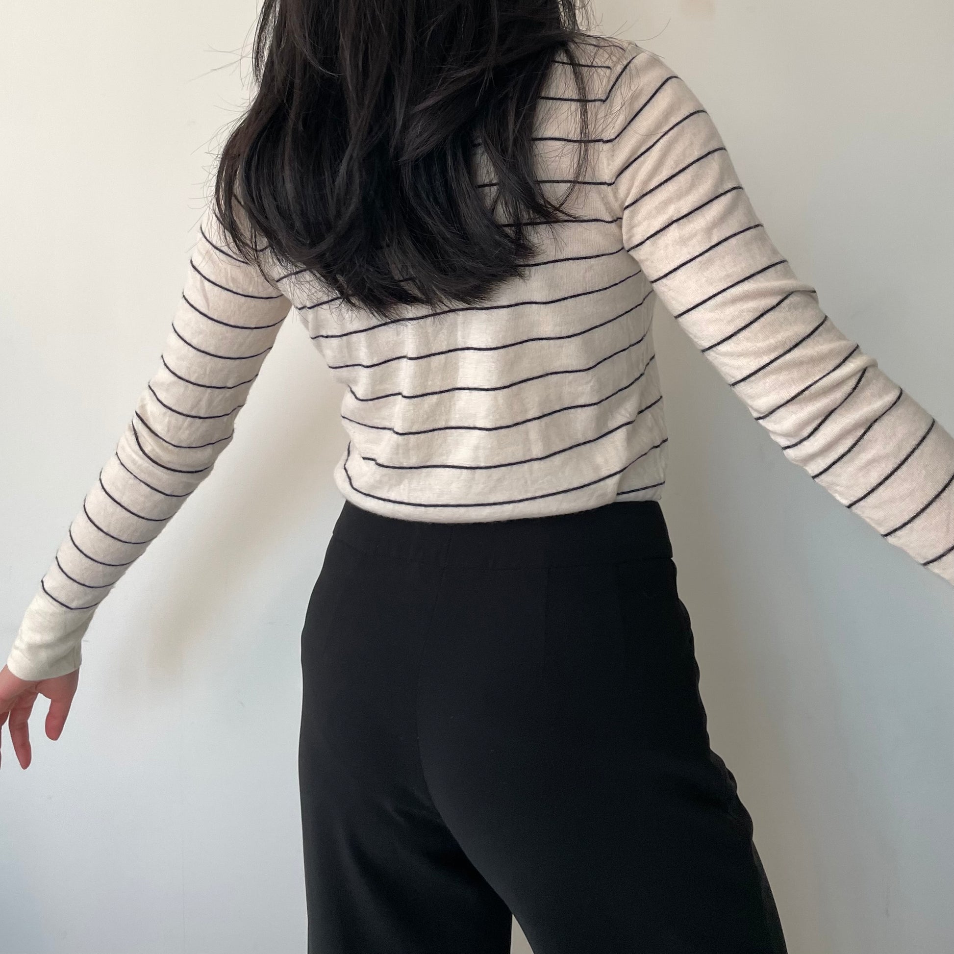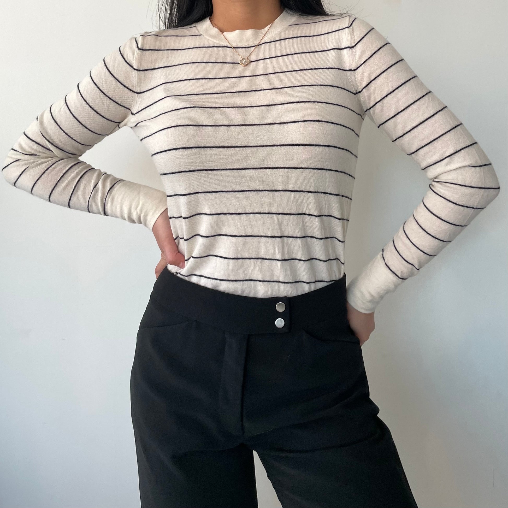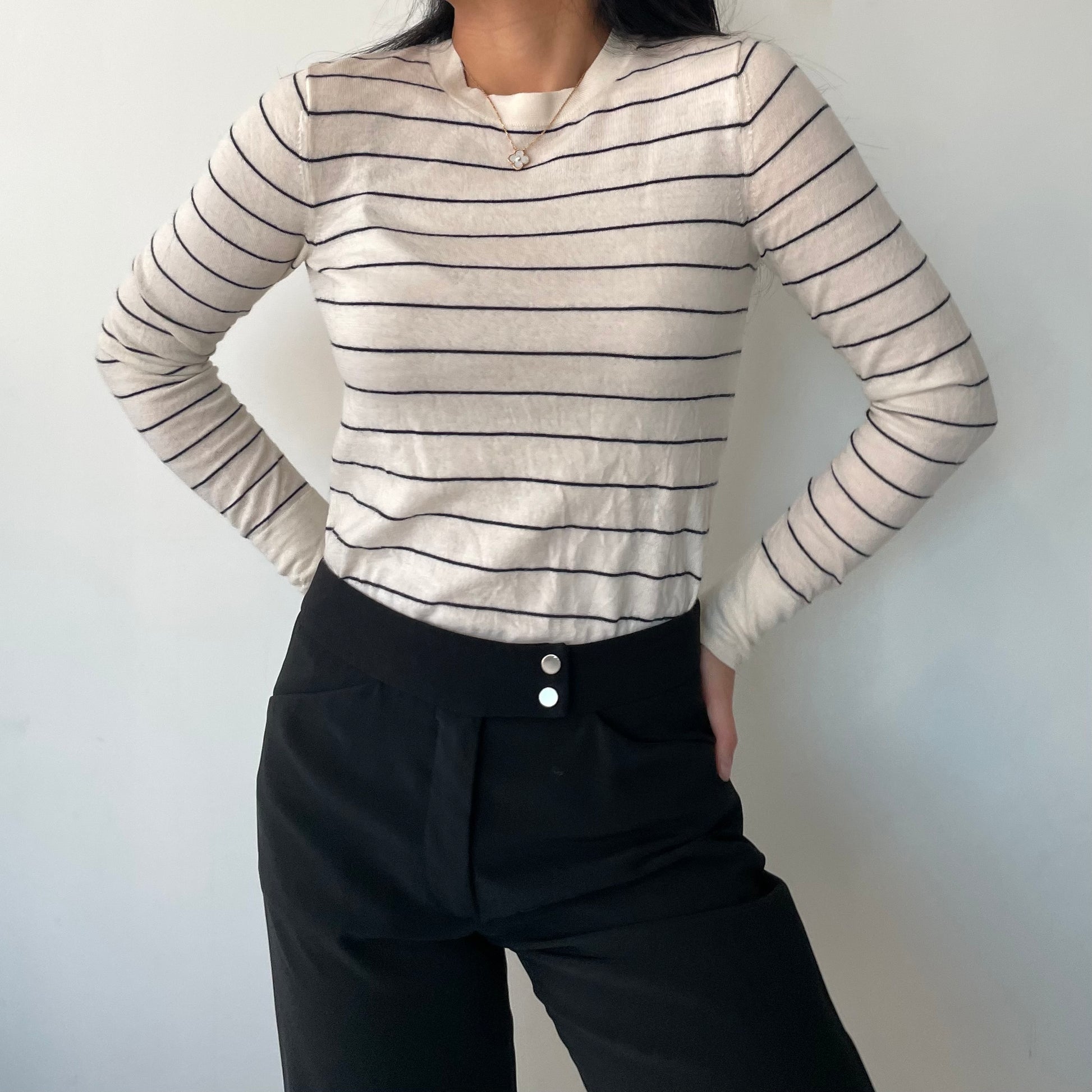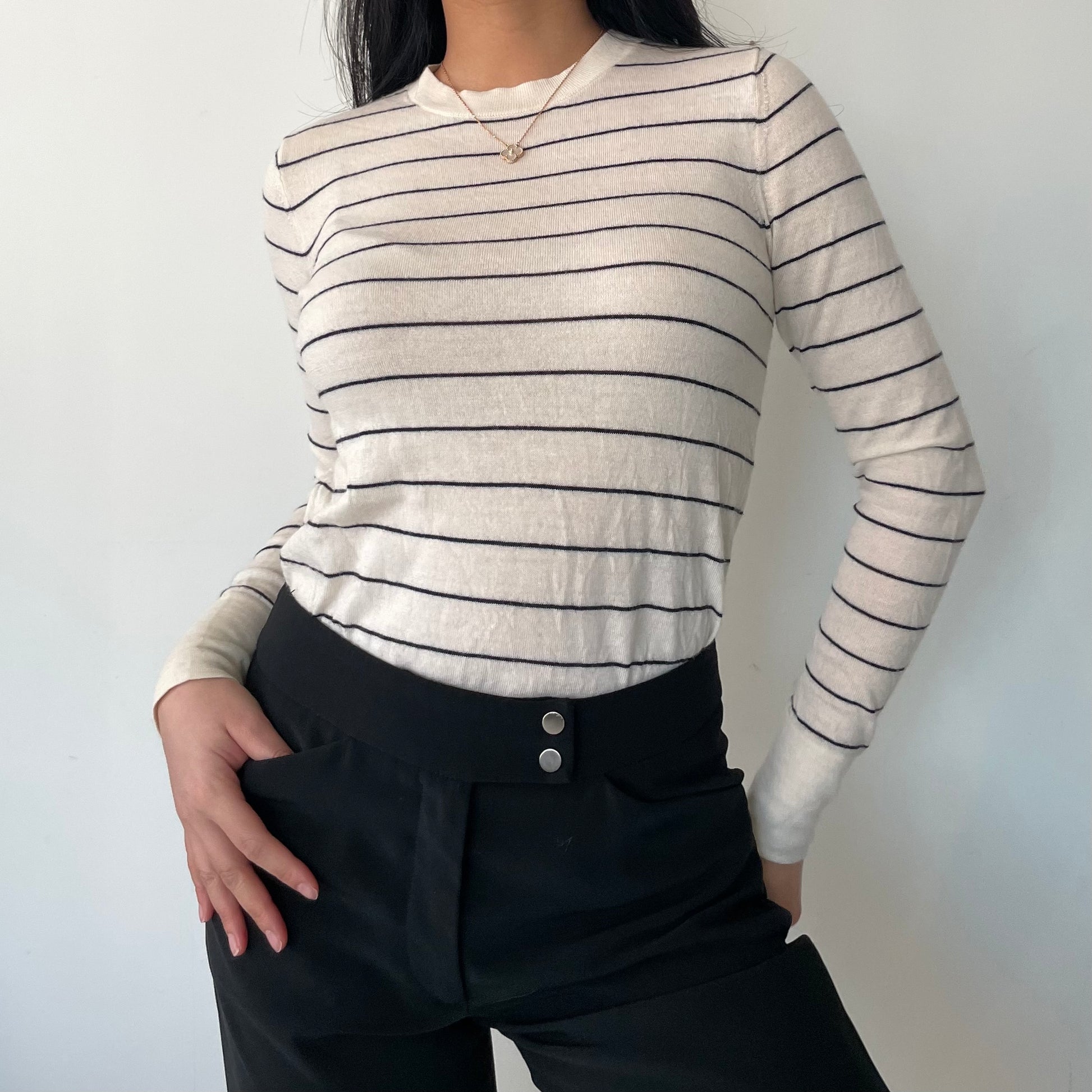 - Details: Cream crewneck wool long sleeve wool knit with thin white stripes