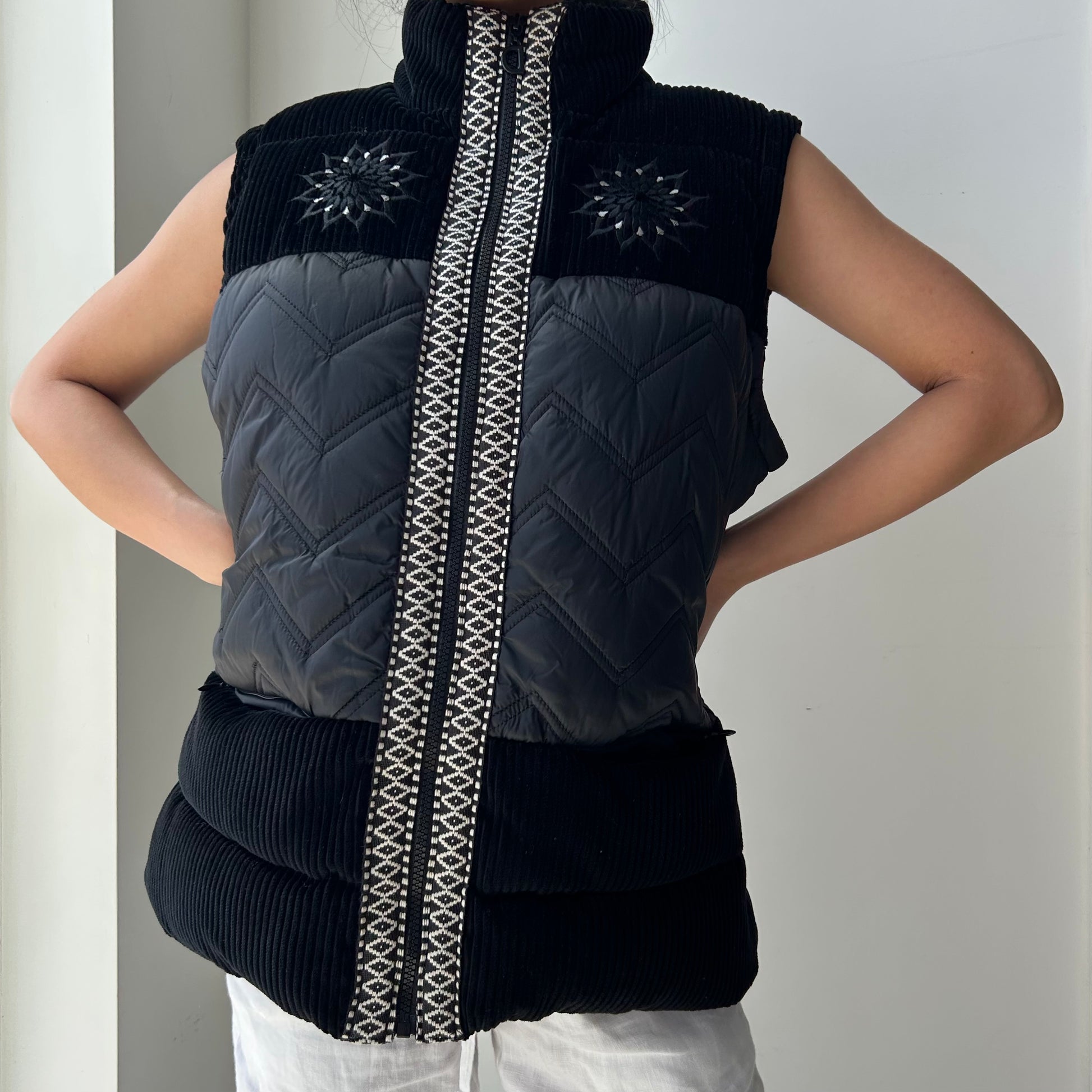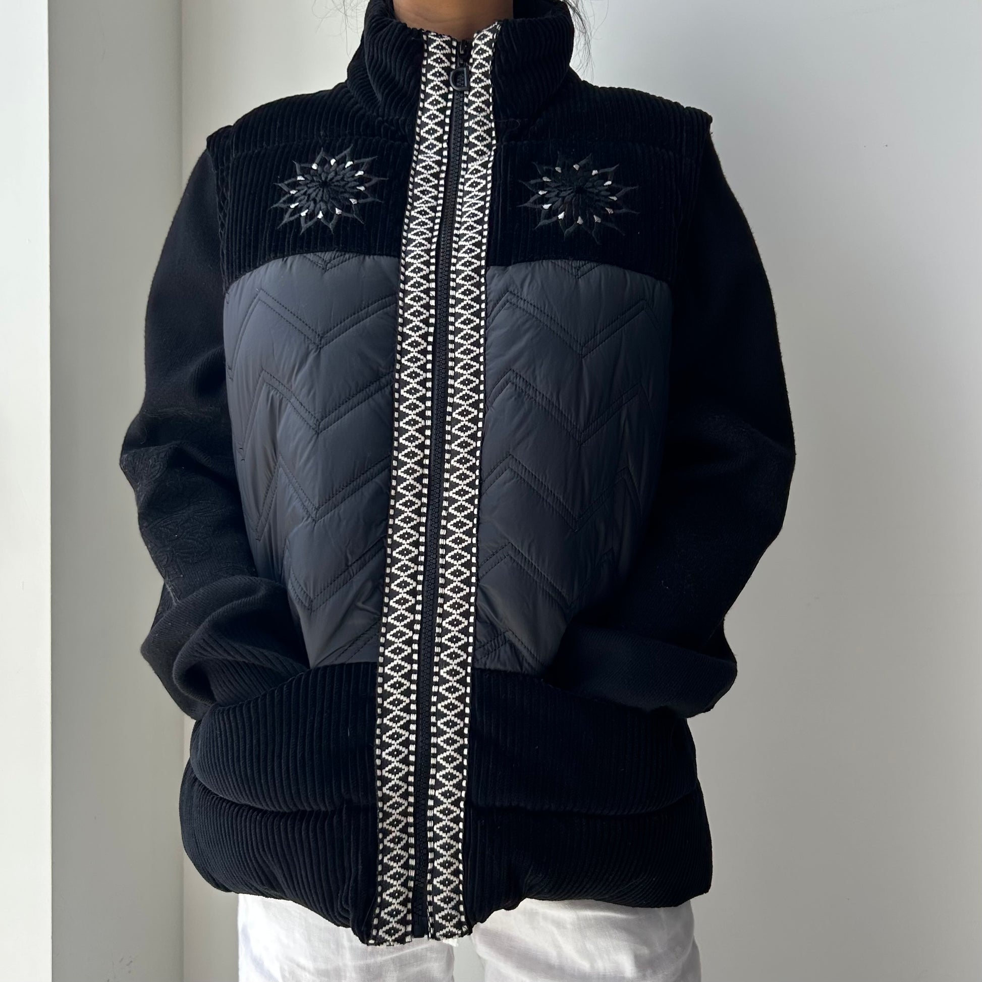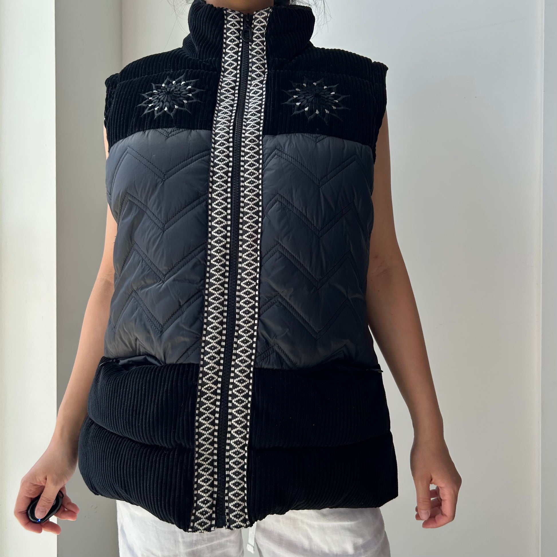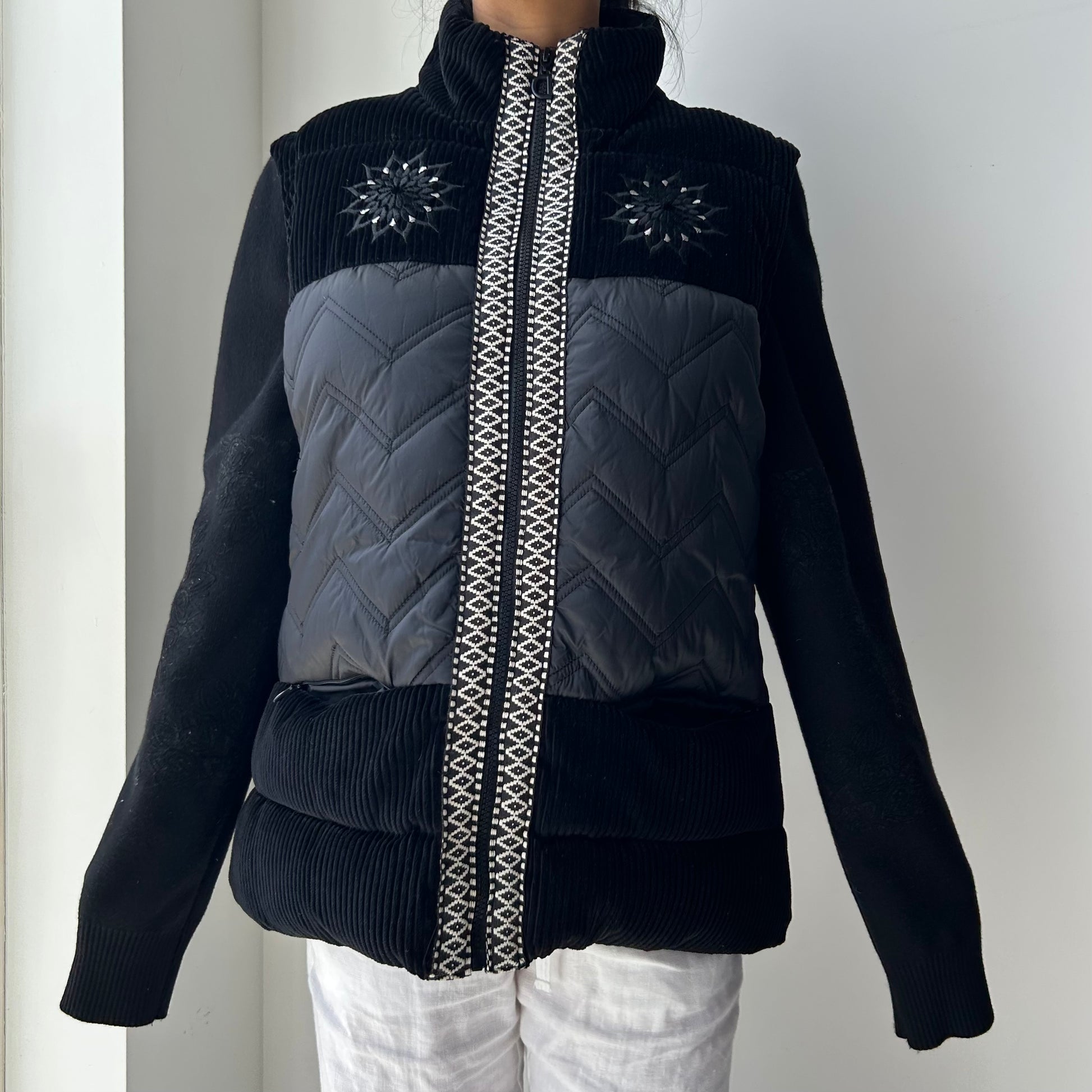 - Details: Mixed-media construction with quilted nylon, knit sleeves, and corduroy panels; zip closure with contrast jacquard trim; embroidered sunburst detailing at chest; stand collar; detachable long sleeves for vest-style wear; two front welt zipper pockets; from 2020