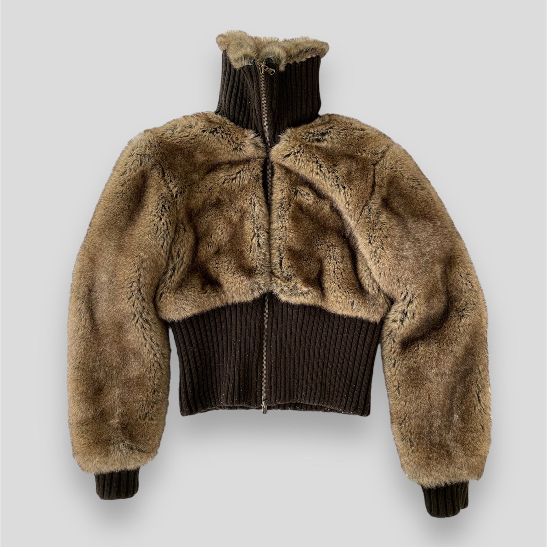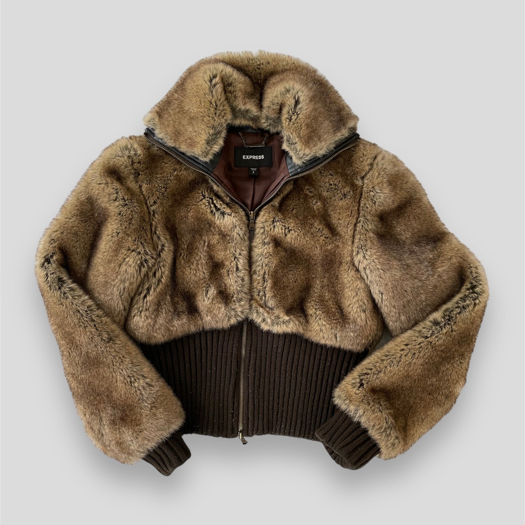 - Details: Brown faux fur double zip jacket; ribbed trim on the hem and sleeves