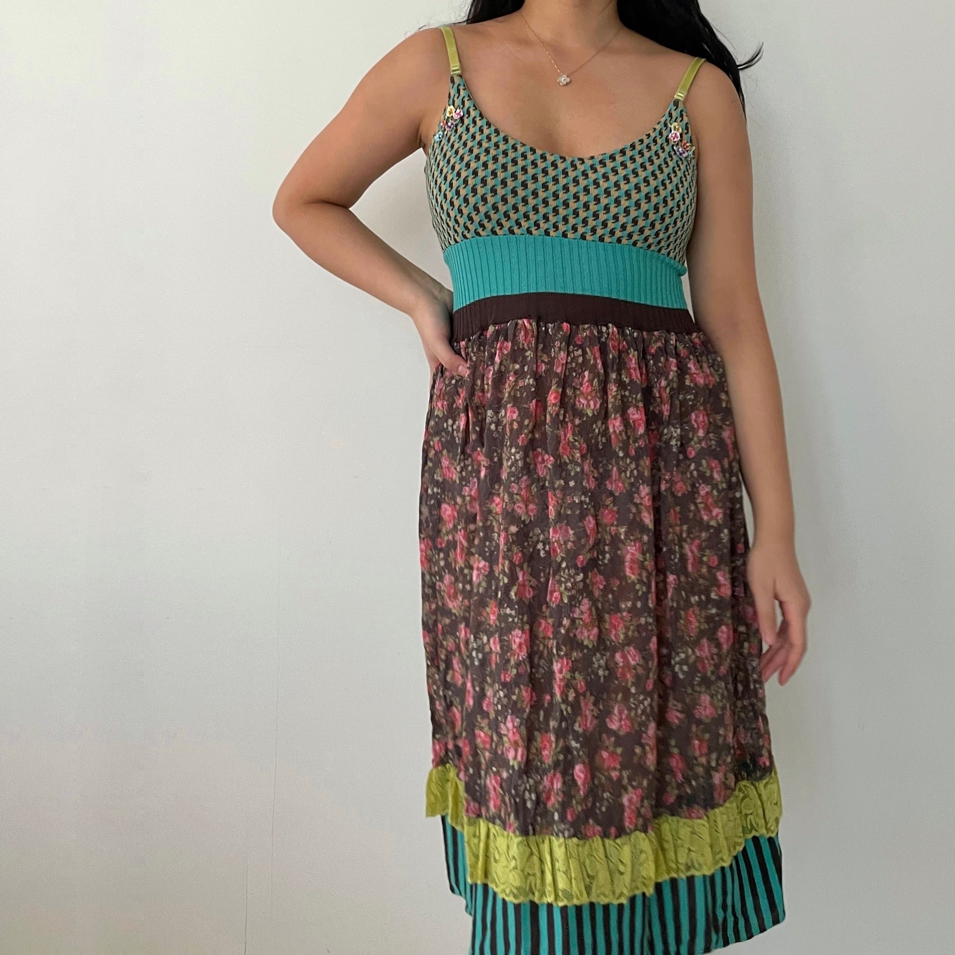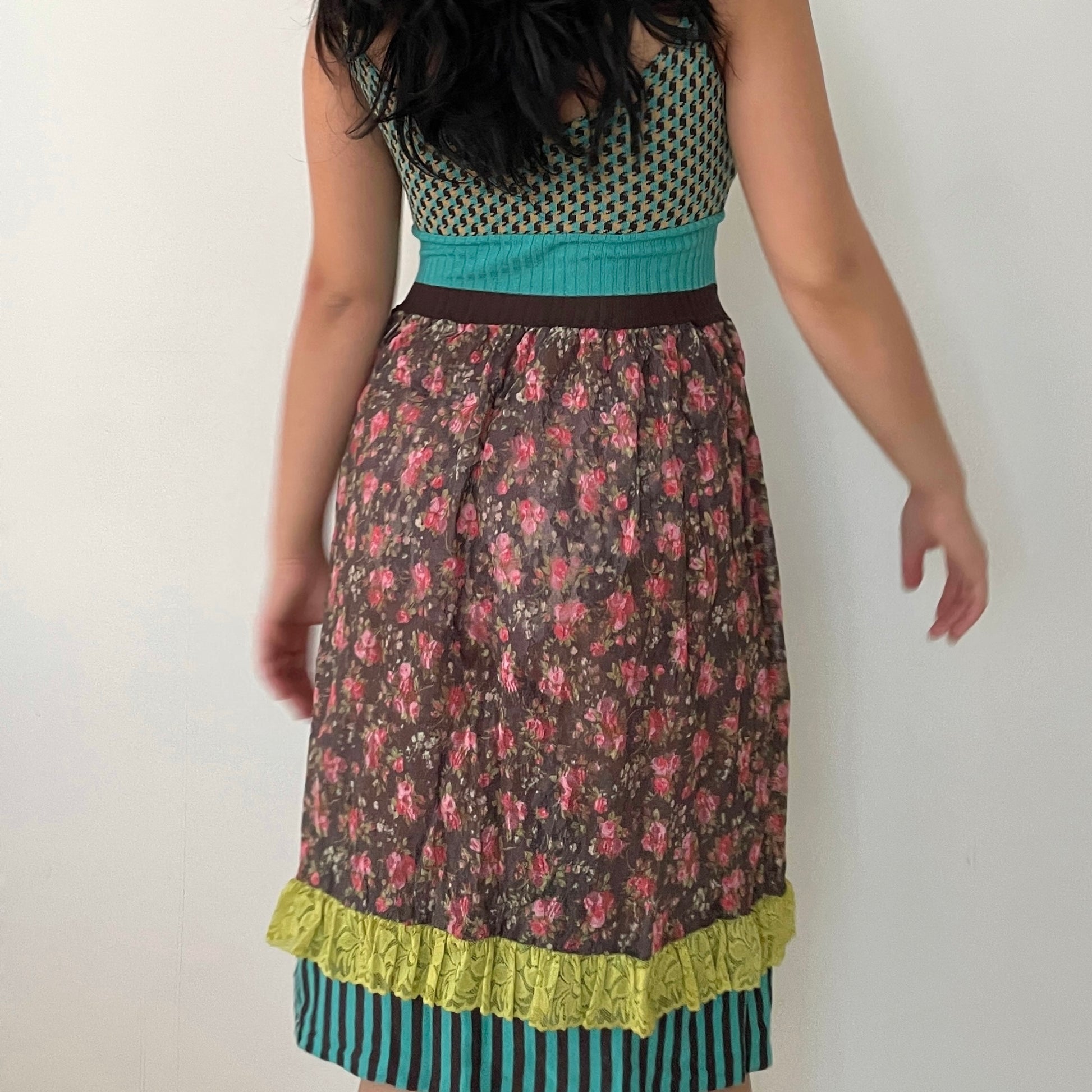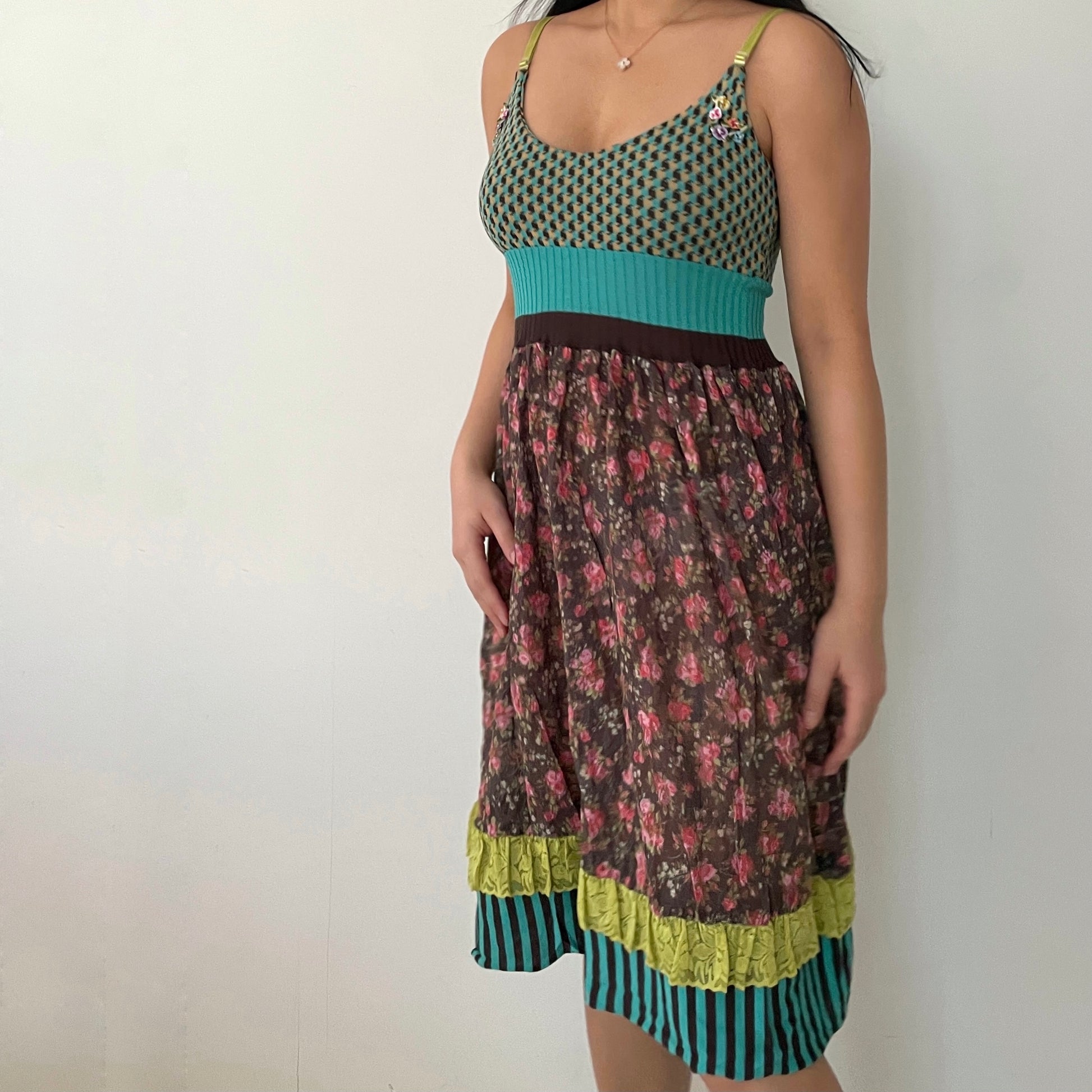 - Details: Blue, brown, and yellow houndstooth knit print on the bodice; sheer brown and pink floral lace on the skirt; turquoise and brown stripes; lime green lace layer on the skirt; floral embroidery near the straps; adjustable lime green straps; stretchy material
