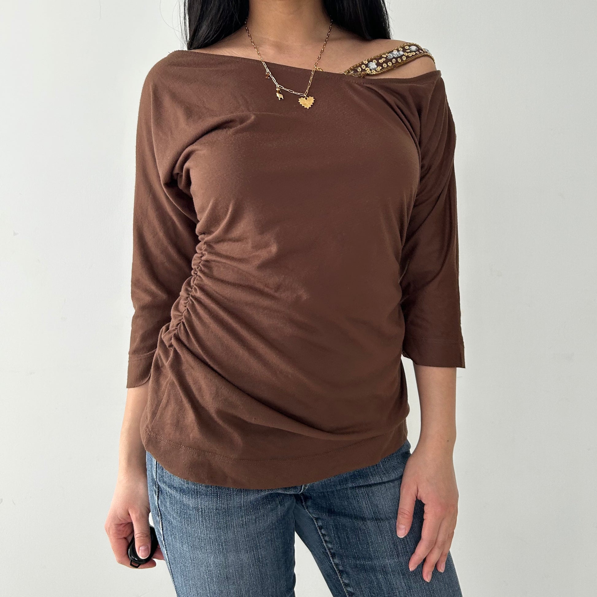 - Details: Long-sleeve stretch jersey top in brown; asymmetric off-shoulder neckline with embellished strap detail; ruched side seams; slim fit