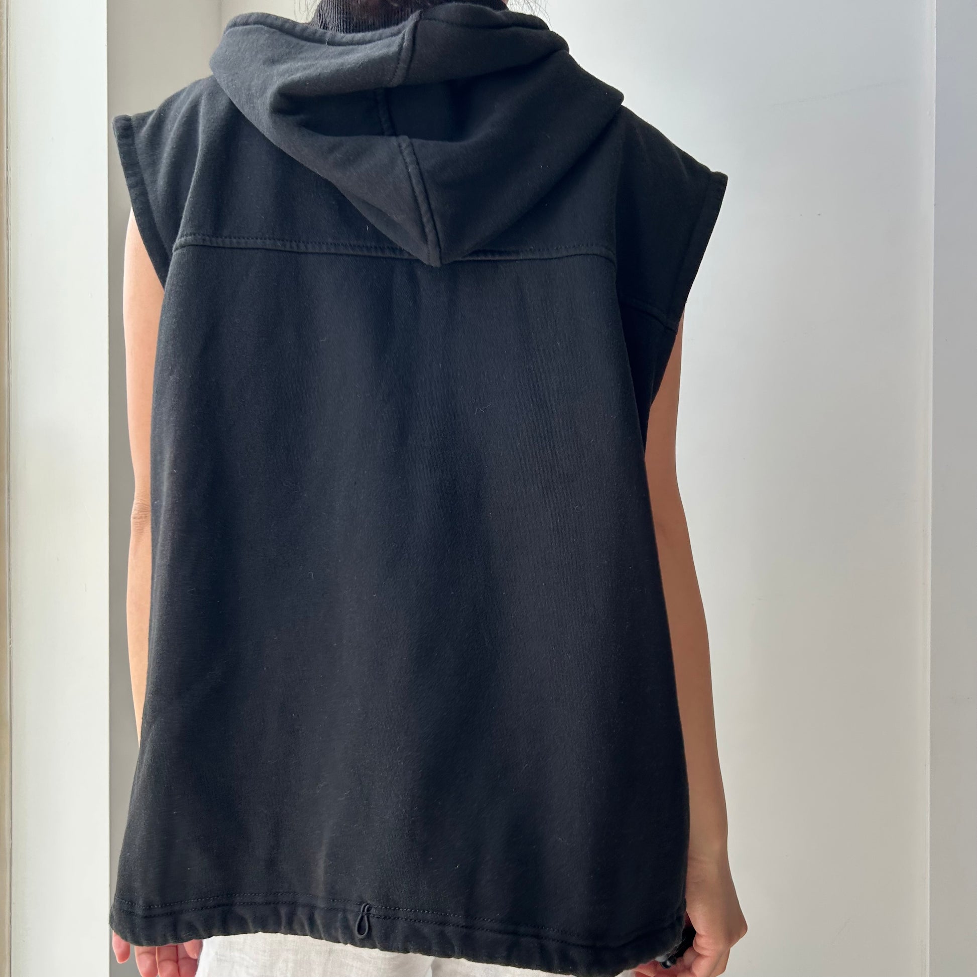 - Details: Heavyweight cotton fleece hoodie; sleeveless; welt pockets; zip closure; orange printed logo at left chest; adjustable hem with drawcord
