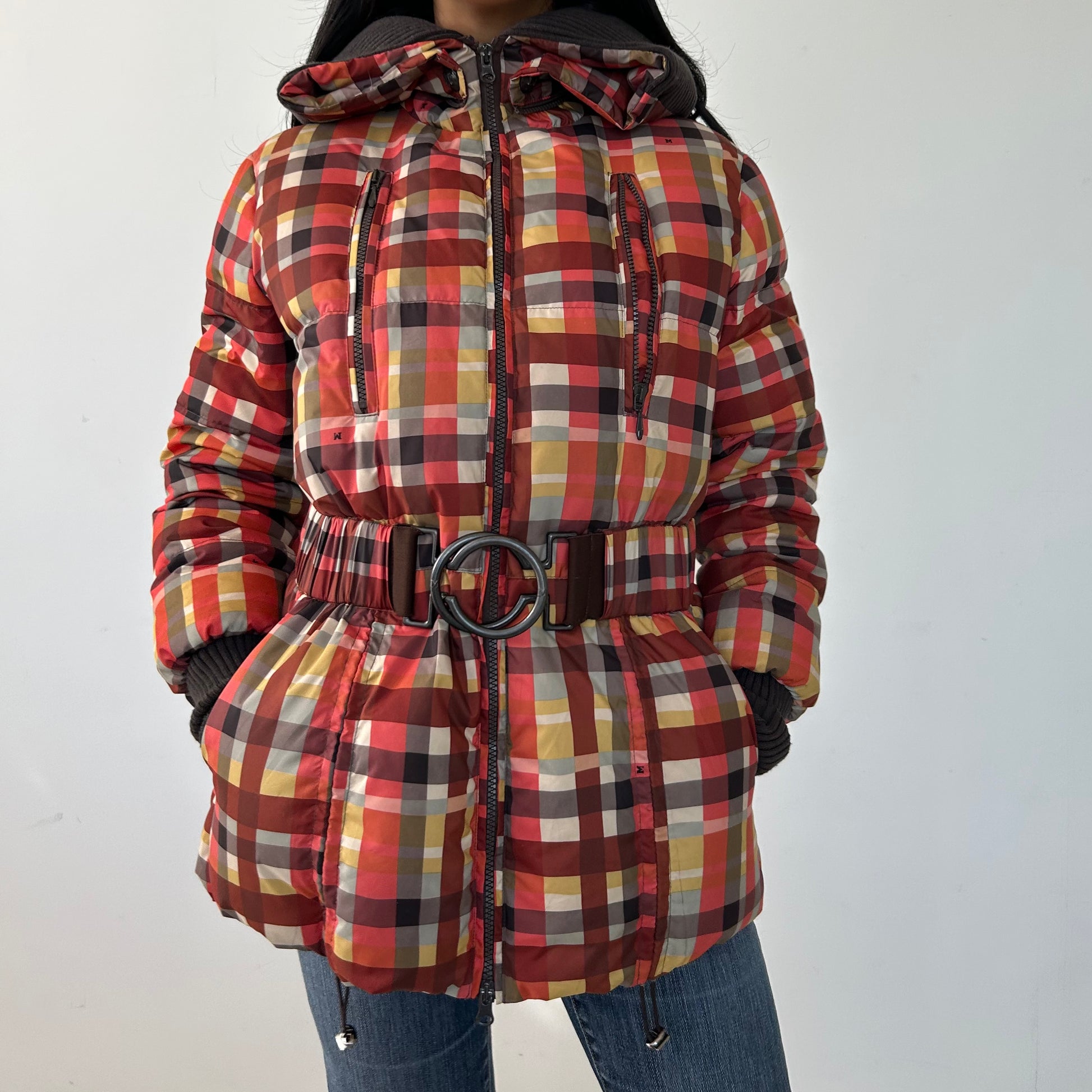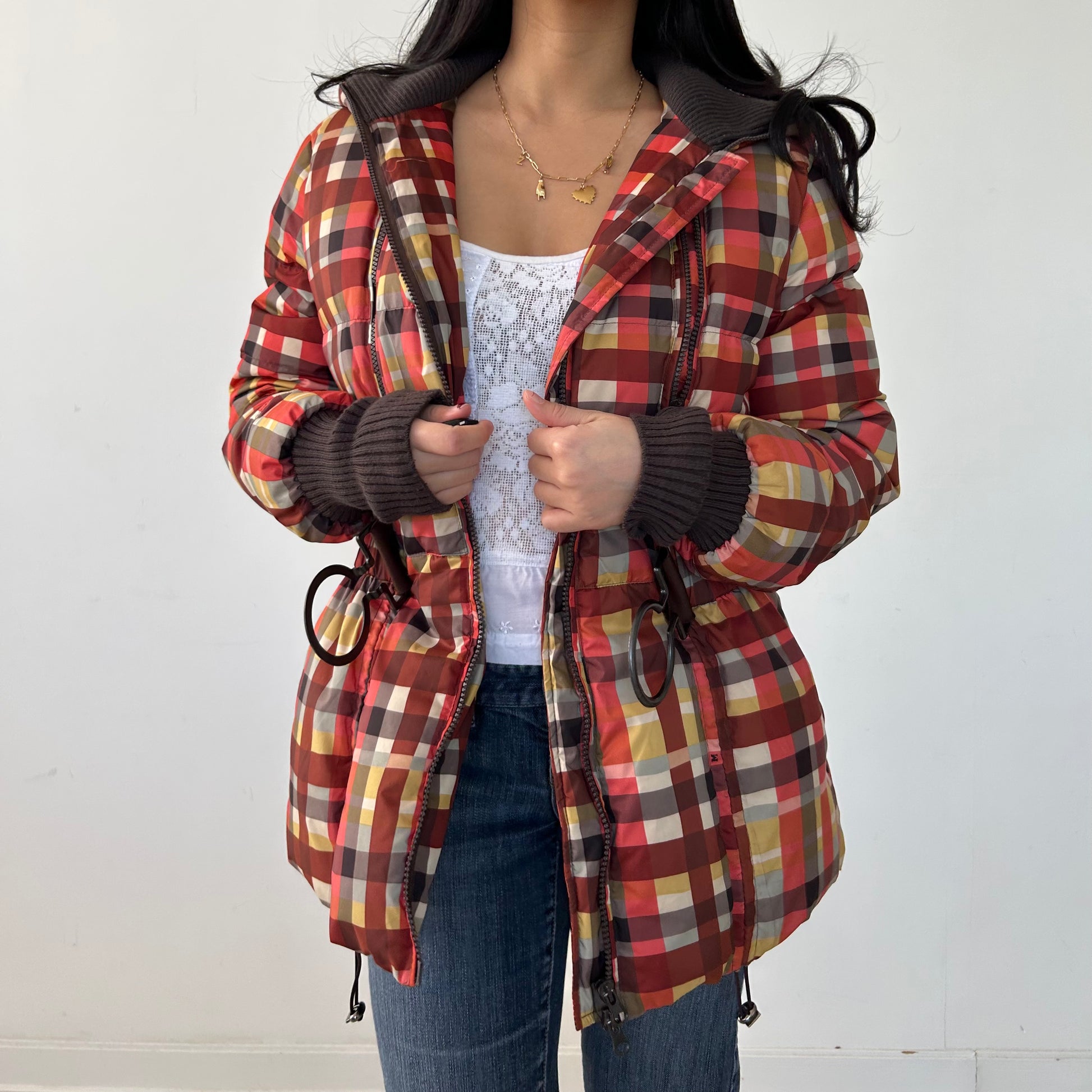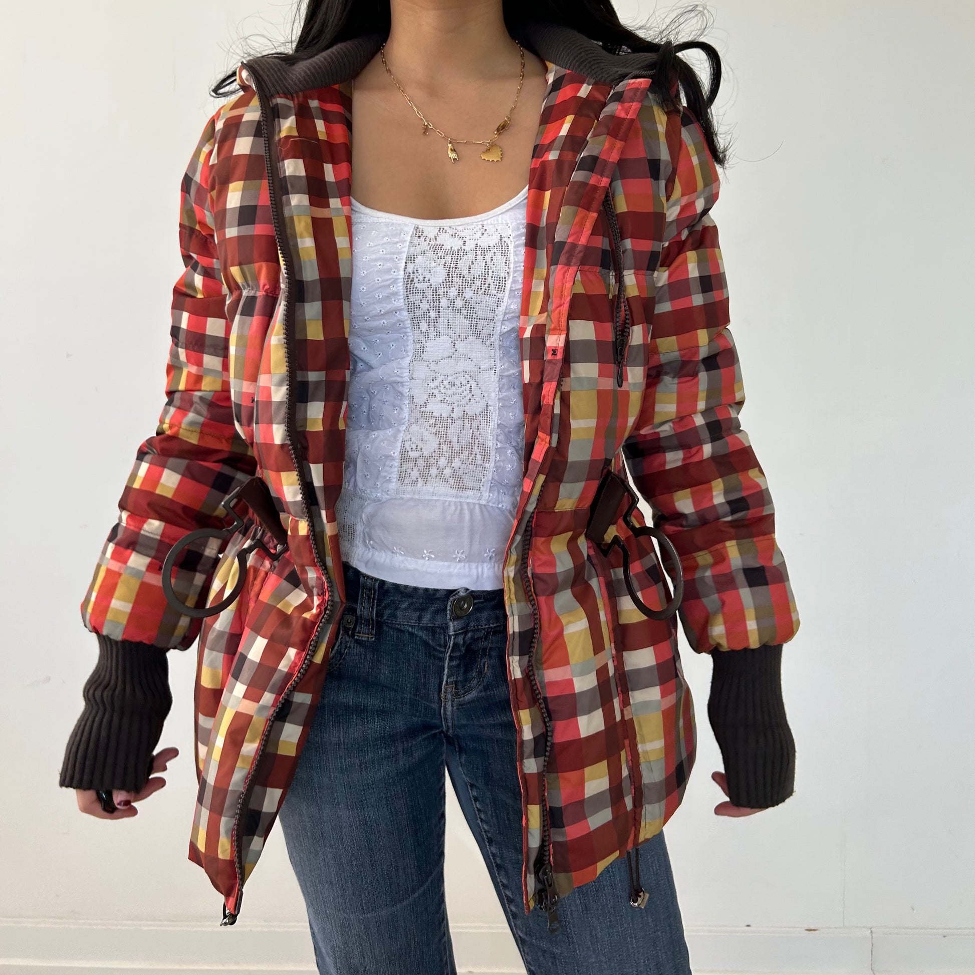 - Details: Long sleeve quilted puffer jacket in a multicolour plaid pattern; high funnel neckline with a convertible zipper hood and ribbed knit trim; elastic waistband with built in buckle; front-zip closure; dual zippered pockets; fully lined; drawstring hem for a customisable fit