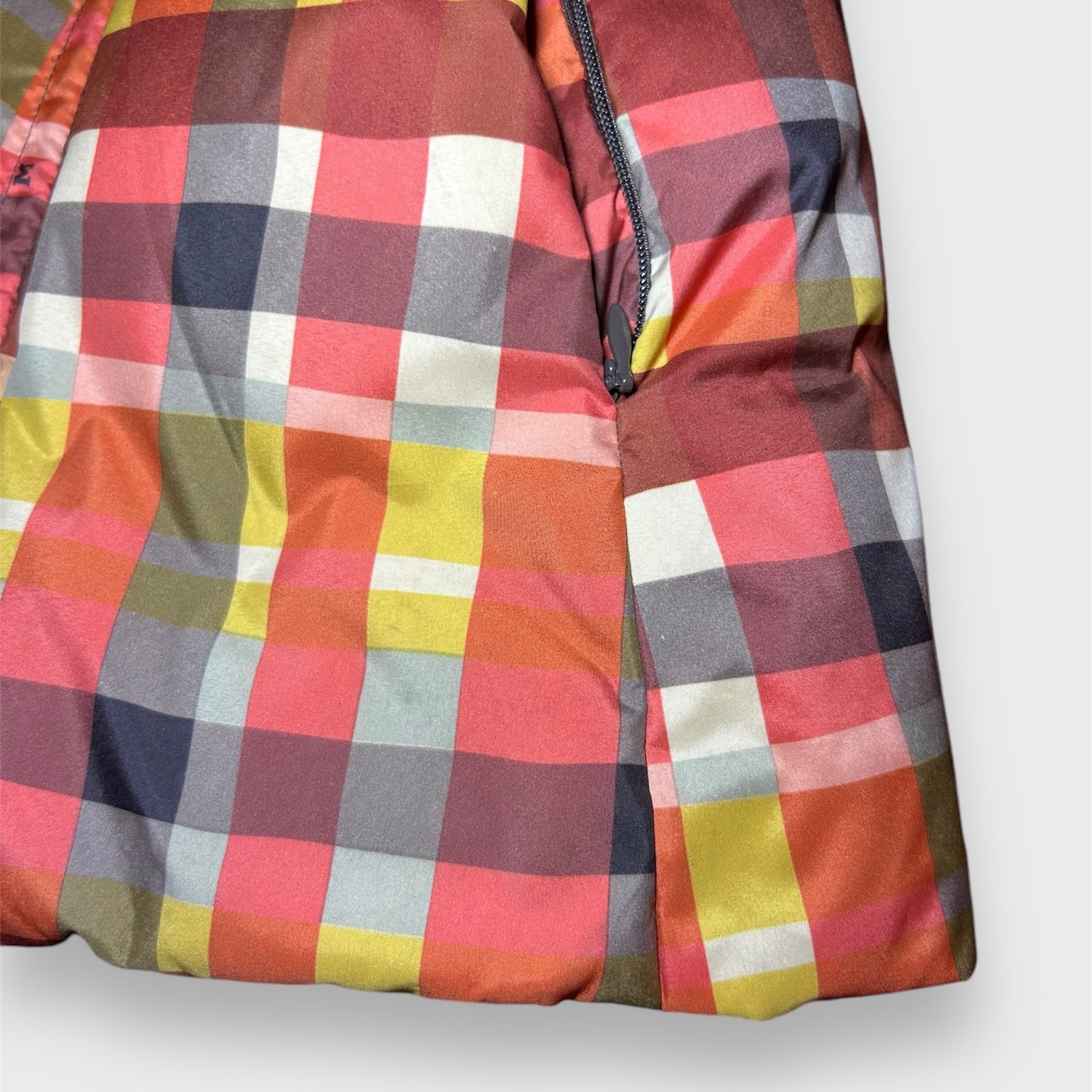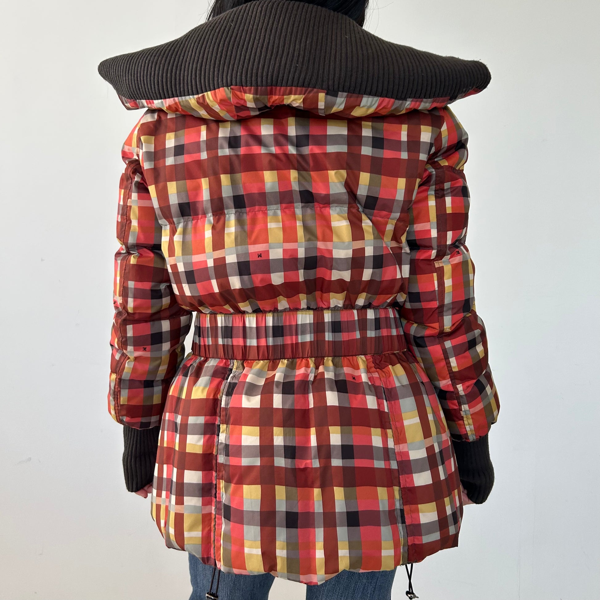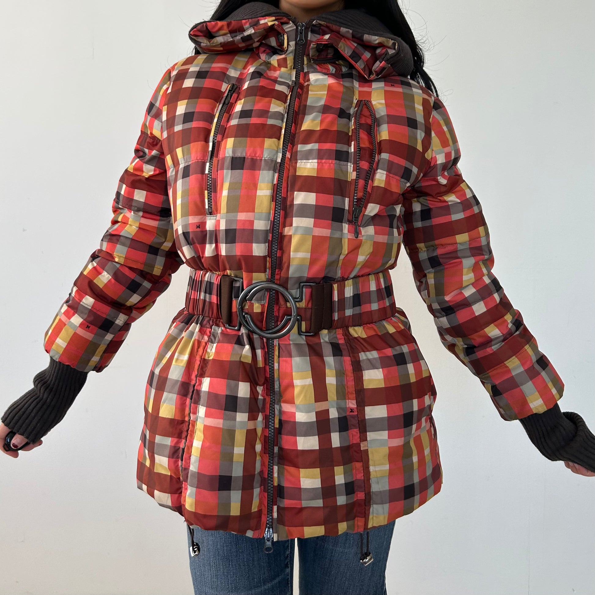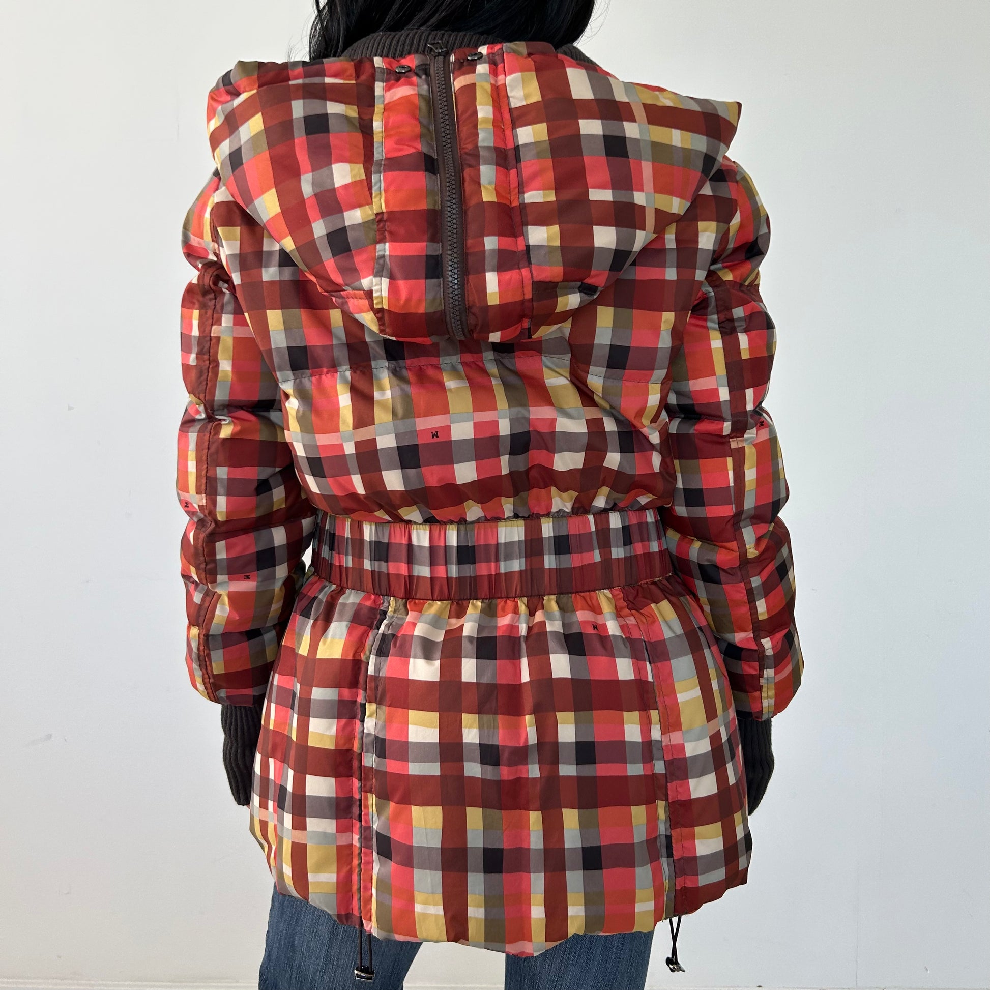 - Details: Long sleeve quilted puffer jacket in a multicolour plaid pattern; high funnel neckline with a convertible zipper hood and ribbed knit trim; elastic waistband with built in buckle; front-zip closure; dual zippered pockets; fully lined; drawstring hem for a customisable fit