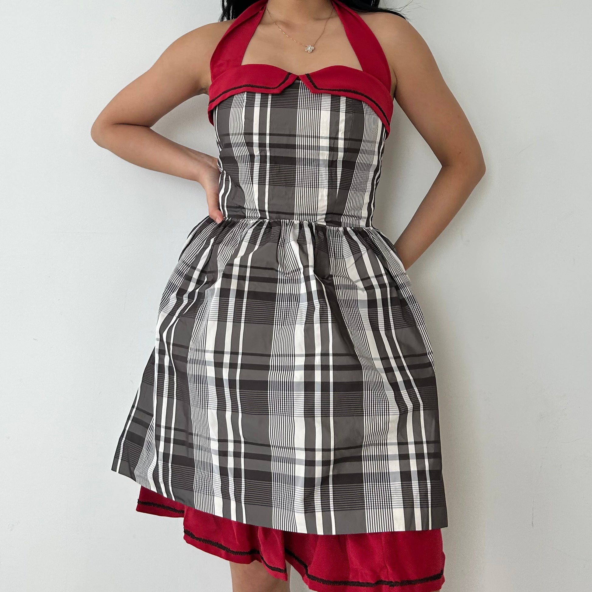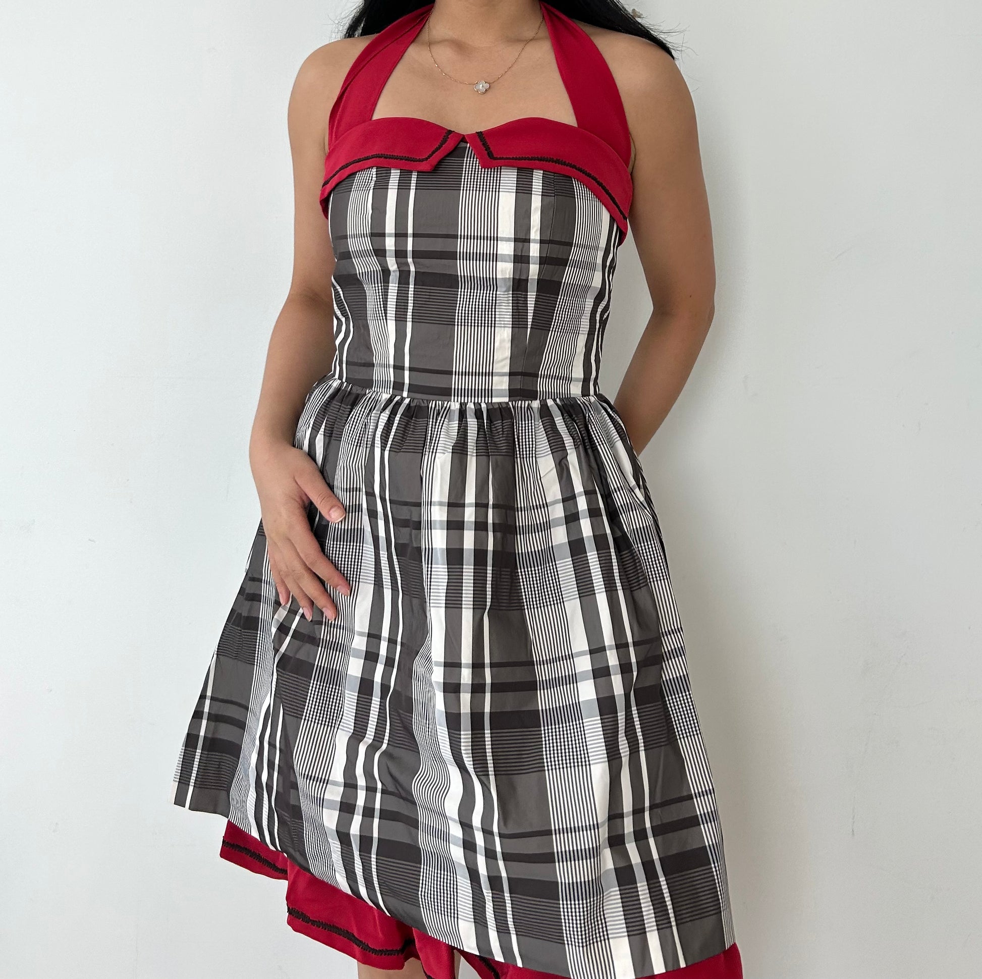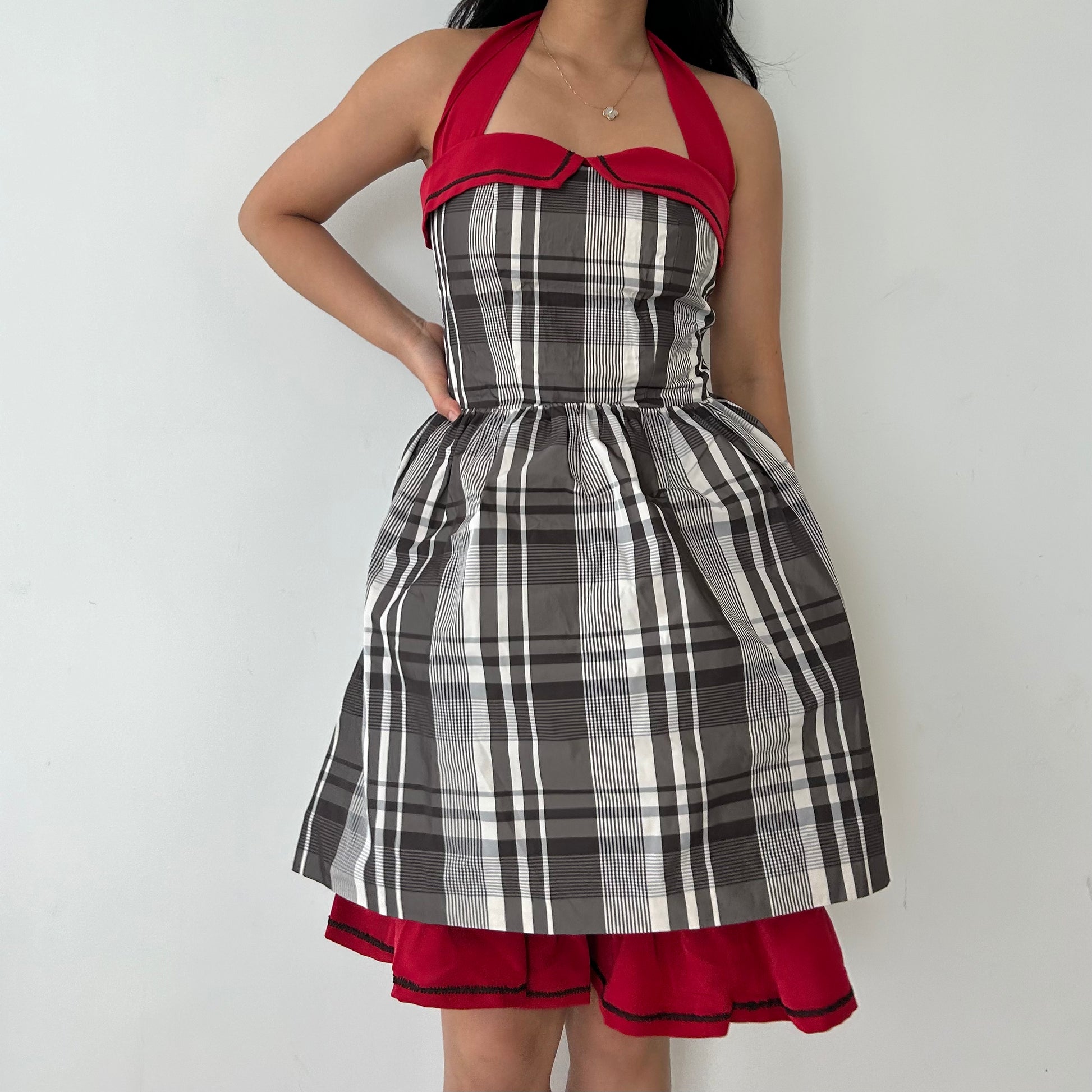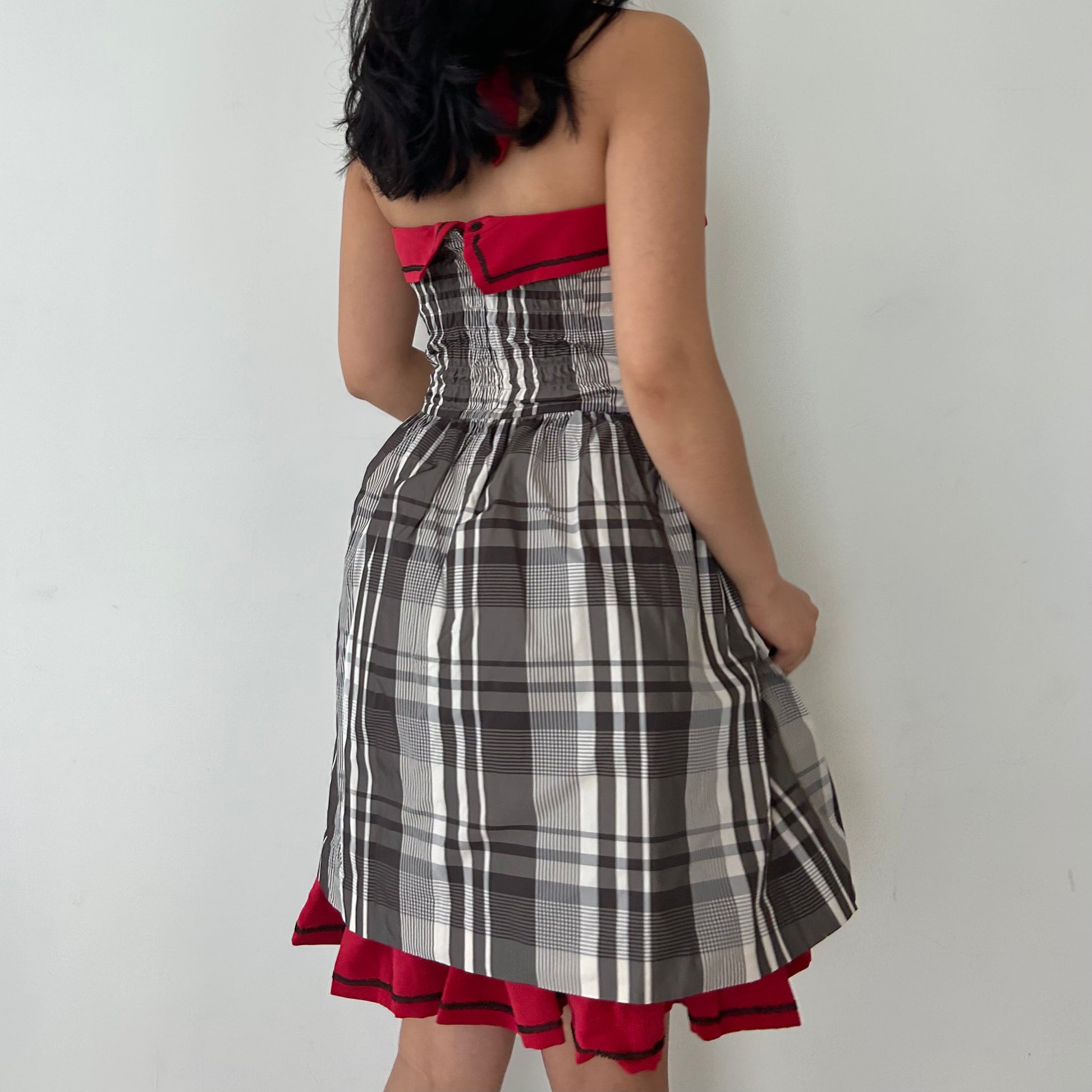 - Details: Double lined; detachable tulle underskirt with elastic waistband; halter tie neck; concealed back zip; detachable red collar (can be worn as just a grey strapless dress)