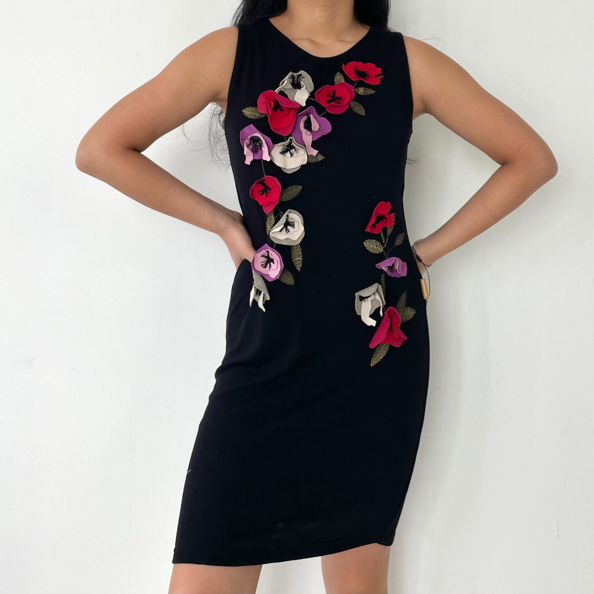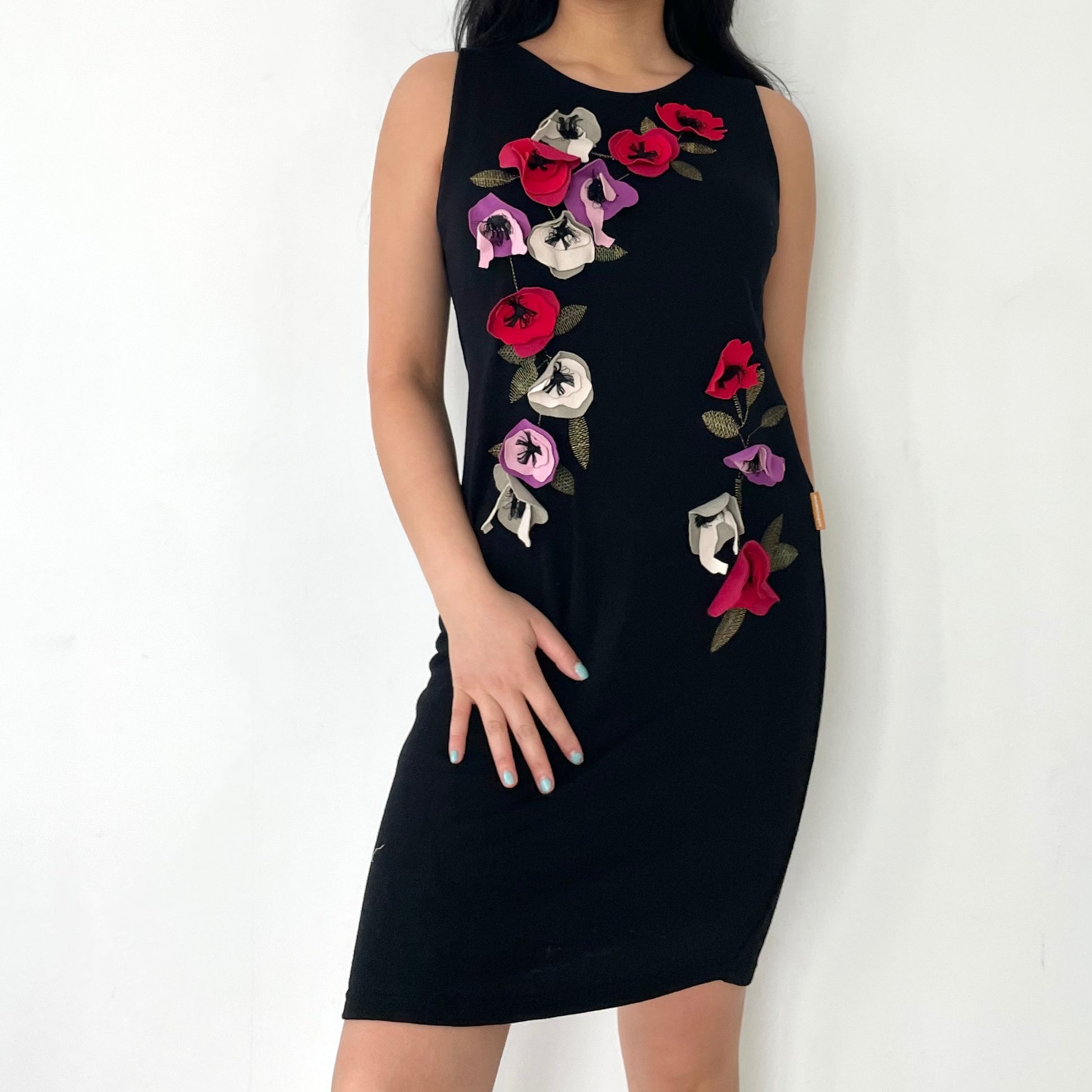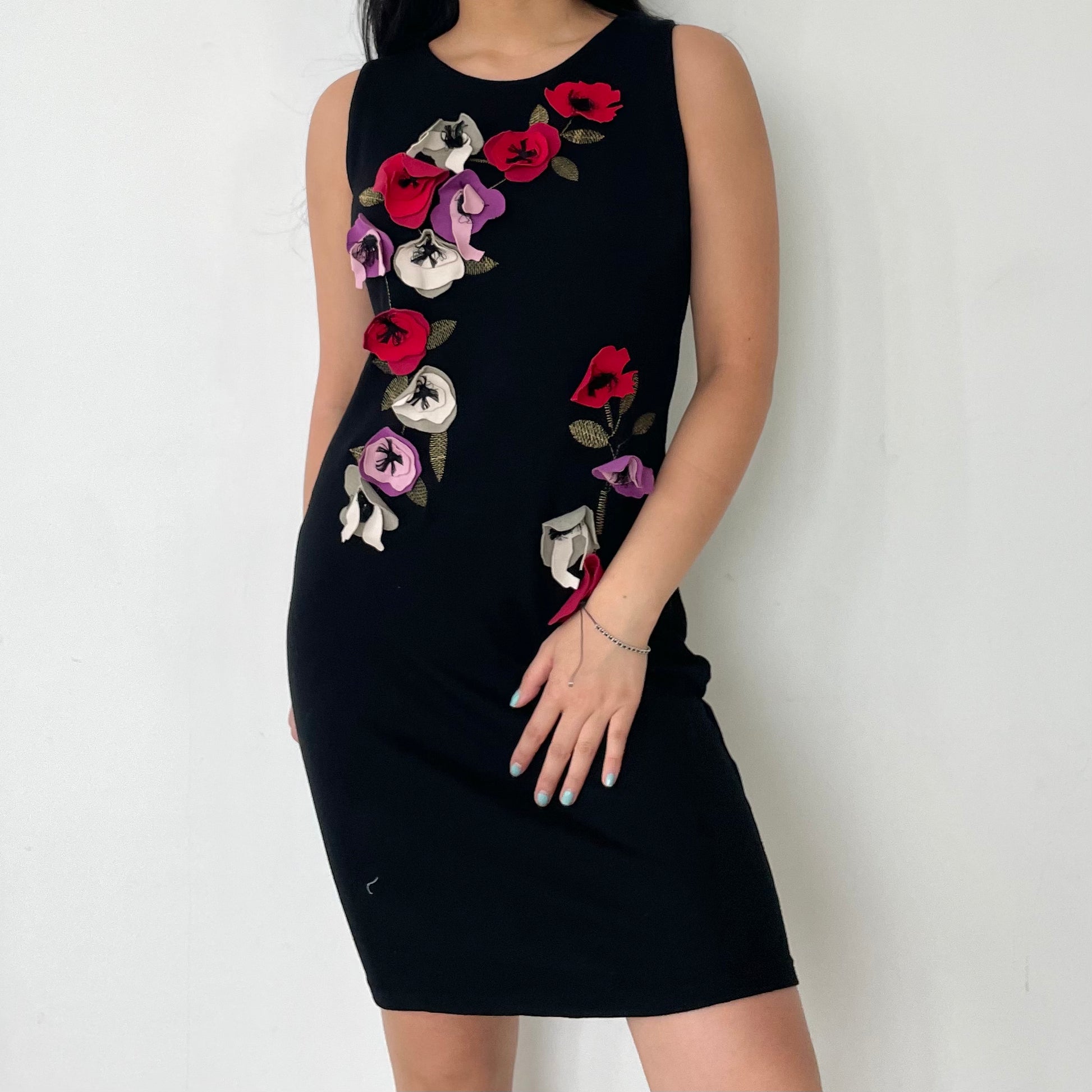 - Details: Black sleeveless dress; 3D floral fabric details; red, purple, and white poppies; bust is double lined