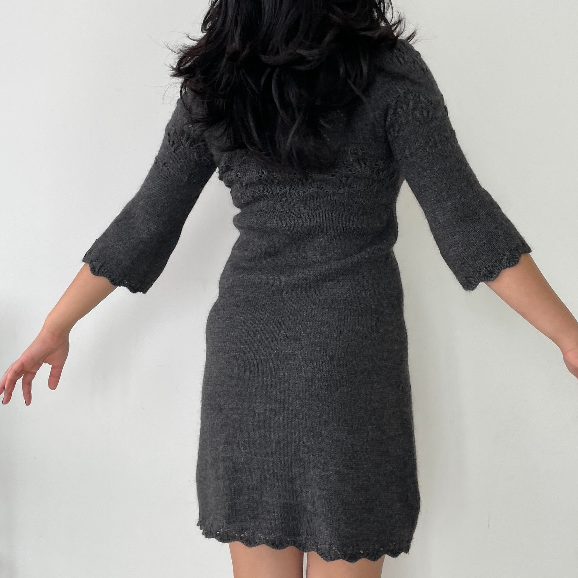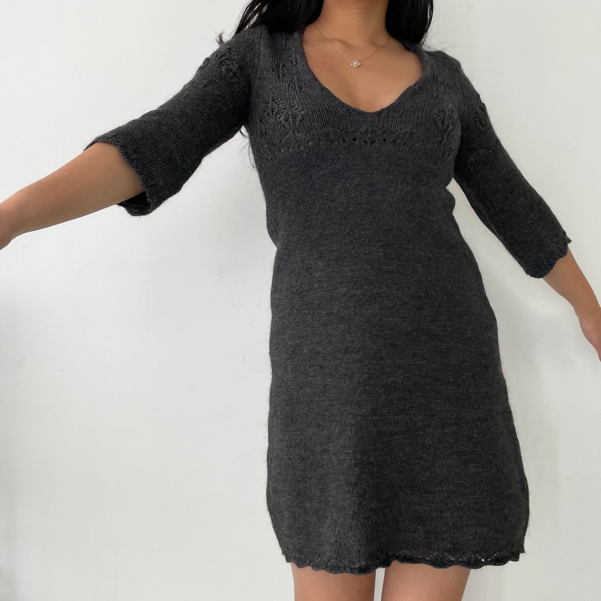 - Details: Grey v-neck mini dress; three-quarter bell sleeves; wraparound crochet knit pattern on the bust and sleeves