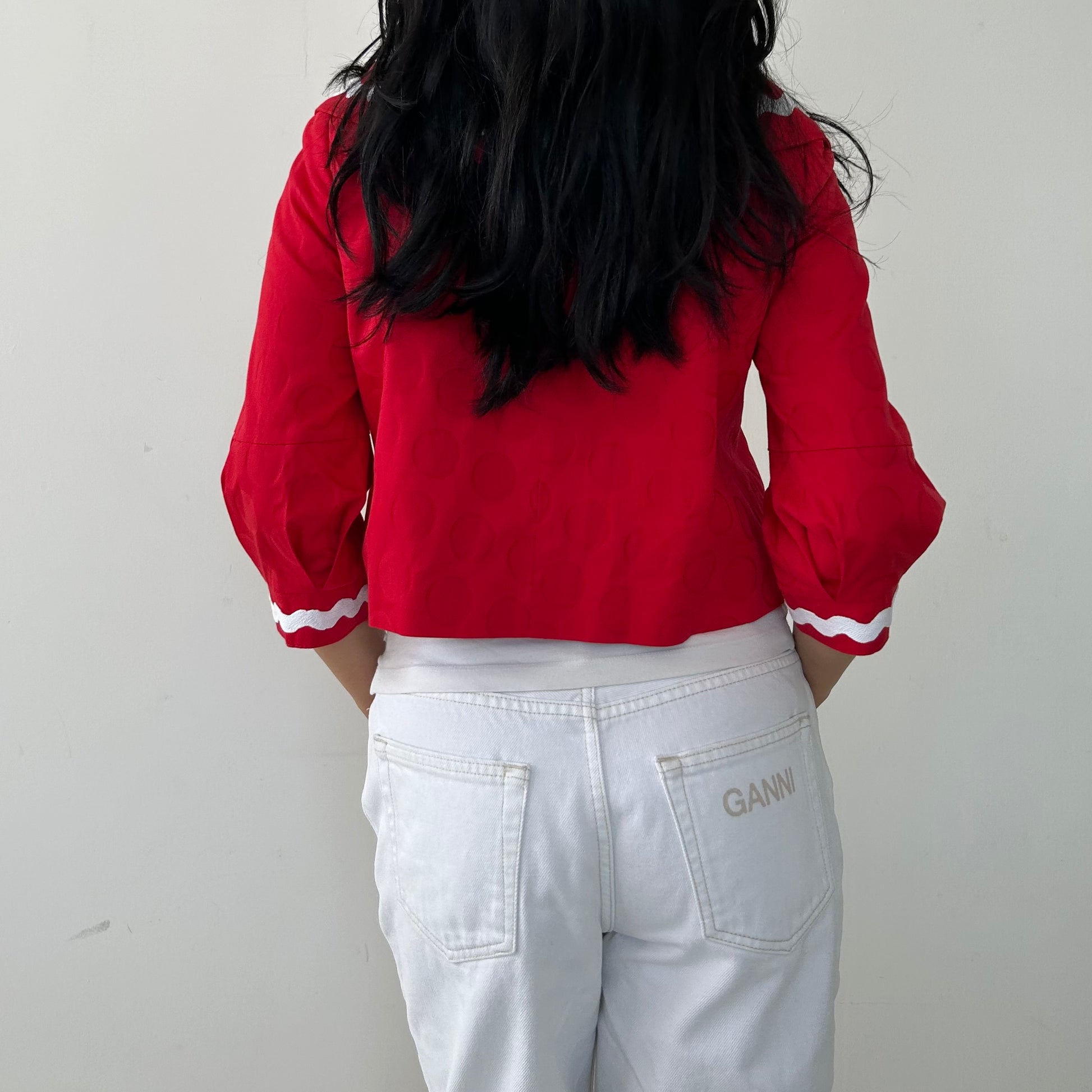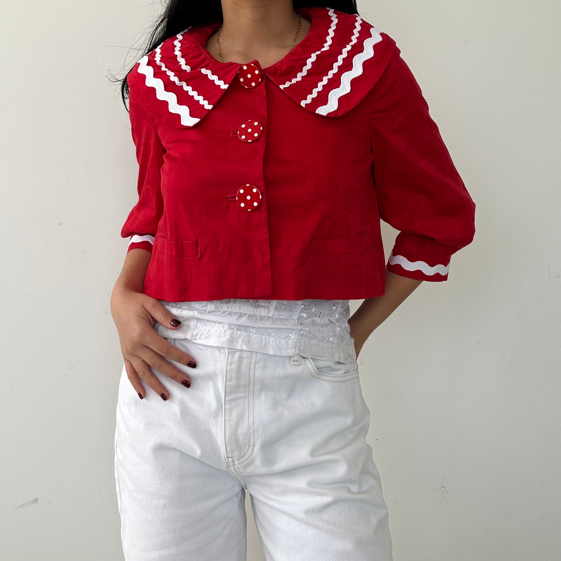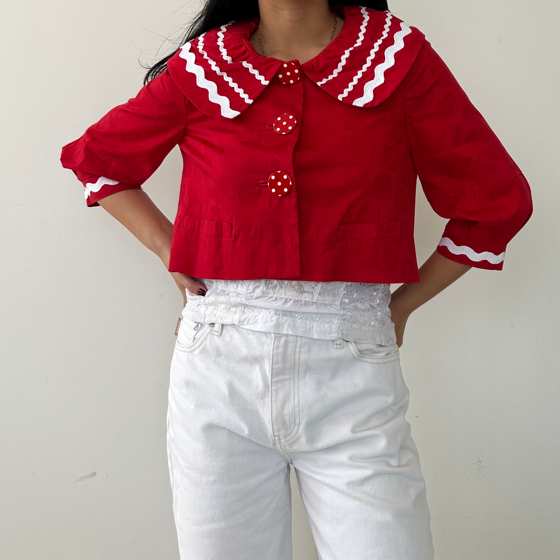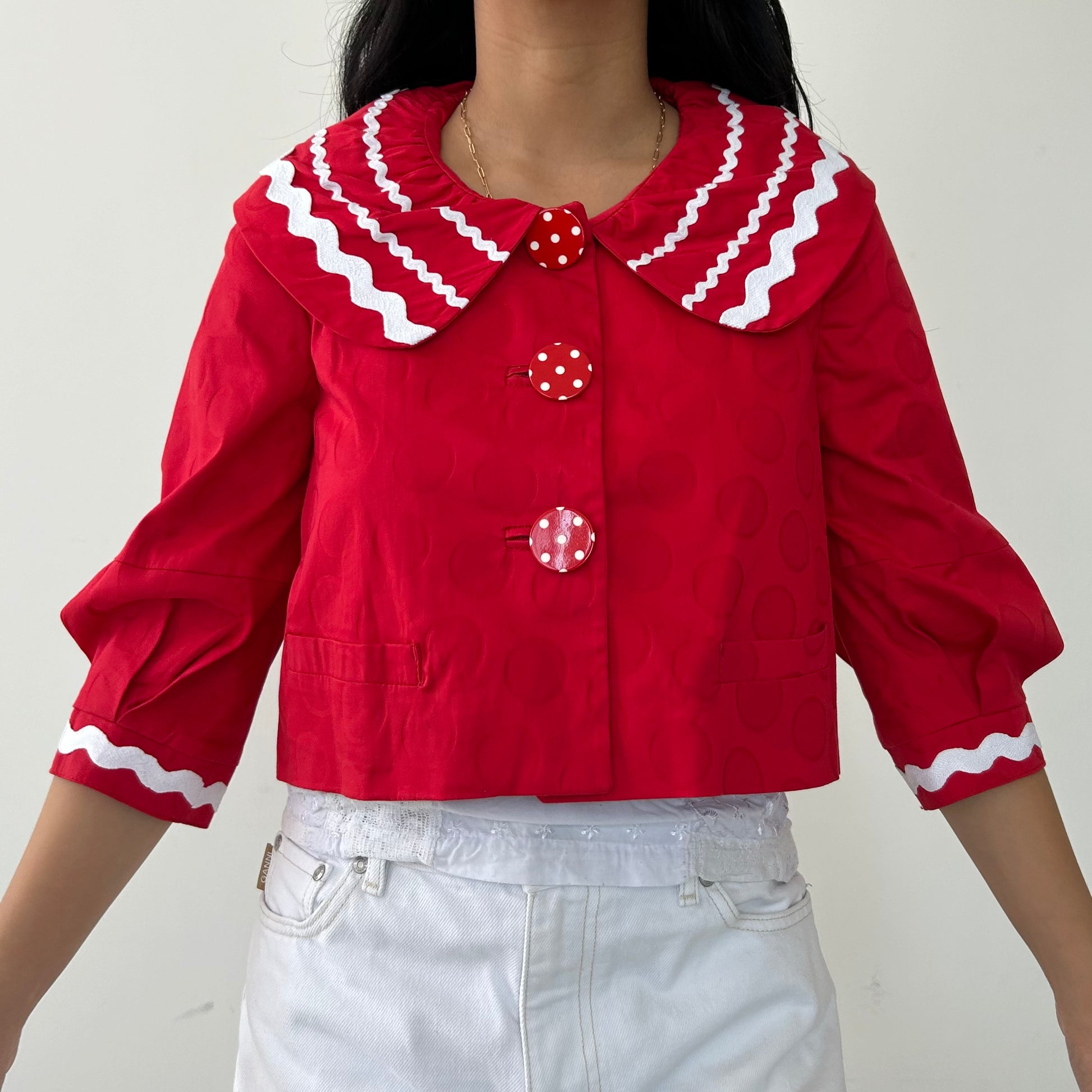 Details: Red cropped jacket featuring peter pan collar; red and white polka dot button closure; three-quarter sleeves with gathered detail; decorative white squiggly lines on the collar and sleeve