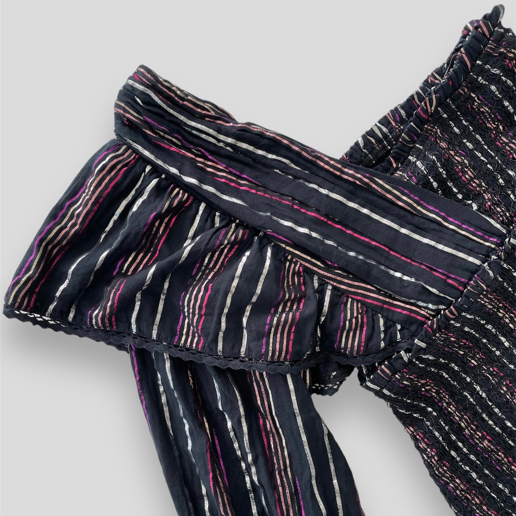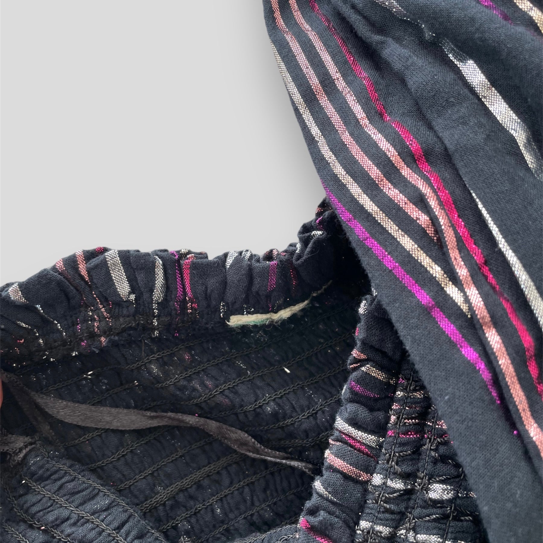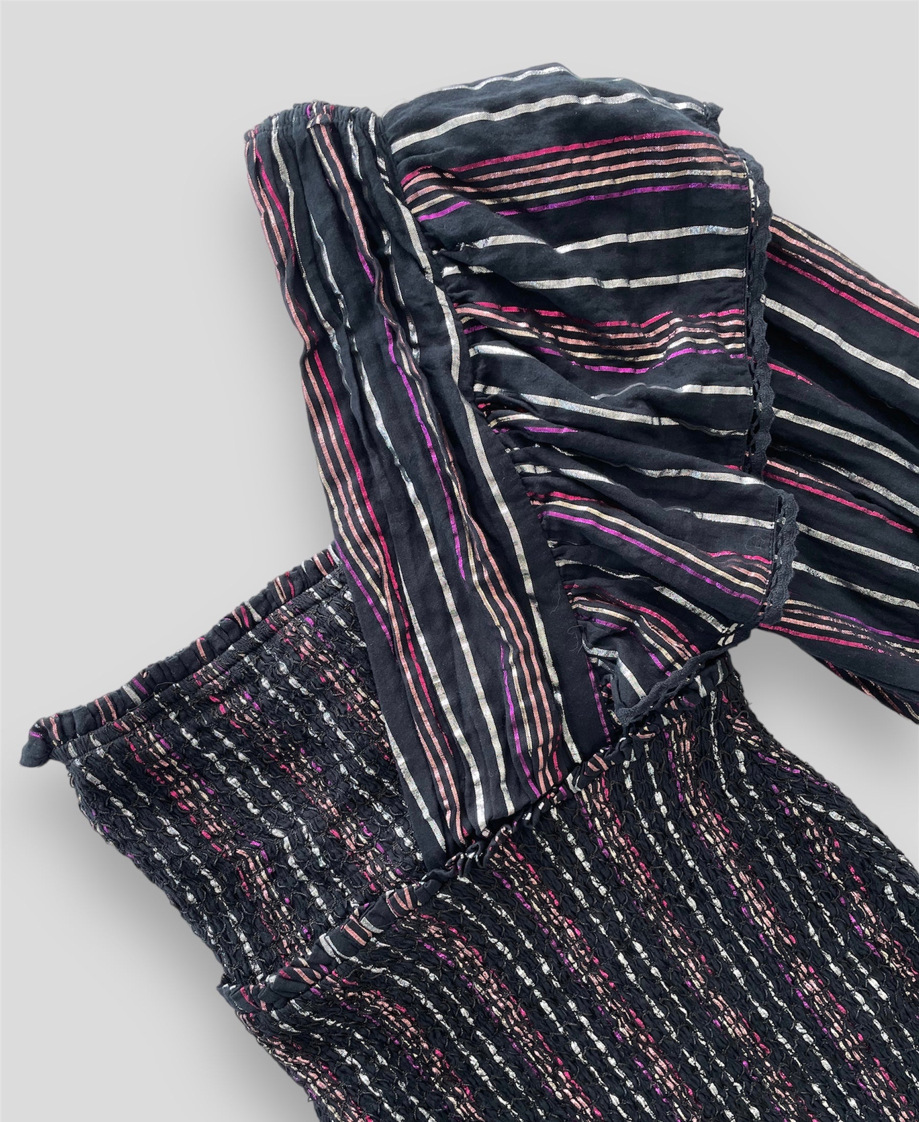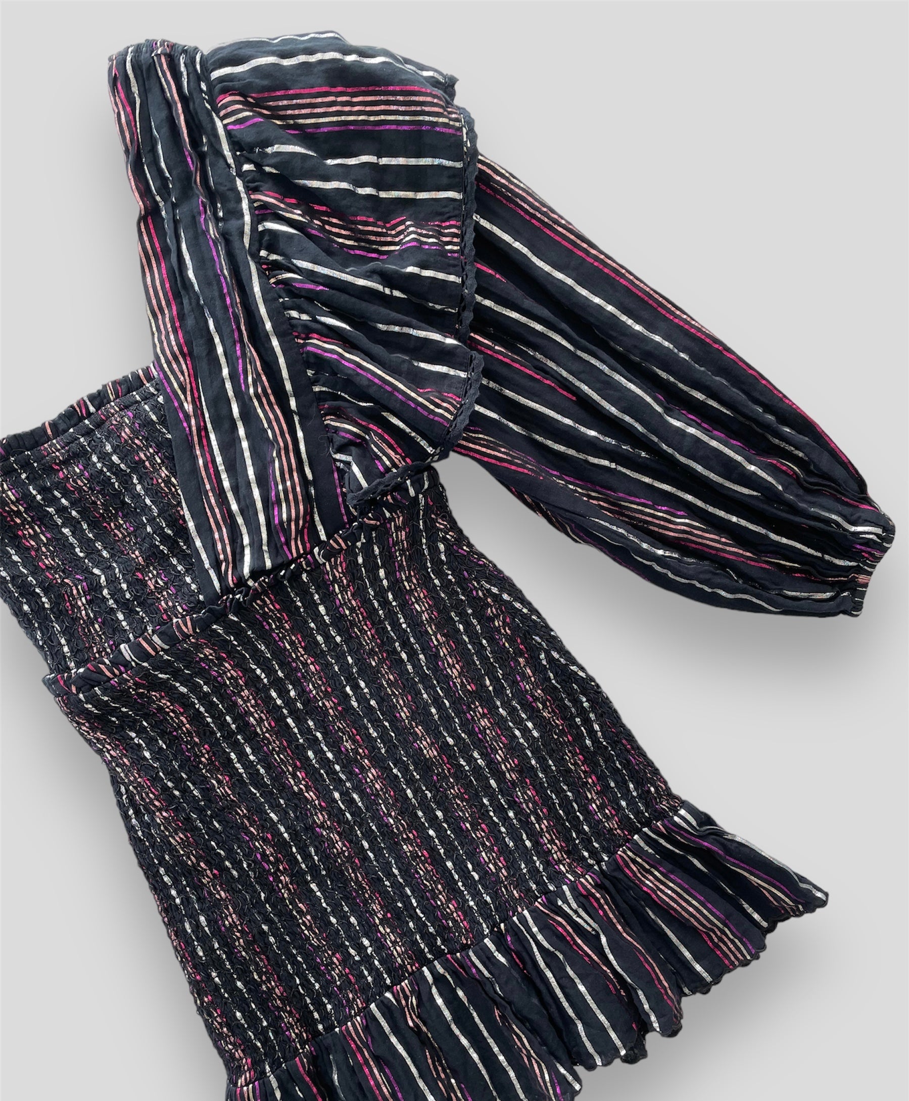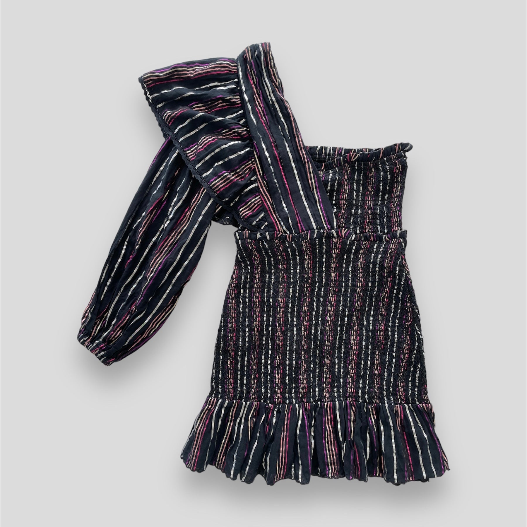 - Details: One shoulder long sleeve mini dress; shirred elasticated bodice; navy dress with pink, red, purple, and white metallic stripes