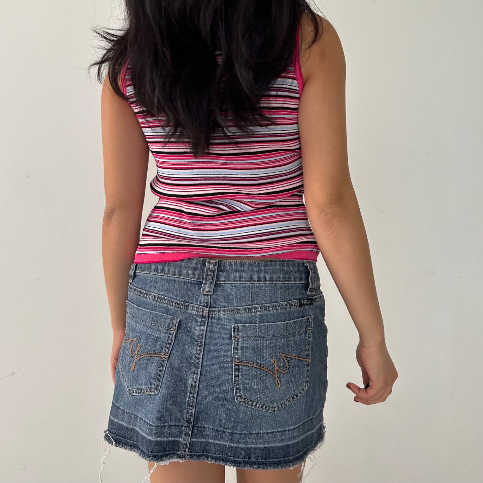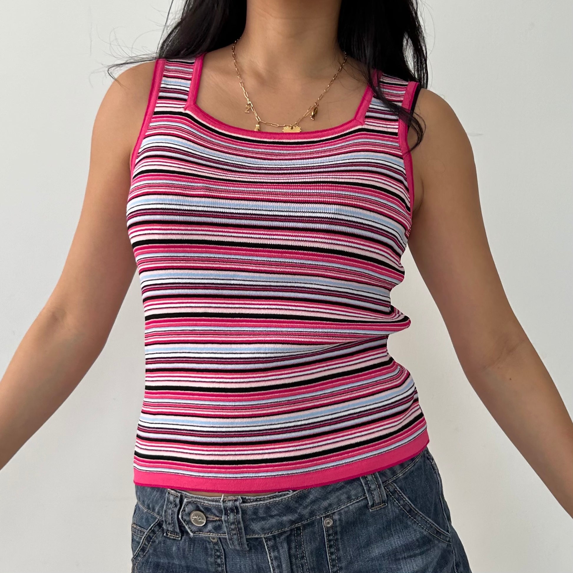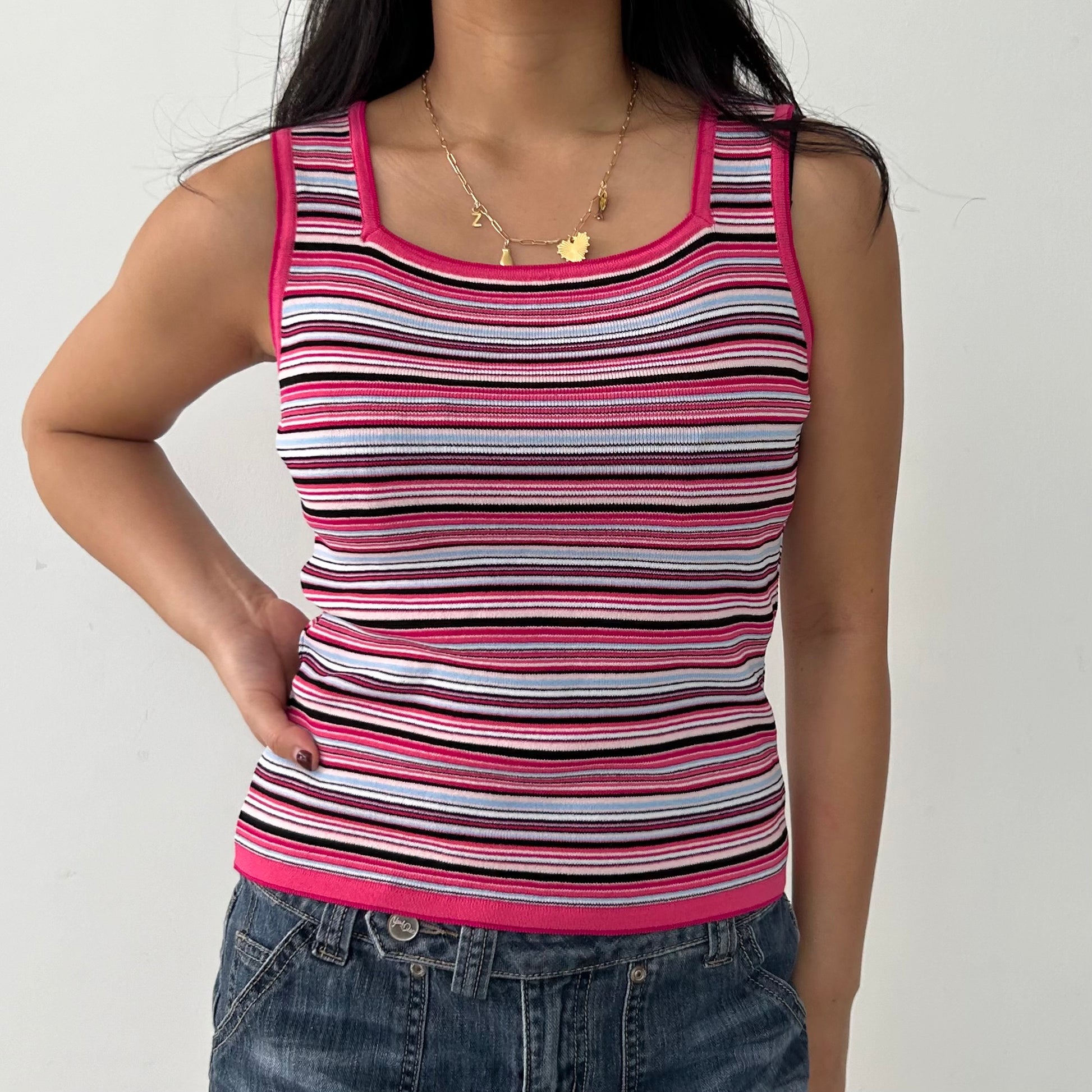 - Details: Pink, blue, white, and black striped square neck knit tank